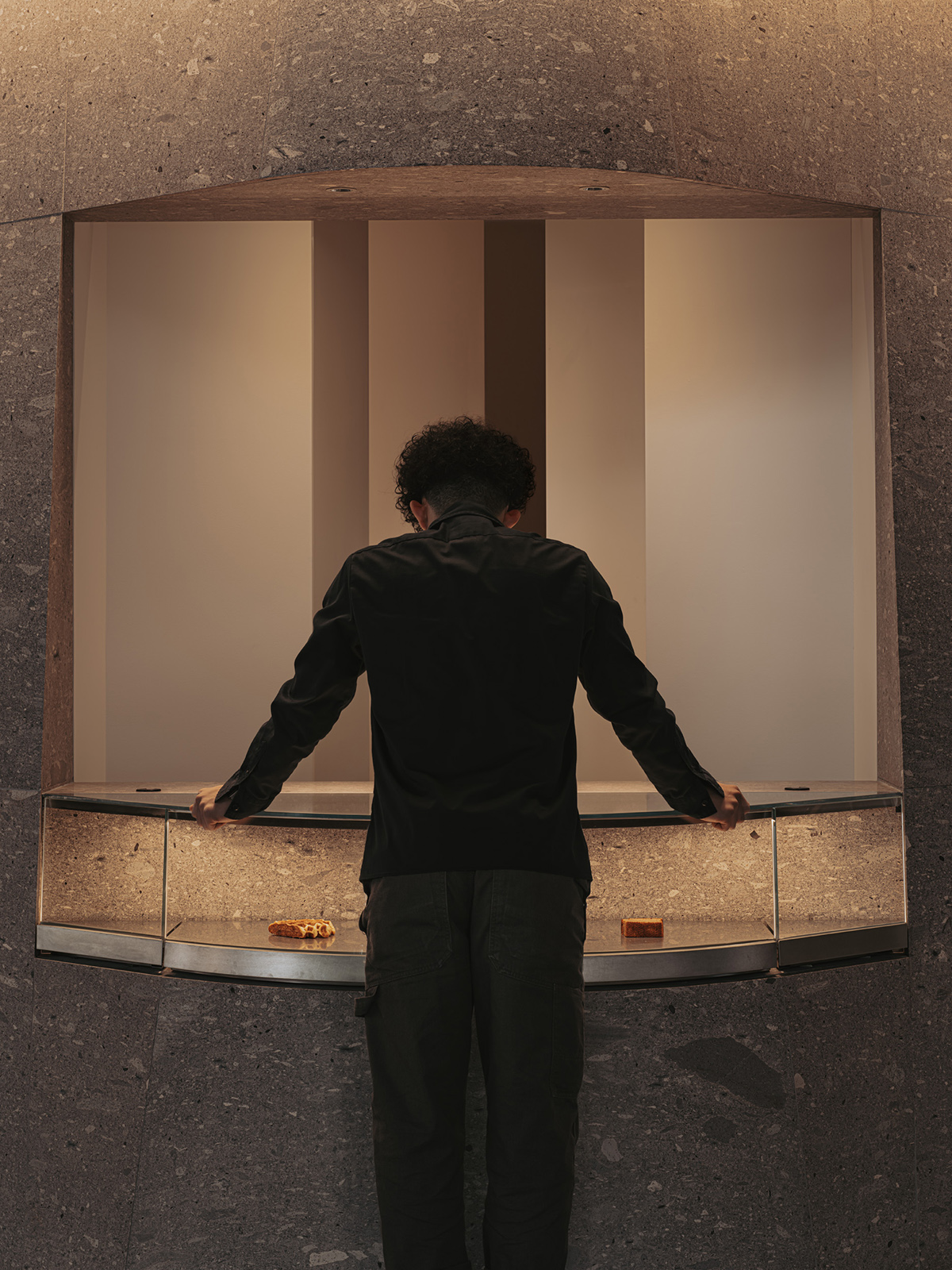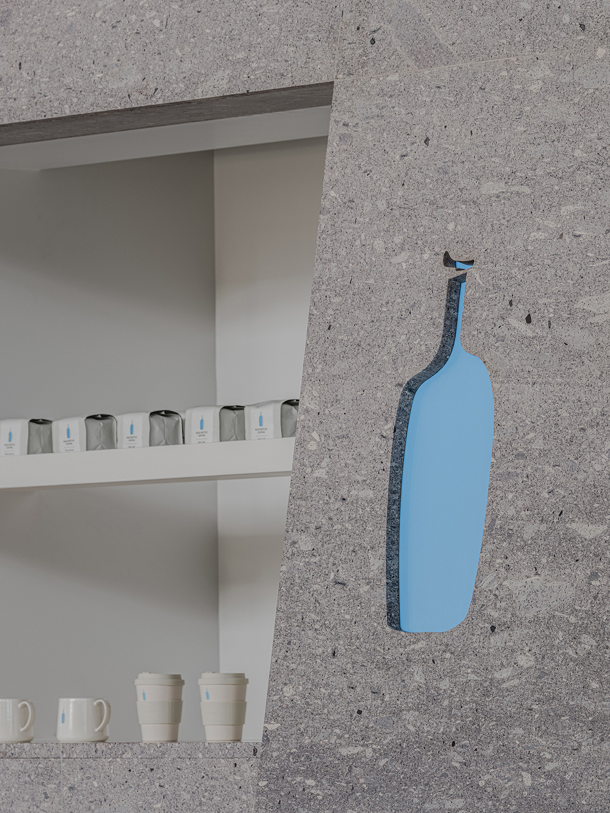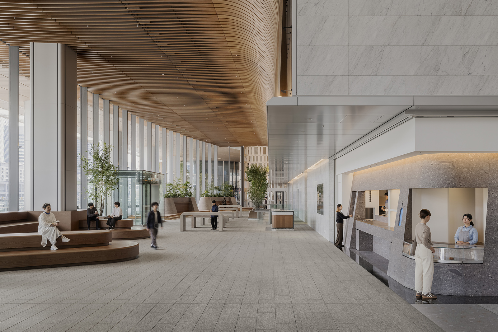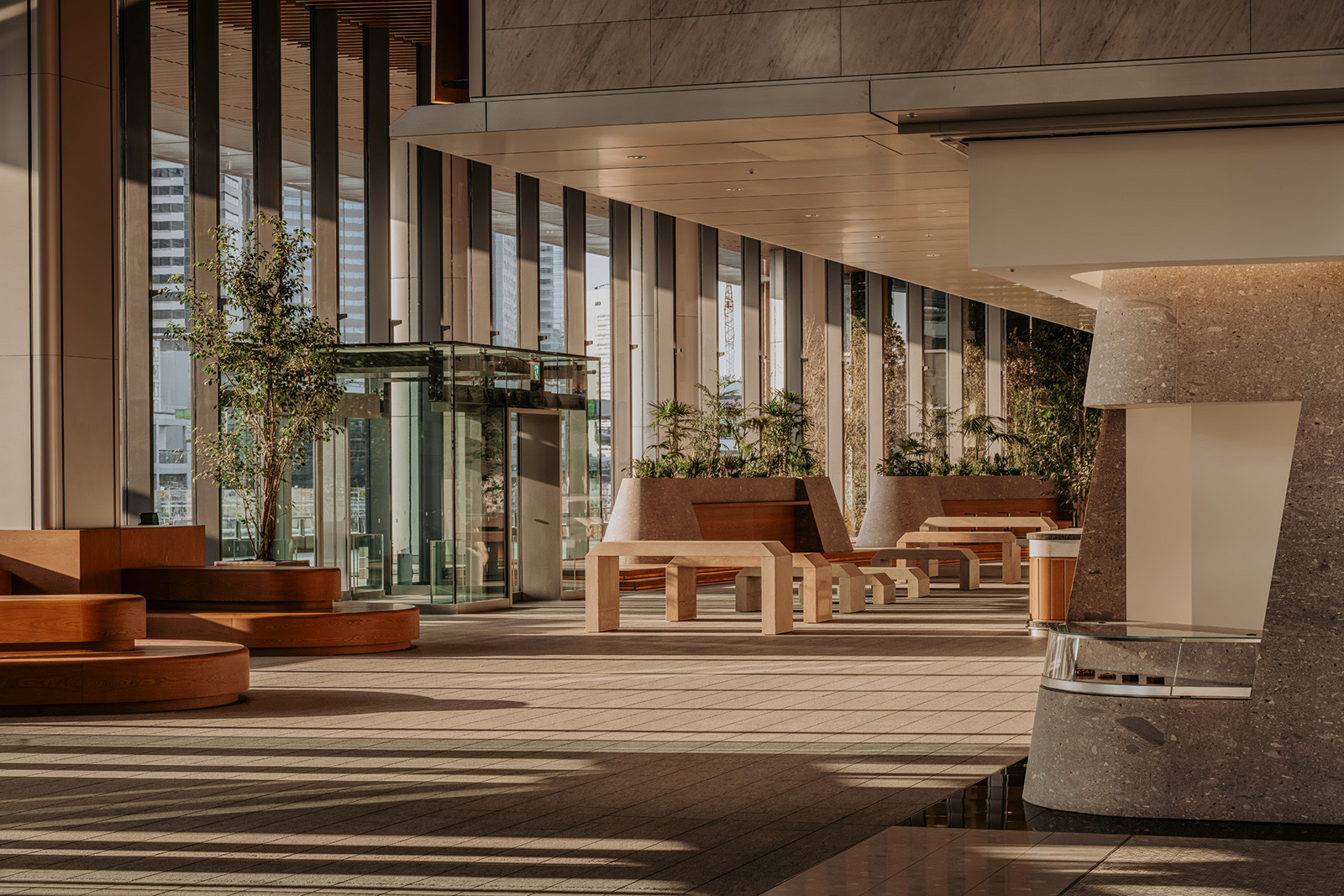このエリアは古くから、人・船舶・鉄道など、あらゆる流通の起点としての “ゲート”が存在してきた。ブルーボトルコーヒー 高輪カフェは、その「ゲートを通り抜け、新たな世界へ入る感覚」を空間デザインで表現し、訪れるゲストに特別な体験を提供する。オーダー、ピックアップ、ドリンクといった一連の行為は、それぞれがゲートを介し、周囲の世界から切り離されることで、日常から非日常へと転換される。人と情報だけでなく、人と人とのコミュニケーションの価値を強く提示し、未来へとつなぐ事を目指している。素材と形状には、この土地に根ざした“石垣”の記憶を引用。100年以上前に使われた石材を、これからの100年に受け継いでいく想いを込めて用いている。過去と未来の時間軸を重ね合わせ、新たなサステイナブルデザインの可能性を切り拓いた。カフェのデザインは周辺のオフィスエントランス空間にも広がり、エリア全体に統一された空気感をもたらしている。店舗前に配された曲線のベンチは、多様なゲストを受け入れながら、優雅で包容力のある存在となっている。空間の中心にはゲートを想起させるネストテーブルとベンチが連なり、川のような流れをつくり出している。様々な用途に対応した異なる高さがリズムを生み、連続する同じ形状と素材の存在が、空間全体の中で強いアクセントとなっている。石垣を積層したようなシーティングエリアは、内と外を緩やかにつなぐ装置となっている。昔このエリアに存在した築堤を連想させる存在は現代に甦り、ゲストの時を未来へ運んでゆく。時代を超越した、人と時の流れを鮮やかに浮かび上がらせる新たなカフェ空間となっている。