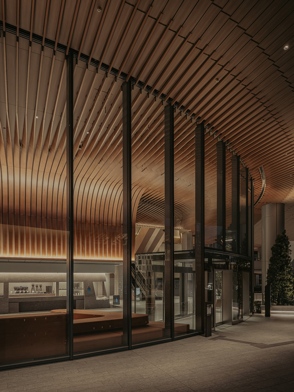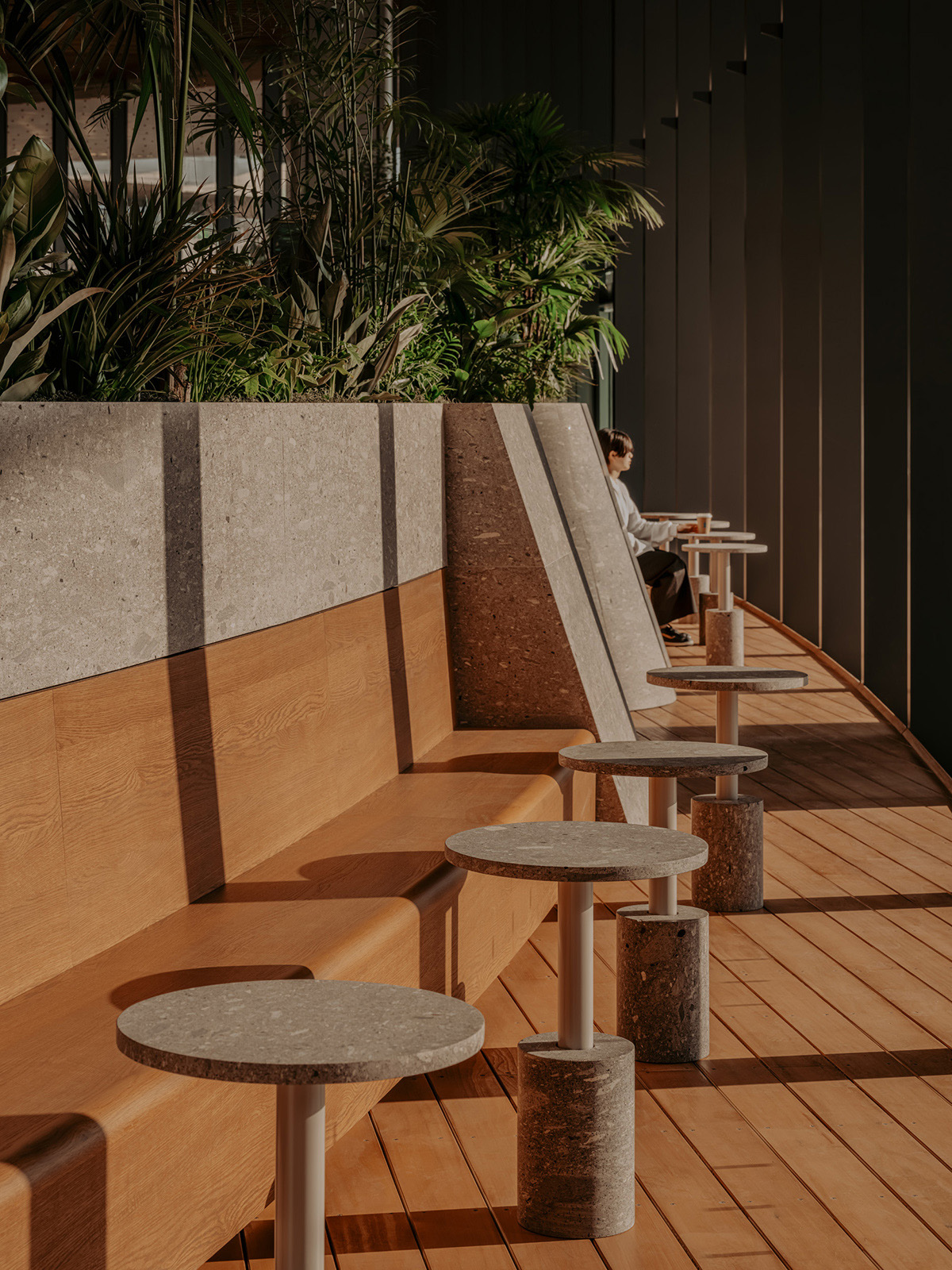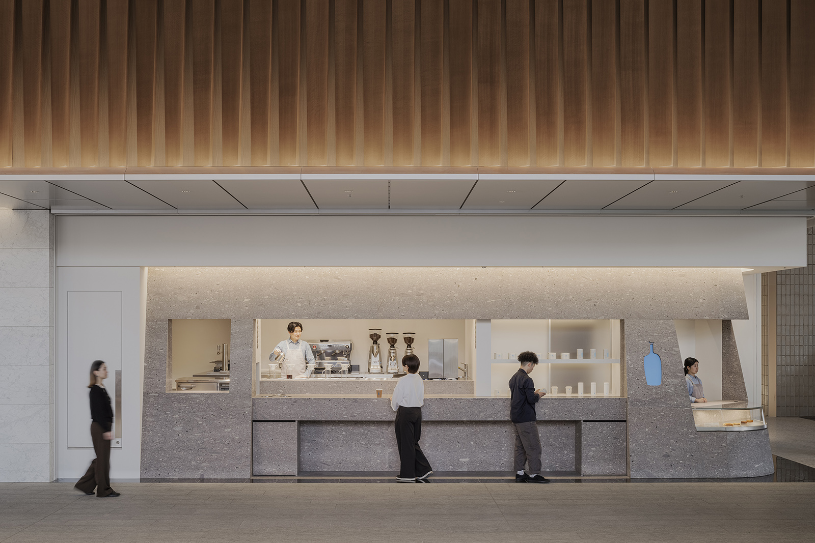 This area has long served as a gateway — for people, ships, and trains — a starting point for all kinds of circulation and exchange. Blue Bottle Coffee Takanawa Café embodies the notion of passage: of crossing thresholds and entering new worlds. Its spatial design draws upon this legacy, inviting visitors into a quietly transformative experience. Each moment within the café — from ordering to pickup to the act of drinking — is framed by symbolic “gates,” gently detaching the visitor from the outside world. These thresholds lend structure and significance to otherwise habitual actions, elevating the everyday into the extraordinary. The space becomes not just a point of transaction, but a locus for human connection and the exchange of ideas — values carried forward into the future. Rooted in place, the design reinterprets the memory of traditional stone walls that once shaped this landscape. Stones more than a century old have been carefully repurposed, embedding the past within the present and extending their narrative into the next hundred years. Through this overlapping of temporal axes — memory and projection — the café offers a contemplative model for sustainable, culturally resonant design. The architecture unfolds seamlessly beyond the café itself, integrating with the adjacent office entrance to create a cohesive and harmonious spatial atmosphere. A gently curving bench at the threshold offers an inclusive gesture of welcome, accommodating a diversity of guests with grace and ease. At the center of the space, a composition of nested tables and benches evokes the flowing rhythm of a river. Their varied heights respond to different modes of use, generating a quiet choreography of movement and interaction. This repetition of form and material introduces a sense of continuity — both visual and social. Along the café’s edge, a layered seating area recalls the stacked stone embankments that once defined the site. Reimagined for contemporary life, this feature mediates between interior and exterior, guiding guests fluidly across thresholds while offering space for pause and presence. Together, these elements shape a timeless environment — one that honors the passage of time, the flow of people, and the quiet beauty of meaningful transitions.