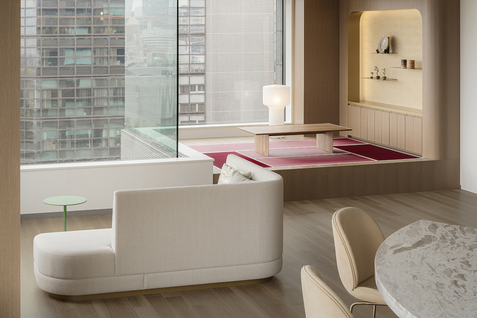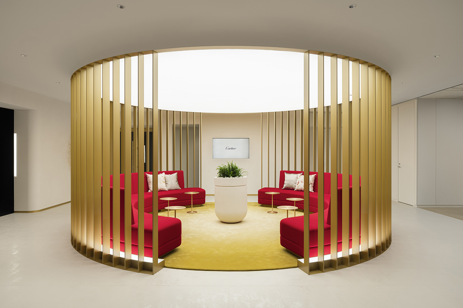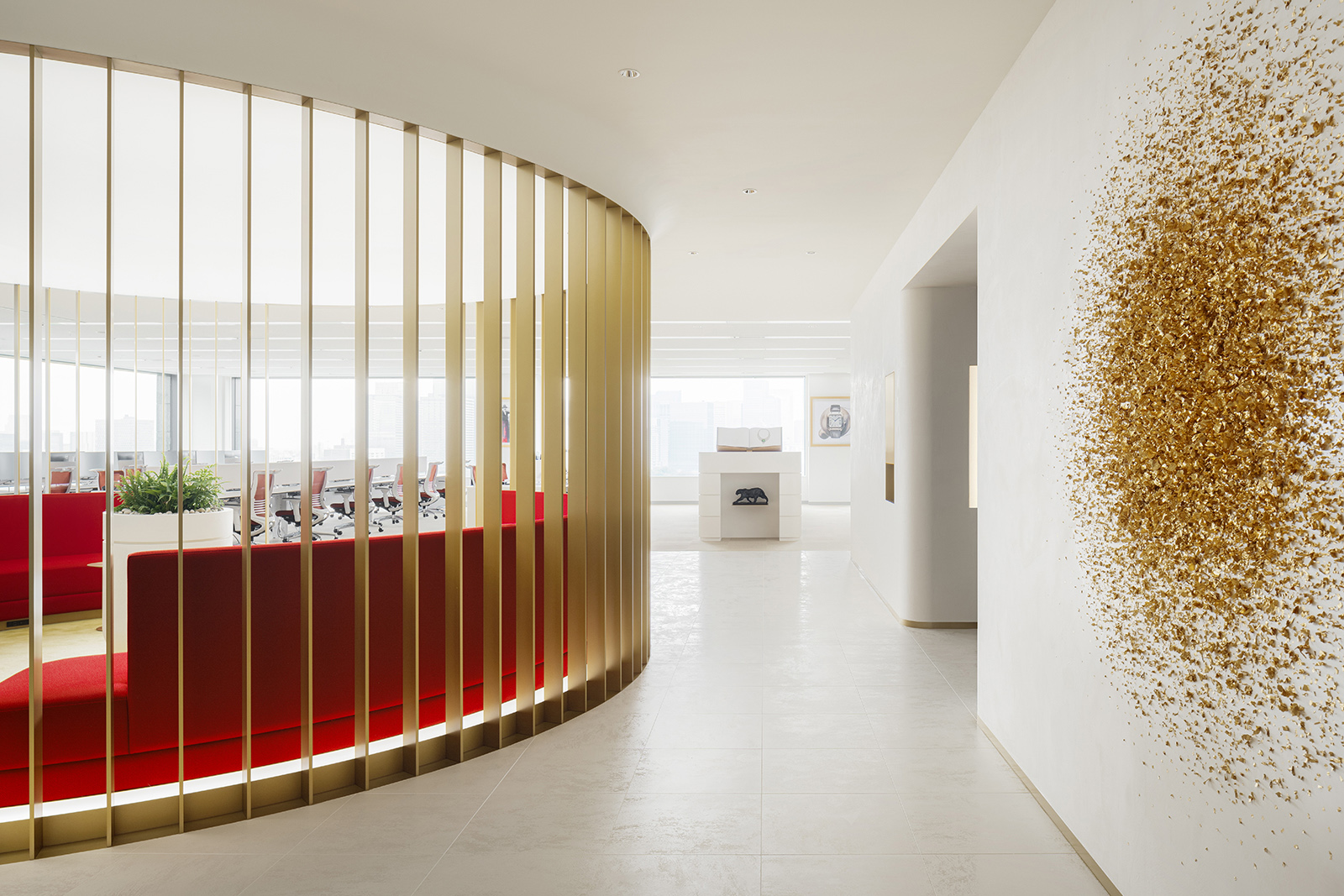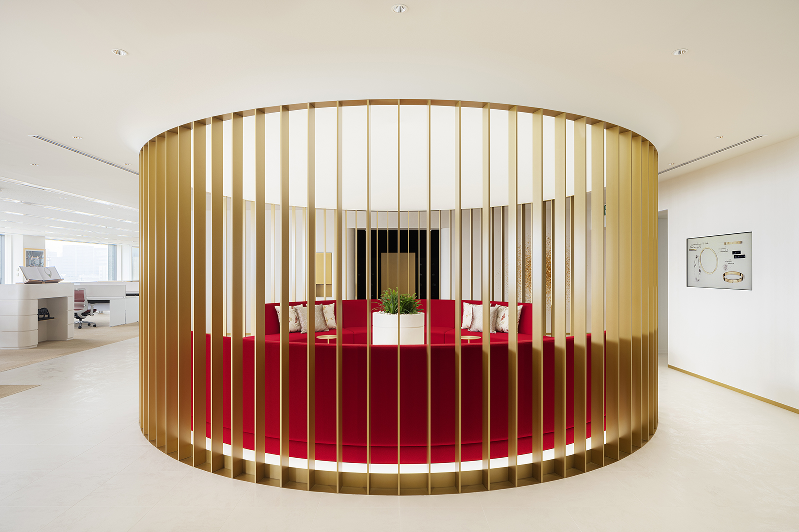 The Cartier Office renovation design aims to express the prestigious brand’s world view of creativity, excellence and luxurious experiences with the use of experiential spaces to foster new communication and relationships within the work environment. A brightly lit and airy entrance hall with high-quality materials sets an uplifting mood to the office. Original abstract artwork of scattered gold leaf on the wall next to the entrance welcomes guests with a contemporary majestic flair. The staff locker room offers a space of tranquility, its tone subdued in contrast to its surroundings, while within the office spaces, accents of champagne gold and deep red are tempered by natural hues— subtle references to the luxury of artisanal craft. A circular lounge space, enclosed within soft-sheen vertical louvers, brings a sense of calm and comfort, its privacy heightened by mellow lighting from above and red-colored sofas that wrap around its visitors. Carefully selected materials and innovative lighting enhance the open-plan work and communication areas. A central large round table has a radial wooden surface pattern, subtly divided into individual work zones by champagne-gold metal lines. The communication lounge, radiantly lit by its window-side location, offers spaces that encourage face-to-face encounters and conversations. A marble-topped circular counter welcomes visitors with its warm gold accents and open center, while in a window-wrapped corner, a comfy plush sofa faces spectacular views of the city. Tucked in another window-walled corner lies the serene heart of the communication lounge. A raised tatami-mat space with unusual red mats looks out to vistas of the city. A space to take off your shoes to relax, stretch and decompress, it pays homage to Japanese aesthetics and honours Cartier’s principles of artisanal quality and innovation.