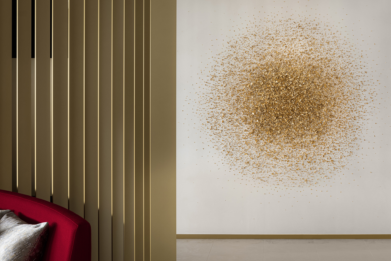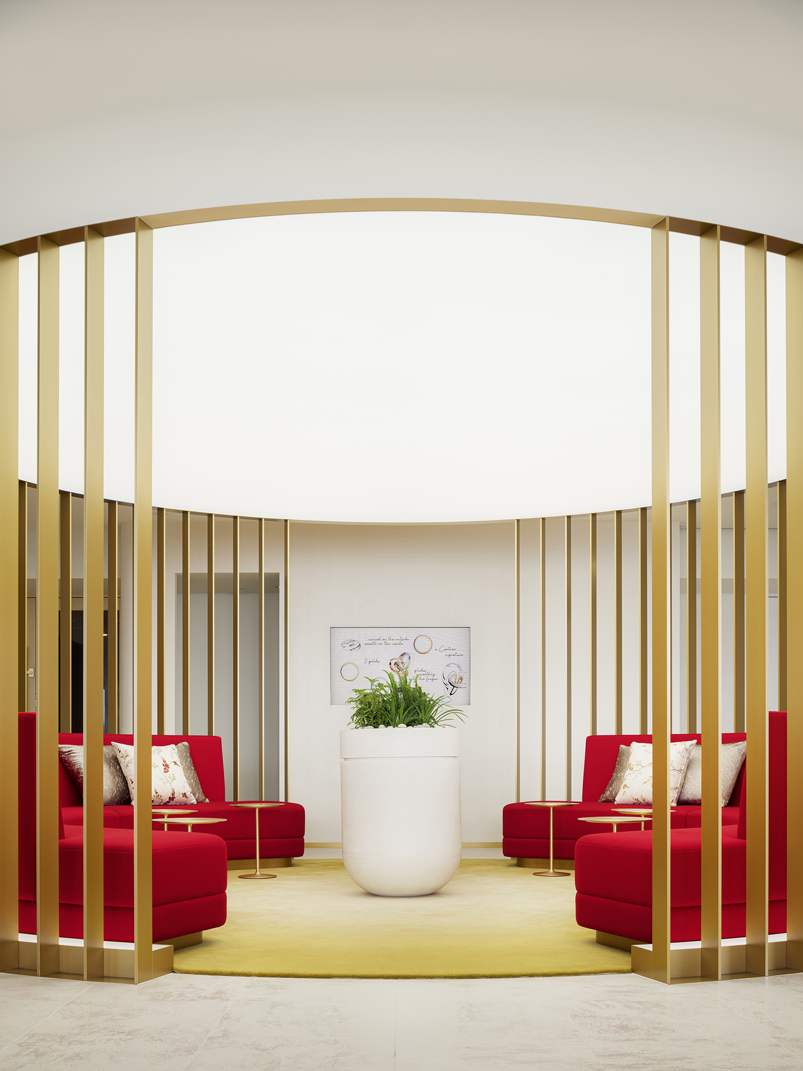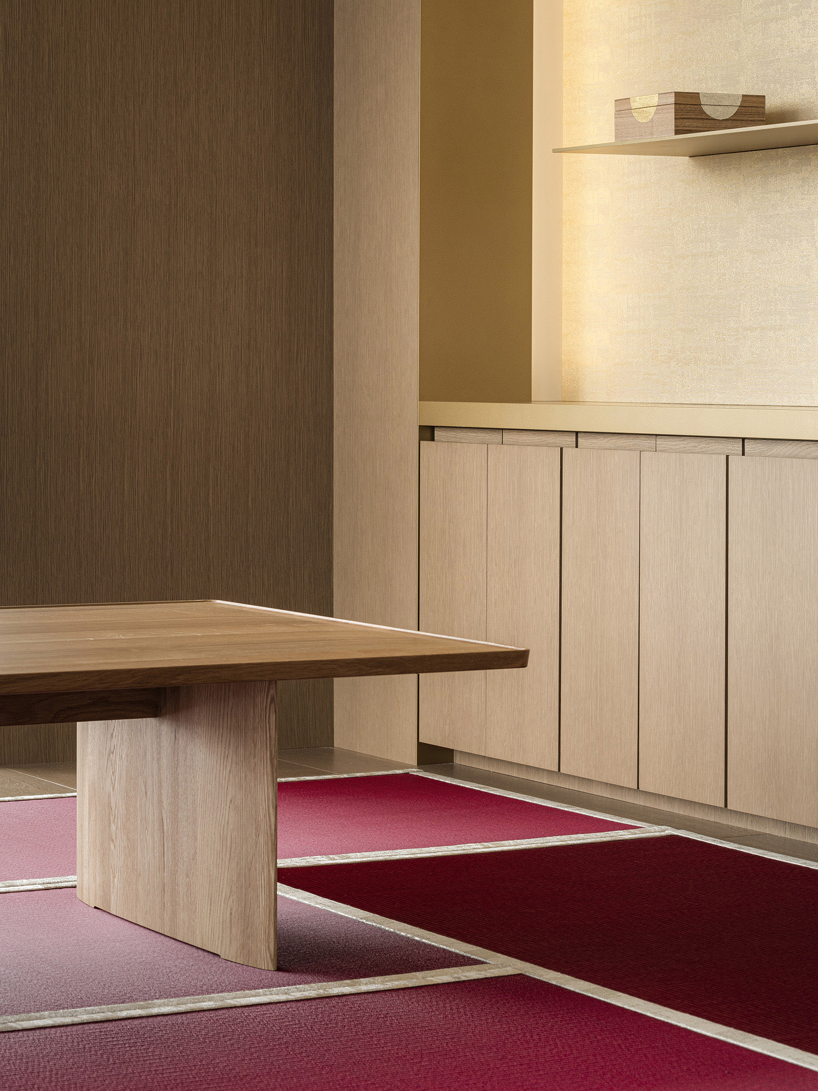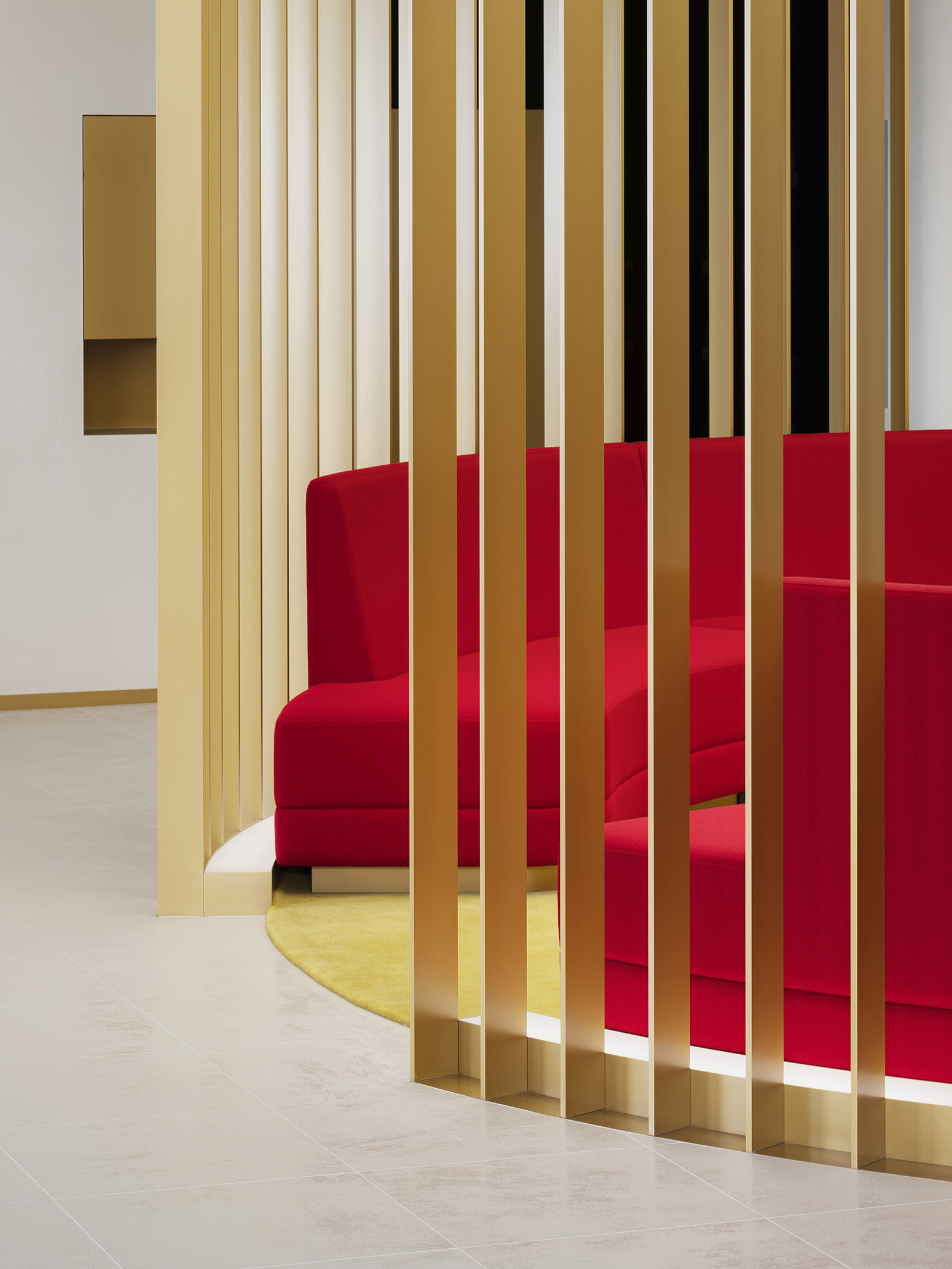 The Cartier Office renovation design aims to express the prestigious brand’s world view of creativity, excellence and luxurious experiences with the use of experiential spaces to foster new communication and relationships within the work environment. A brightly lit and airy entrance hall with high-quality materials sets an uplifting mood to the office. Original abstract artwork of scattered gold leaf on the wall next to the entrance welcomes guests with a contemporary majestic flair. The staff locker room offers a space of tranquility, its tone subdued in contrast to its surroundings, while within the office spaces, accents of champagne gold and deep red are tempered by natural hues— subtle references to the luxury of artisanal craft. A circular lounge space, enclosed within soft-sheen vertical louvers, brings a sense of calm and comfort, its privacy heightened by mellow lighting from above and red-colored sofas that wrap around its visitors. Carefully selected materials and innovative lighting enhance the open-plan work and communication areas. A central large round table has a radial wooden surface pattern, subtly divided into individual work zones by champagne-gold metal lines. The communication lounge, radiantly lit by its window-side location, offers spaces that encourage face-to-face encounters and conversations. A marble-topped circular counter welcomes visitors with its warm gold accents and open center, while in a window-wrapped corner, a comfy plush sofa faces spectacular views of the city. Tucked in another window-walled corner lies the serene heart of the communication lounge. A raised tatami-mat space with unusual red mats looks out to vistas of the city. A space to take off your shoes to relax, stretch and decompress, it pays homage to Japanese aesthetics and honours Cartier’s principles of artisanal quality and innovation.