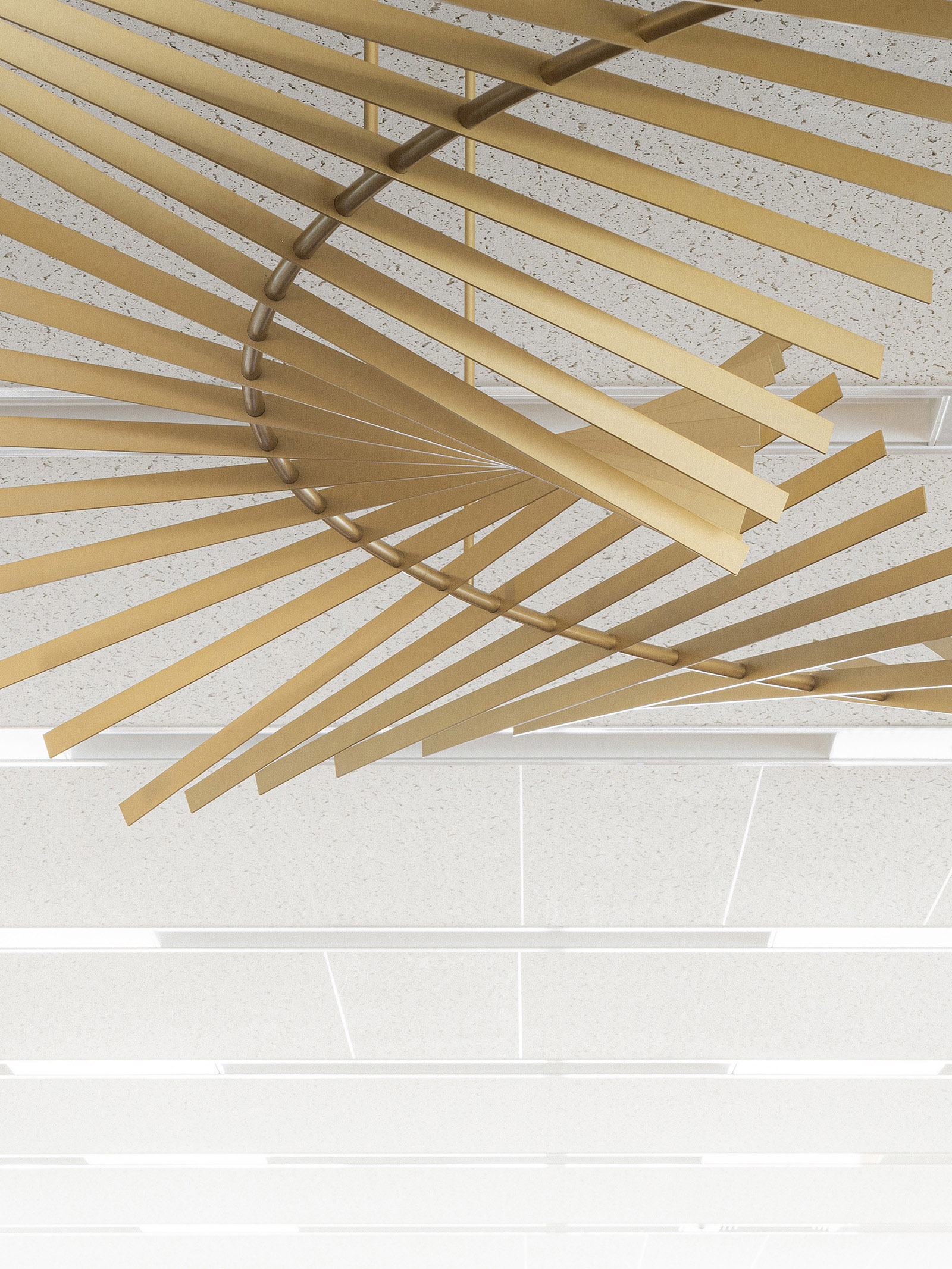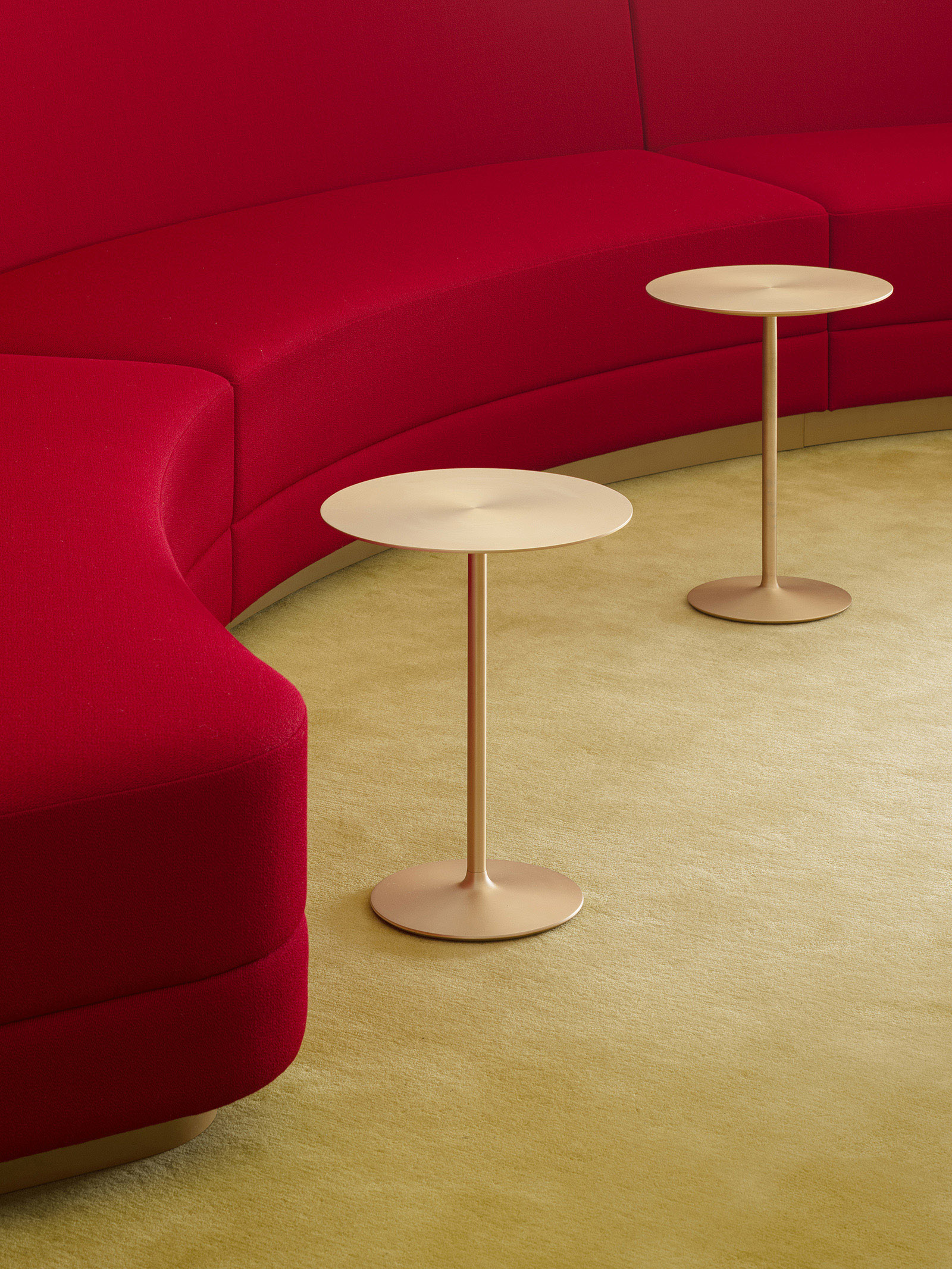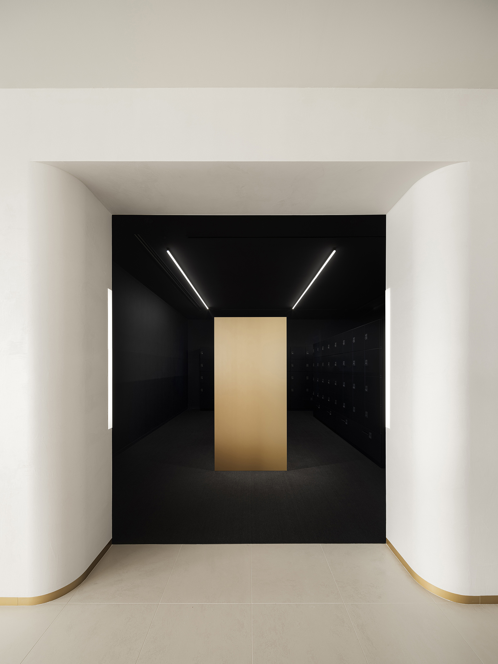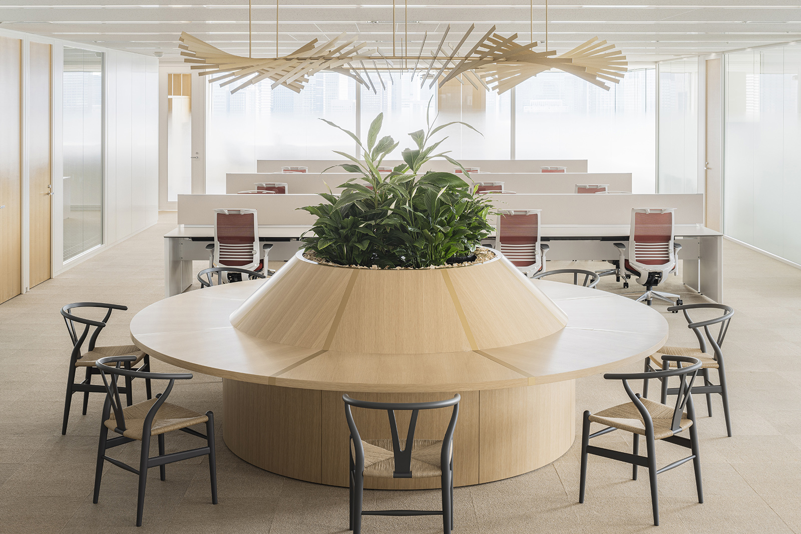The Cartier Office renovation design aims to express the prestigious brand’s world view of creativity, excellence and luxurious experiences with the use of experiential spaces to foster new communication and relationships within the work environment. A brightly lit and airy entrance hall with high-quality materials sets an uplifting mood to the office. Original abstract artwork of scattered gold leaf on the wall next to the entrance welcomes guests with a contemporary majestic flair. The staff locker room offers a space of tranquility, its tone subdued in contrast to its surroundings, while within the office spaces, accents of champagne gold and deep red are tempered by natural hues— subtle references to the luxury of artisanal craft. A circular lounge space, enclosed within soft-sheen vertical louvers, brings a sense of calm and comfort, its privacy heightened by mellow lighting from above and red-colored sofas that wrap around its visitors. Carefully selected materials and innovative lighting enhance the open-plan work and communication areas. A central large round table has a radial wooden surface pattern, subtly divided into individual work zones by champagne-gold metal lines. The communication lounge, radiantly lit by its window-side location, offers spaces that encourage face-to-face encounters and conversations. A marble-topped circular counter welcomes visitors with its warm gold accents and open center, while in a window-wrapped corner, a comfy plush sofa faces spectacular views of the city. Tucked in another window-walled corner lies the serene heart of the communication lounge. A raised tatami-mat space with unusual red mats looks out to vistas of the city. A space to take off your shoes to relax, stretch and decompress, it pays homage to Japanese aesthetics and honours Cartier’s principles of artisanal quality and innovation.