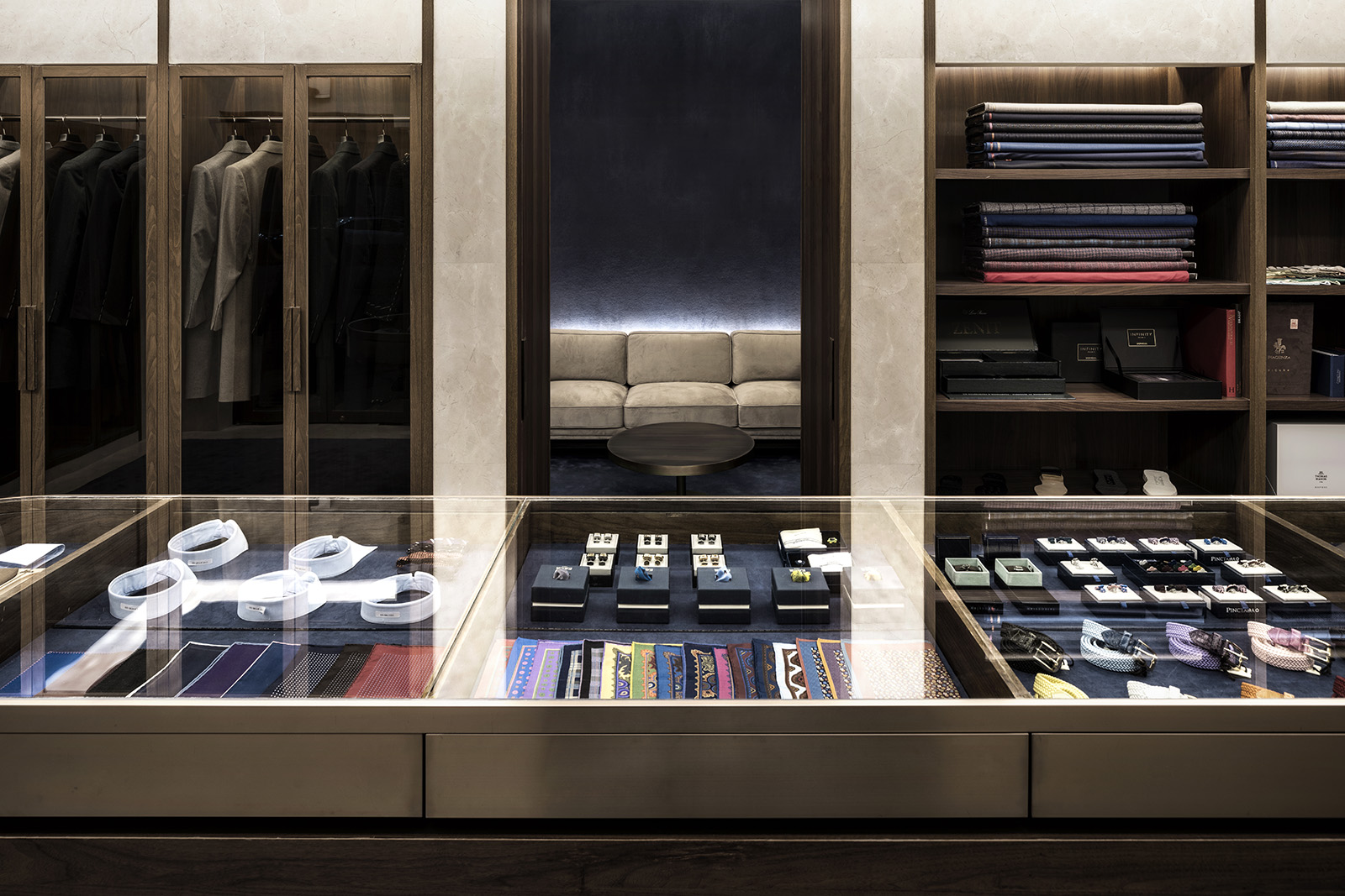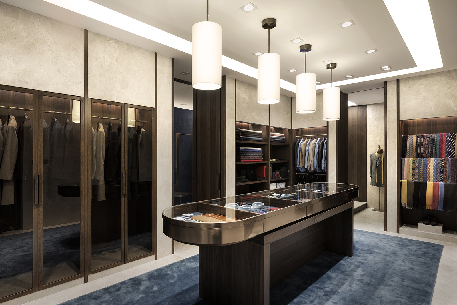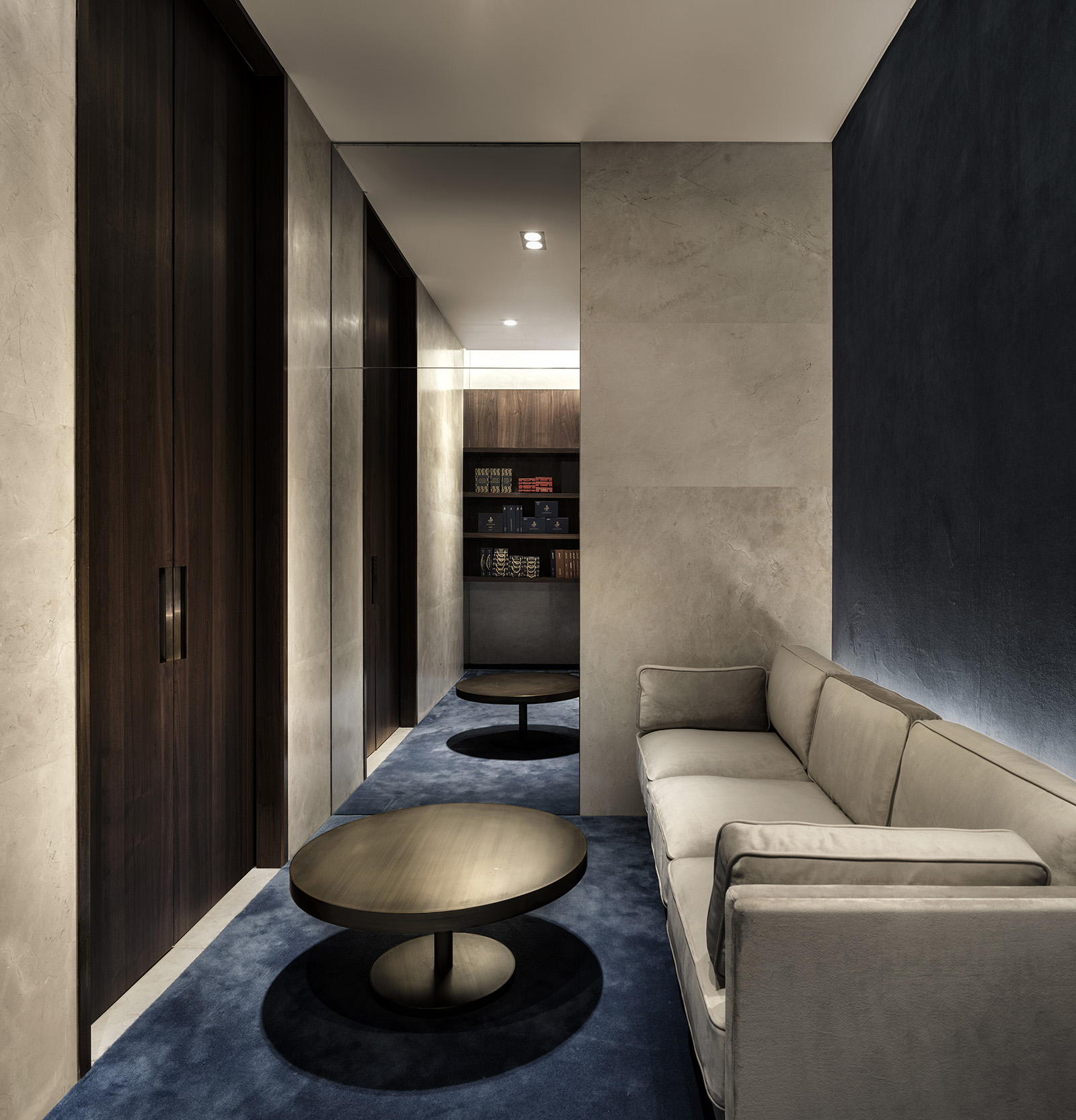 Flagship store for Genttio, a luxury tailor brand from China. The brand's commitment to authentic materials is expressed by elegant marble and sophisticated wood details. A series of pendant lights focus onto the center counter to match the neatly displayed suits. The blue color in the space changes its expression in response to daily light, reminiscent to the refreshing Mediterranean Sea of Napoli, Italy, which connects to the core of the brand. By carefully combining various selected elements, the space becomes a high quality environment with sophisticated atmosphere for the customer.