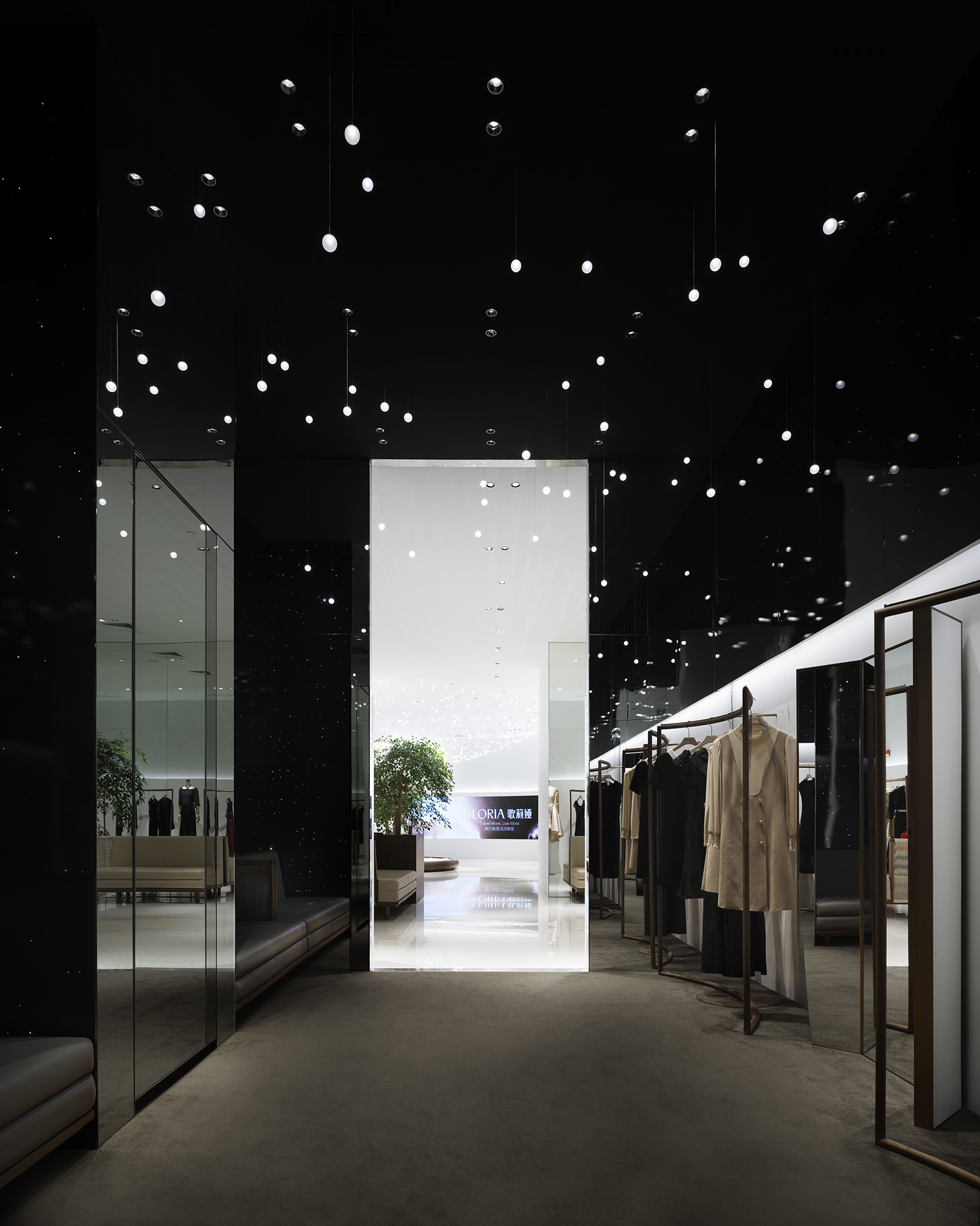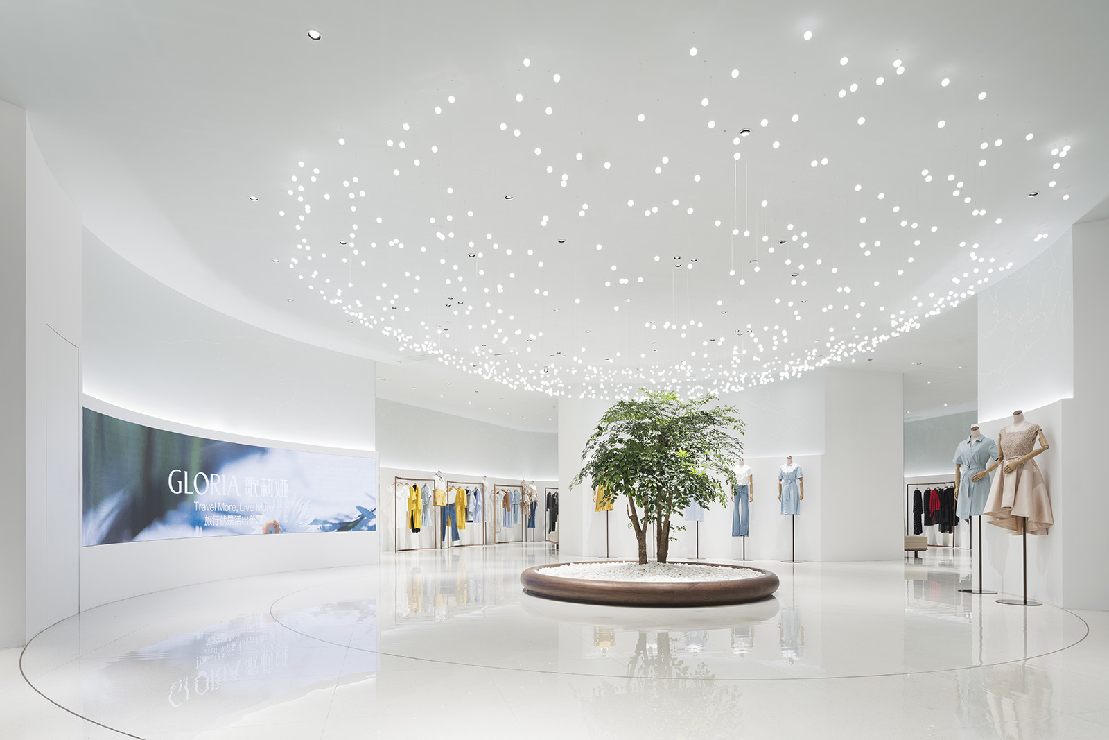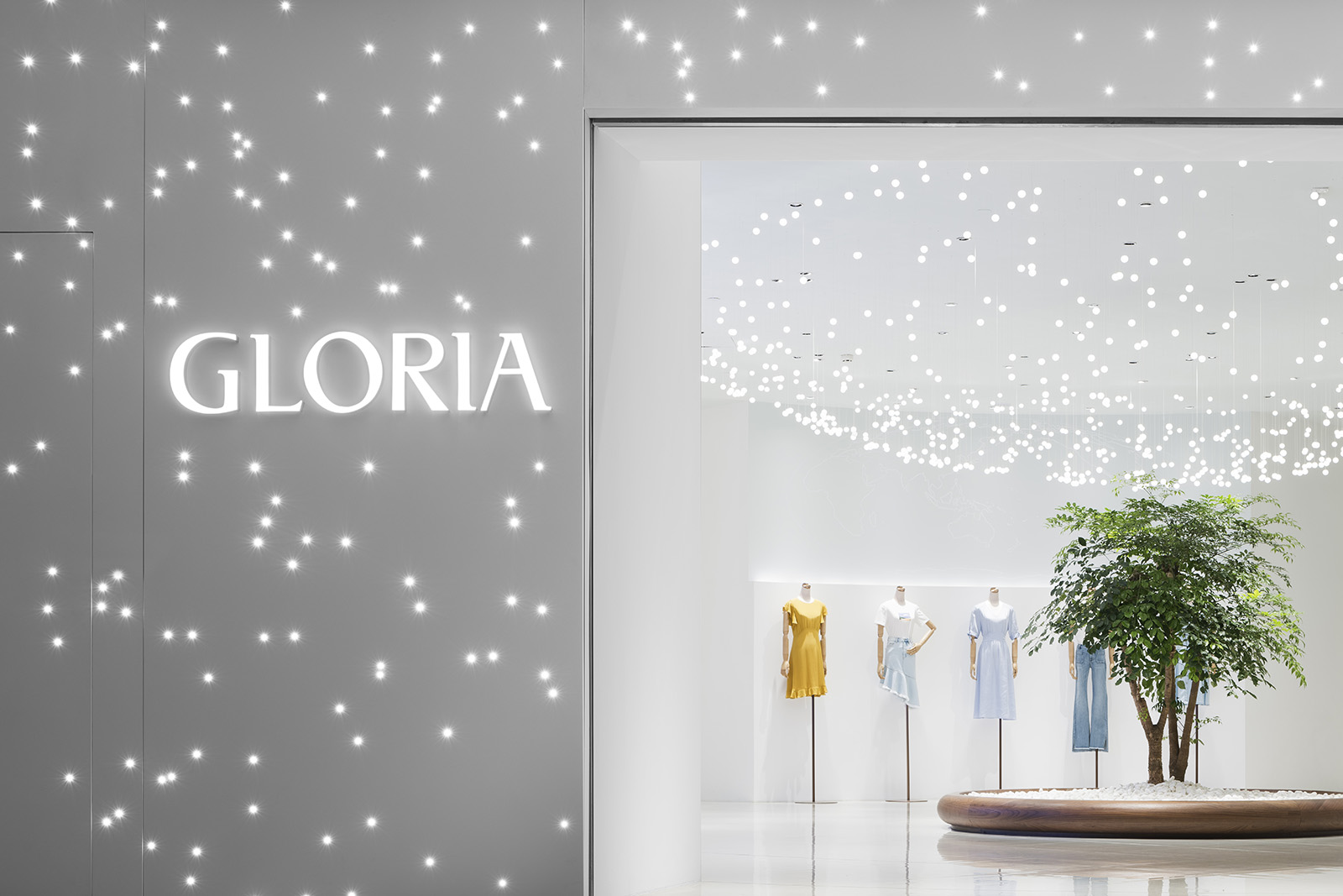 中国、広州発の女性服ブランド、GLORIAのコンセプトストア。アイキャッチとなる光のシャンデリアは、壮大な地球の一部を感じさせる形でレイアウトされ、世界旅行と星空をコンセプトとするブランドの世界観を表現している。地平線のように空間全体に広がる壁面の水平な光、訪れる人々を奥へと導く。上部にはイラストレーターCHALKBOYによる世界地図を表現したグラフィックが全面に広がる。緩やかに曲げられた木のハンガーバーは、リズミカルに並べられた洋服をより柔らかく見せ、 洗練された空間の中で女性的な存在感を際立たせる。店内奥のVIPルームでは天井や、壁一面に繊細な光が散りばめられ、星空の中にいる様な幻想的な雰囲気をつくりだす。ブランドコンセプトと柔らかな洋服の魅力を、優雅かつダイナミックに表現した。