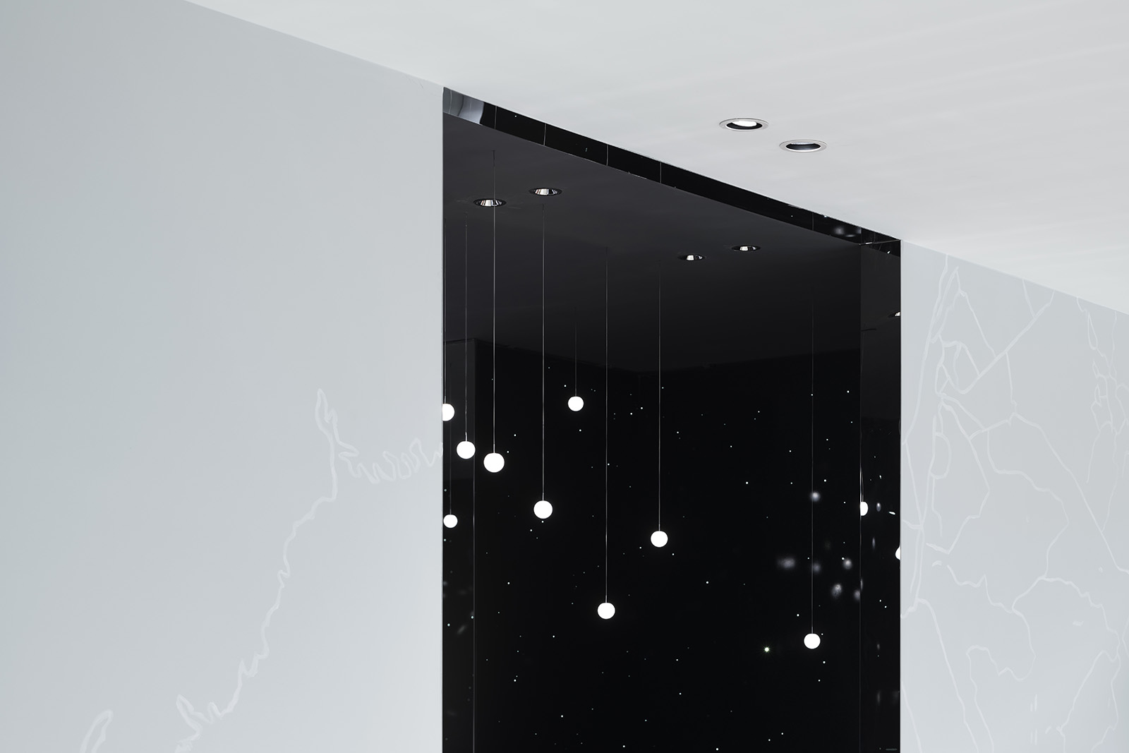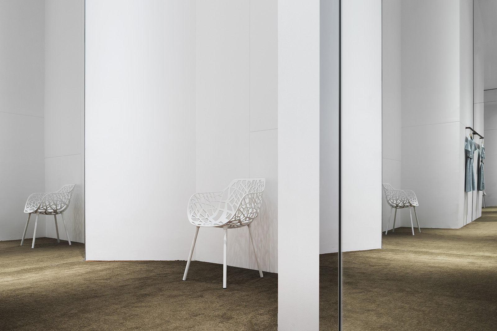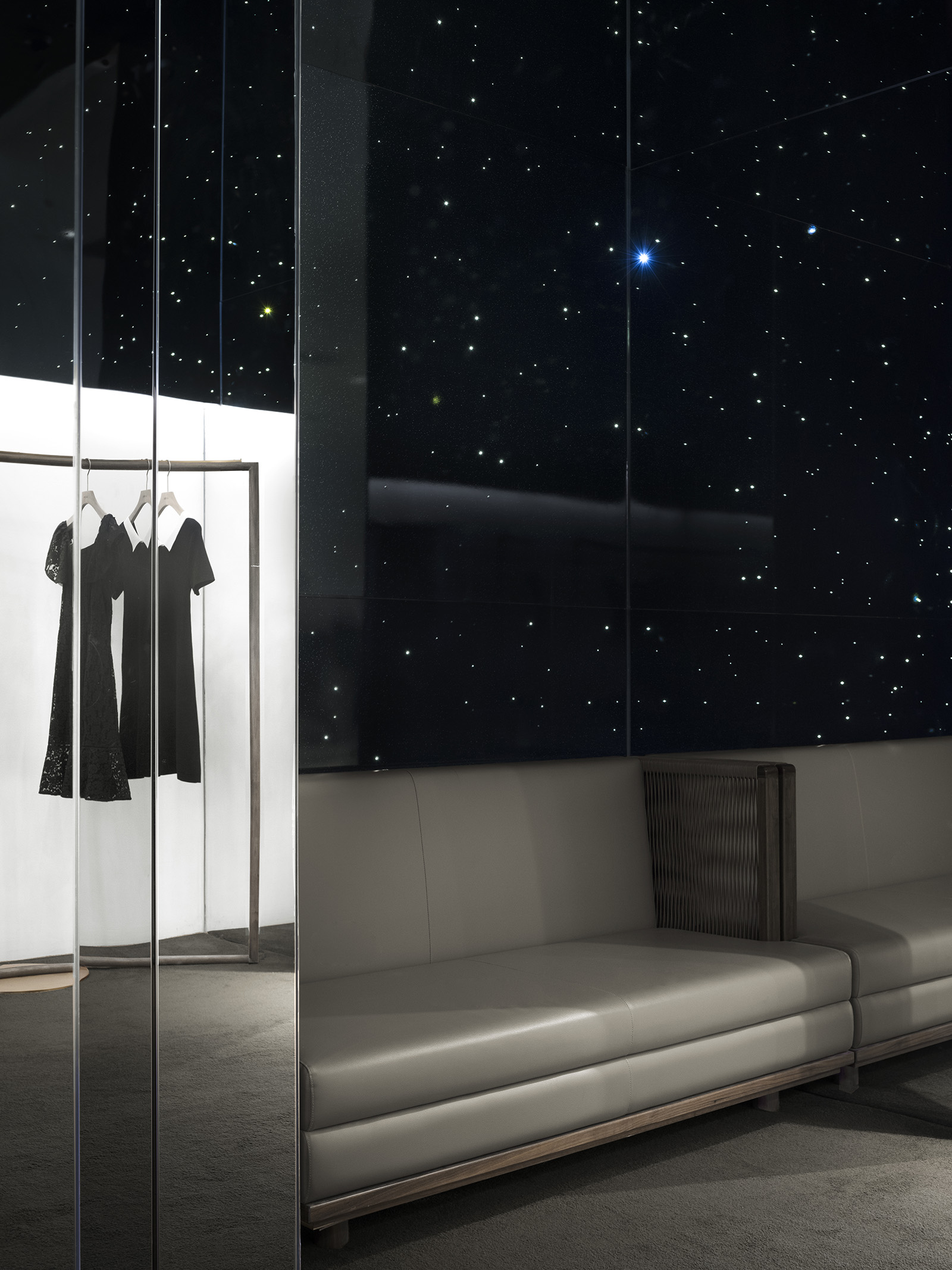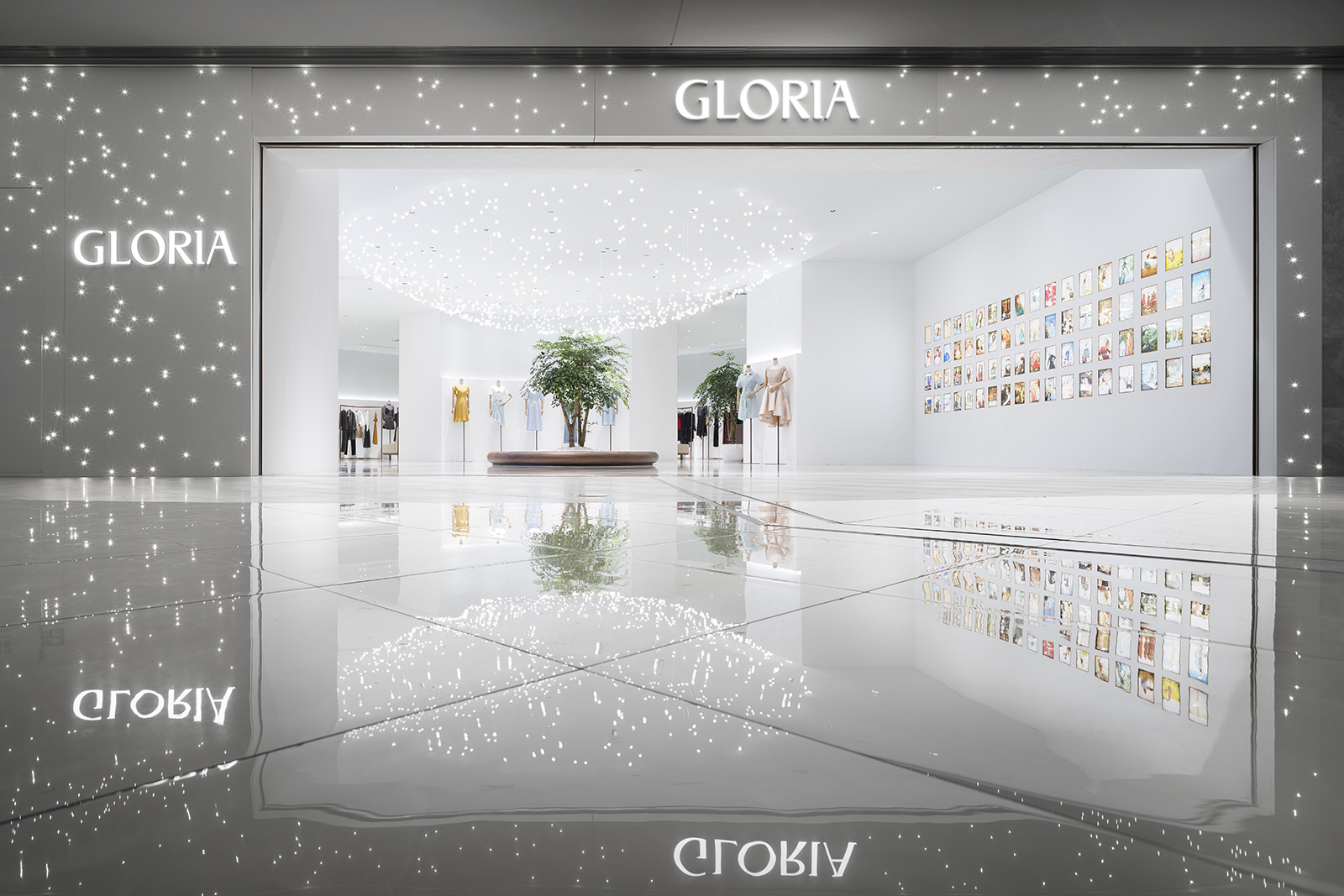 中国、広州発の女性服ブランド、GLORIAのコンセプトストア。アイキャッチとなる光のシャンデリアは、壮大な地球の一部を感じさせる形でレイアウトされ、世界旅行と星空をコンセプトとするブランドの世界観を表現している。地平線のように空間全体に広がる壁面の水平な光、訪れる人々を奥へと導く。上部にはイラストレーターCHALKBOYによる世界地図を表現したグラフィックが全面に広がる。緩やかに曲げられた木のハンガーバーは、リズミカルに並べられた洋服をより柔らかく見せ、 洗練された空間の中で女性的な存在感を際立たせる。店内奥のVIPルームでは天井や、壁一面に繊細な光が散りばめられ、星空の中にいる様な幻想的な雰囲気をつくりだす。ブランドコンセプトと柔らかな洋服の魅力を、優雅かつダイナミックに表現した。