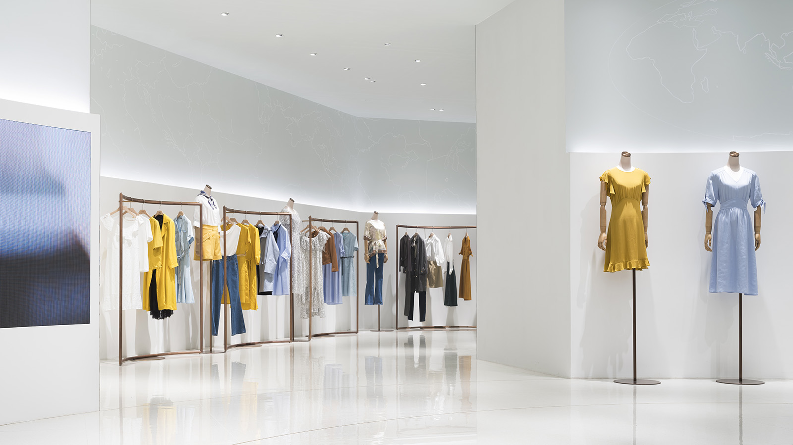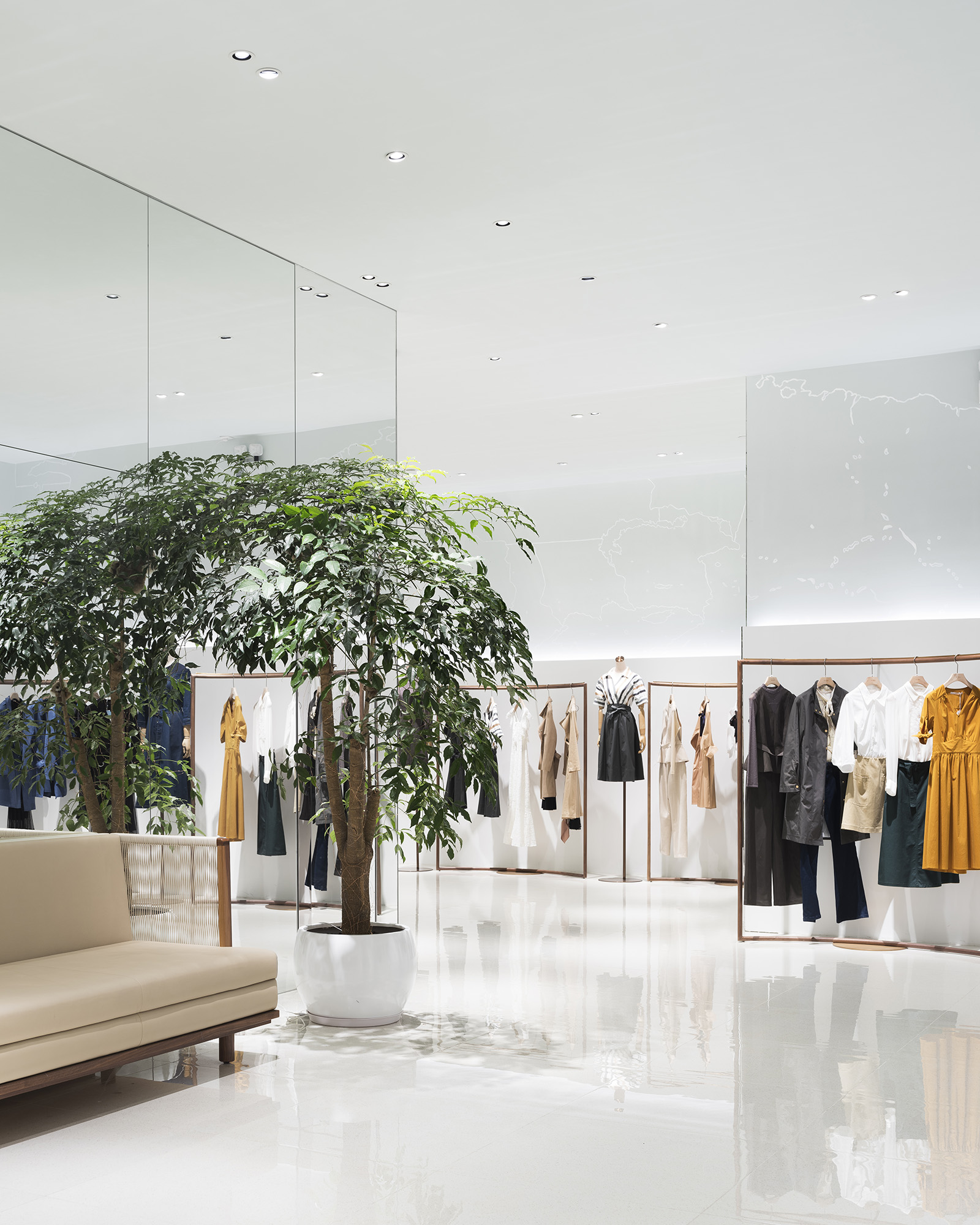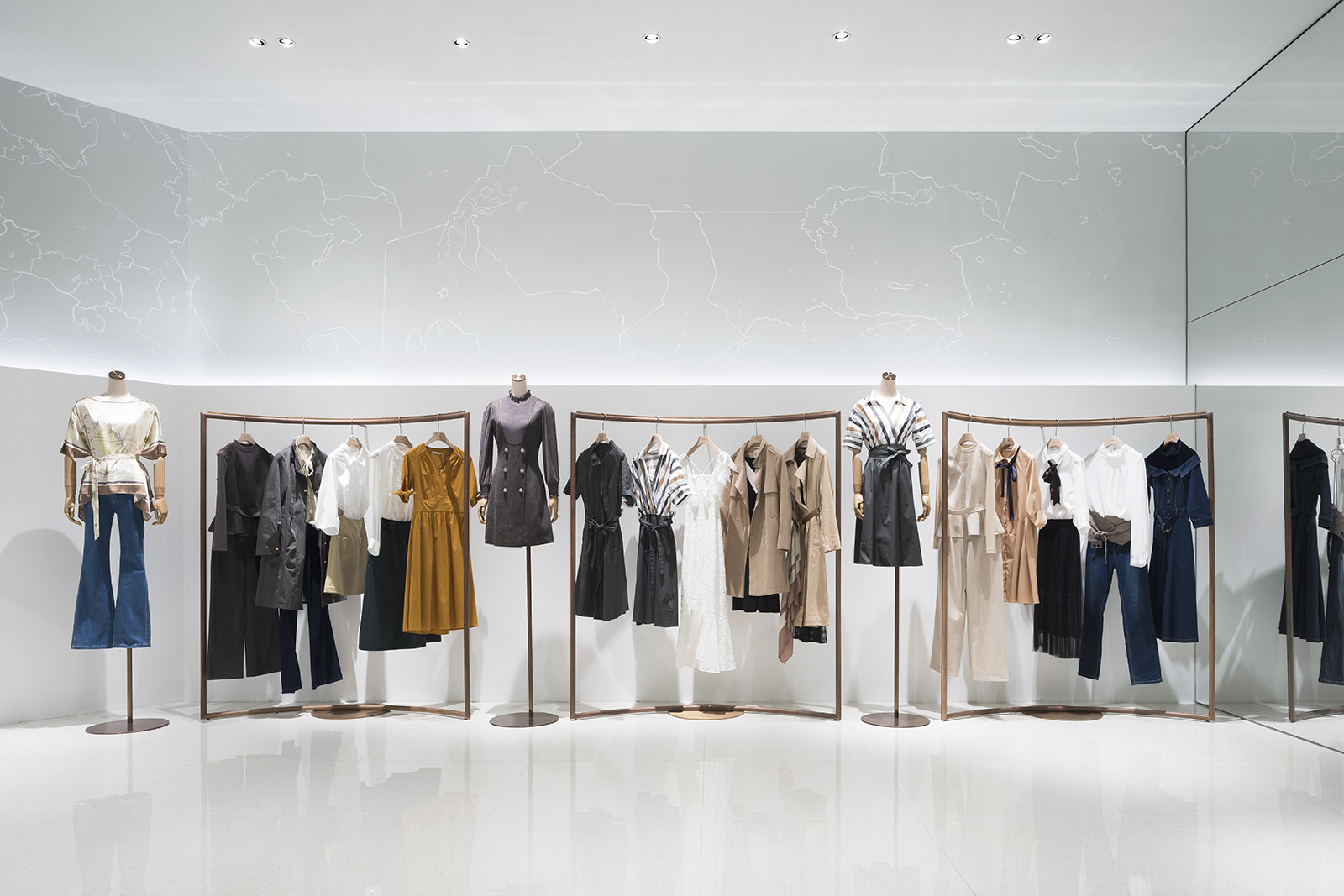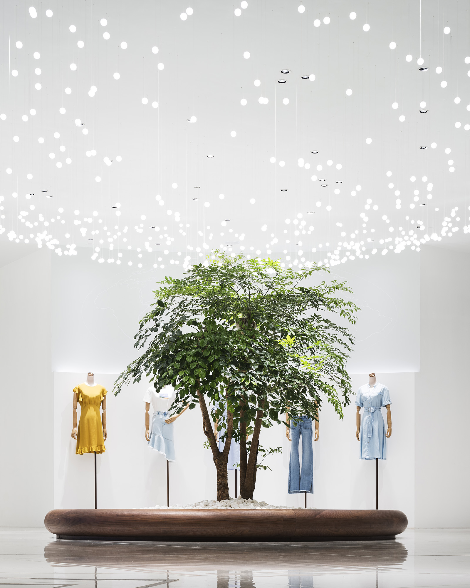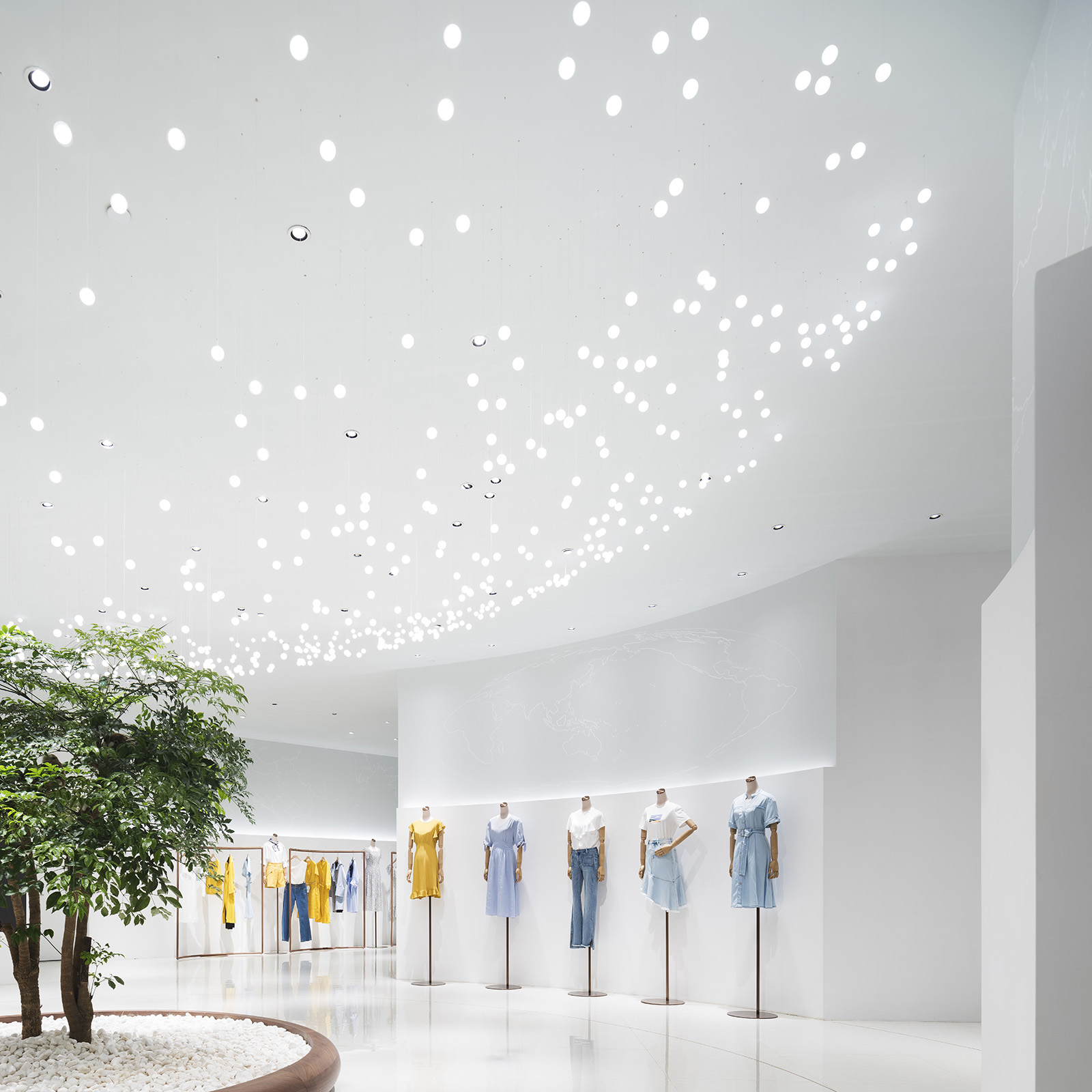 Concept store for Chinese women’s clothing brand GLORIA, located in Guangzhou. The light chandelier hanging from the ceiling becomes a strong eye catching globe-like element that reveals the world of the brand with the concept of a voyage and a starlit sky. The horizontal light on the wall, which spreads throughout the entire space, represents the horizon of the Earth and leads the customers deeper into the store. On the upper wall, graphics, painted by Japanese illustrator, CHALKBOY, are representing the World map. The gently-bent wooden hanger bar reveal the displayed clothes in a softer impression, emphasizing the feminine atmosphere within the sophisticated space. In the VIP room, located at the back of the store, lights are scattered creating dream-like atmosphere, as of being in a starlit sky. I IN introduced the brand concept and soft feelings of a woman with elegance and dynamic expression.