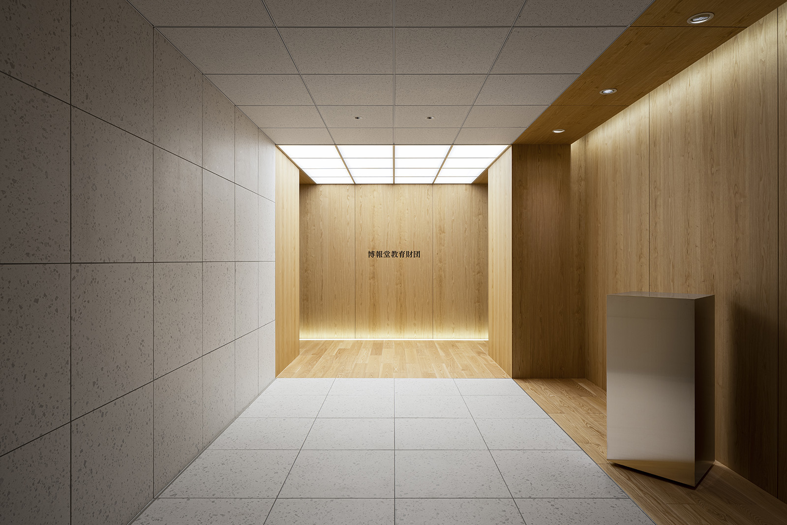 博報堂教育財団の新オフィスデザイン。教育関連の様々な支援、活動に携わる財団の堅実な姿勢を、実直で高品位なデザインで表現した。エントランスエリアでは空間を大きくグリッドと異なる素材の組み合わせで構成し、オフィス本来の持つ堅実さを強調しながらも、モダンで崇高な世界観をつくっている。また随所で使われる木の表情もどこか誠実さを表す様な柄と色で統一した。廊下や執務室では光のゲートが無機質な空間の中暖かい表情とリズムを生み出している。洗練された素材の使い方と柔らかい光が織りなす上質なオフィス空間となった。