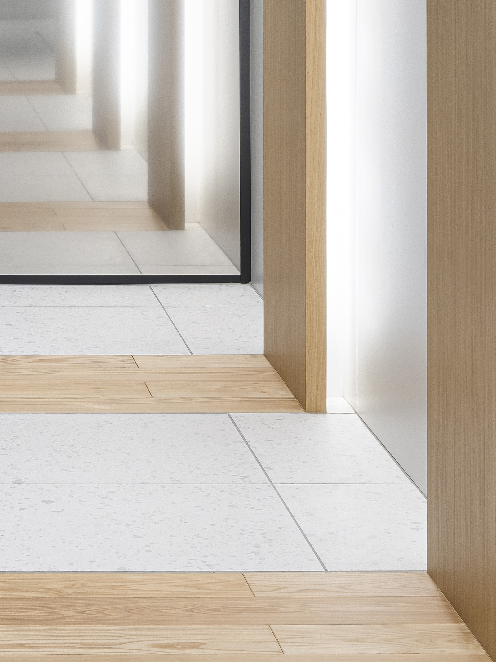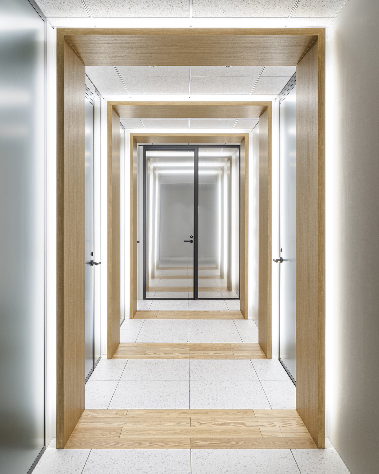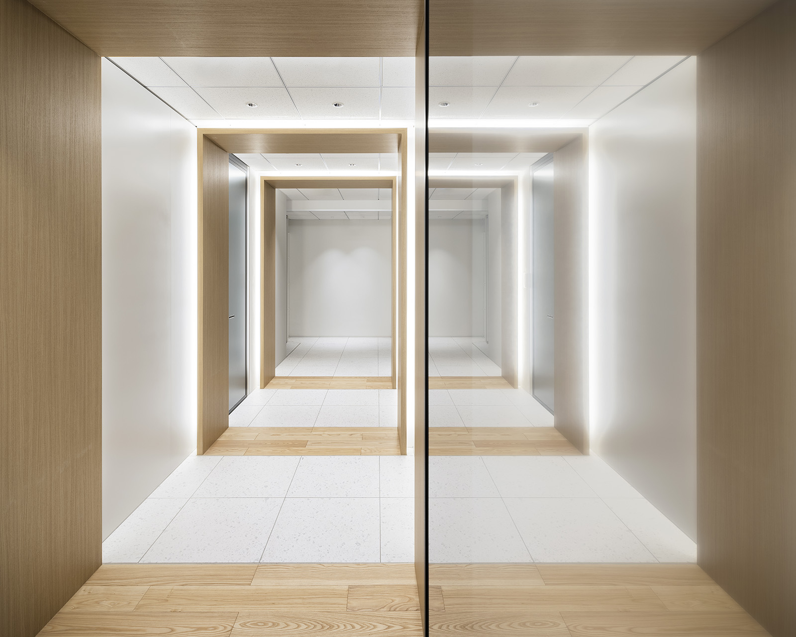 New office design for Hakuhodo Foundation. I IN expressed the sincere attitude of the Foundation, involved in various educational-related support and activities, with authentic and immense design. The entrance area opens up with a space composed of a combination of grids and different materials, creating a modern and sublime world, while emphasizing the solidity of the office. In addition, the expression of the wood used everywhere is unified with a pattern and a color that fits well with the Foundation’s manner and sincerity utterance. In the corridors and working area, light gates create a warm ambience and rhythm in a simple, effortless space. Surrounded by sophisticated materials and soft light, the interior became an distinguished office space.