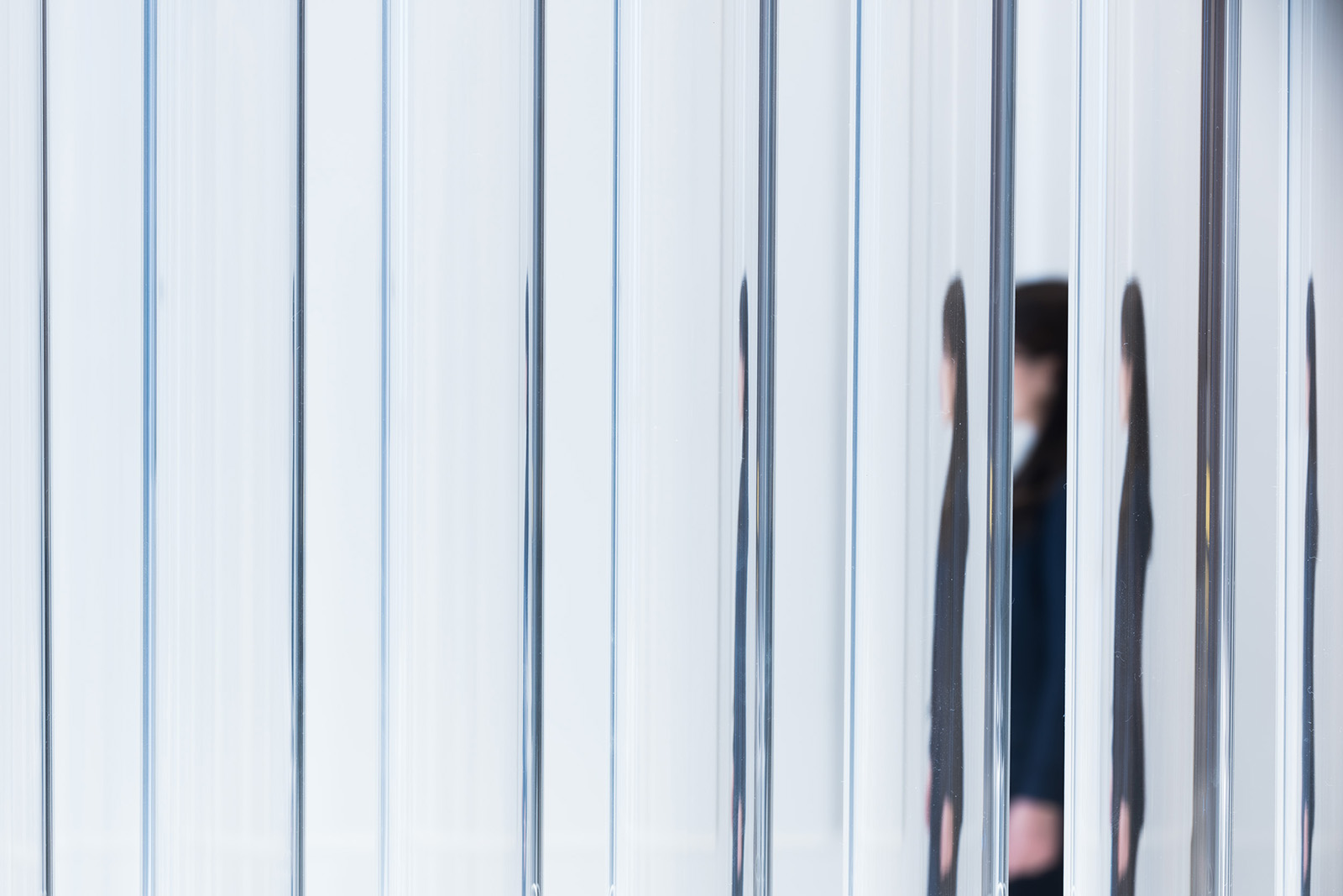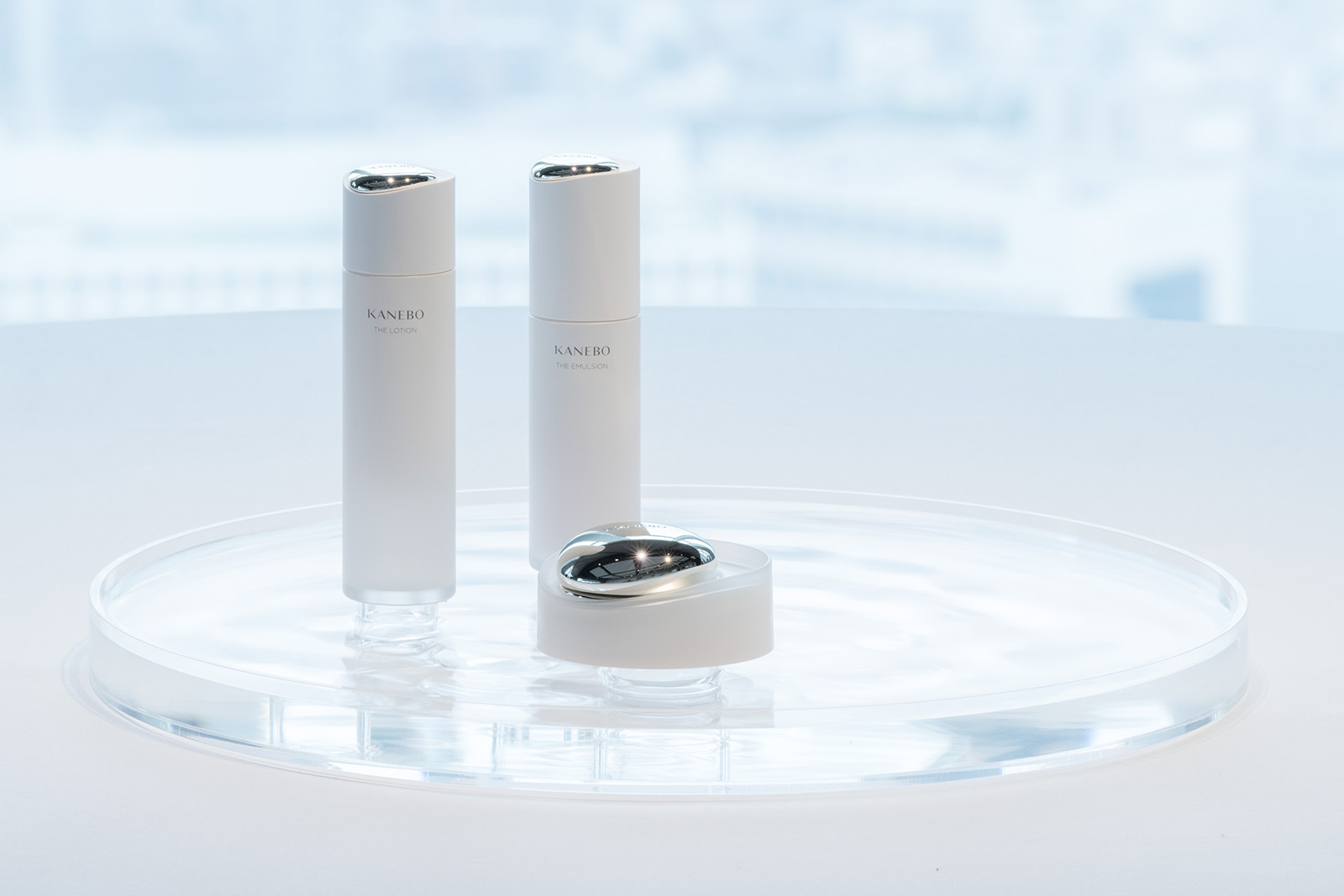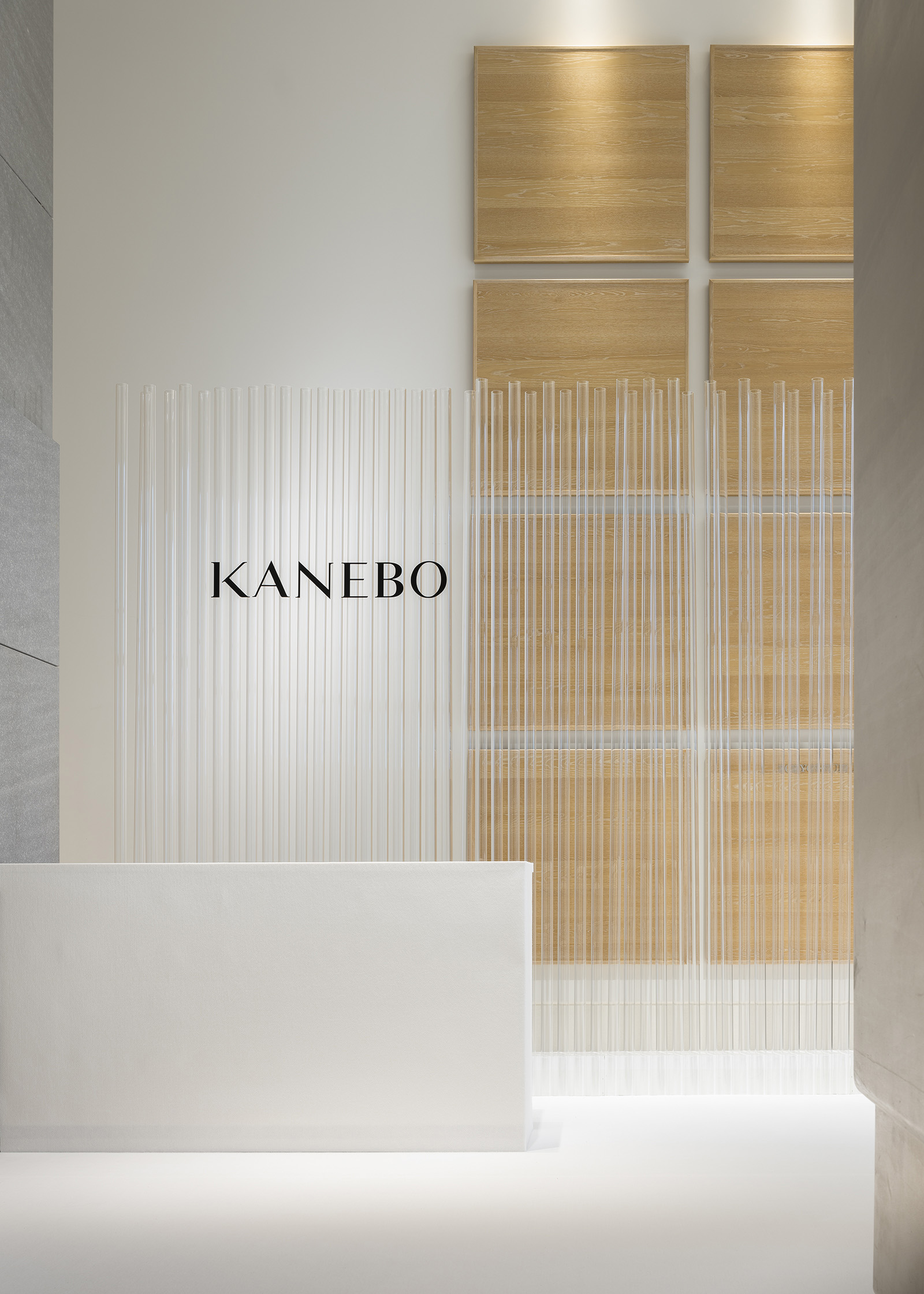 KANEBOブランド新商品発表会でのインスタレーション空間。高さ3メートルの透明なアクリルパイプを並べることで、”透明美”をコンセプトとする新商品の世界観を表現。透明な曲面を重ねることによって生まれる光の屈折や像の奥行きが、非日常的な景色を創り出す。商品は同じくアクリルパイプによって目線の高さで展示され、背景のアクリルと混ざり合うことによって、商品が空間の中に浮いているような印象を与える。発表会場内では、商品が浮かぶように並べられた水盤の水が、空気に呼応するよう爽やかに水面を揺らす。