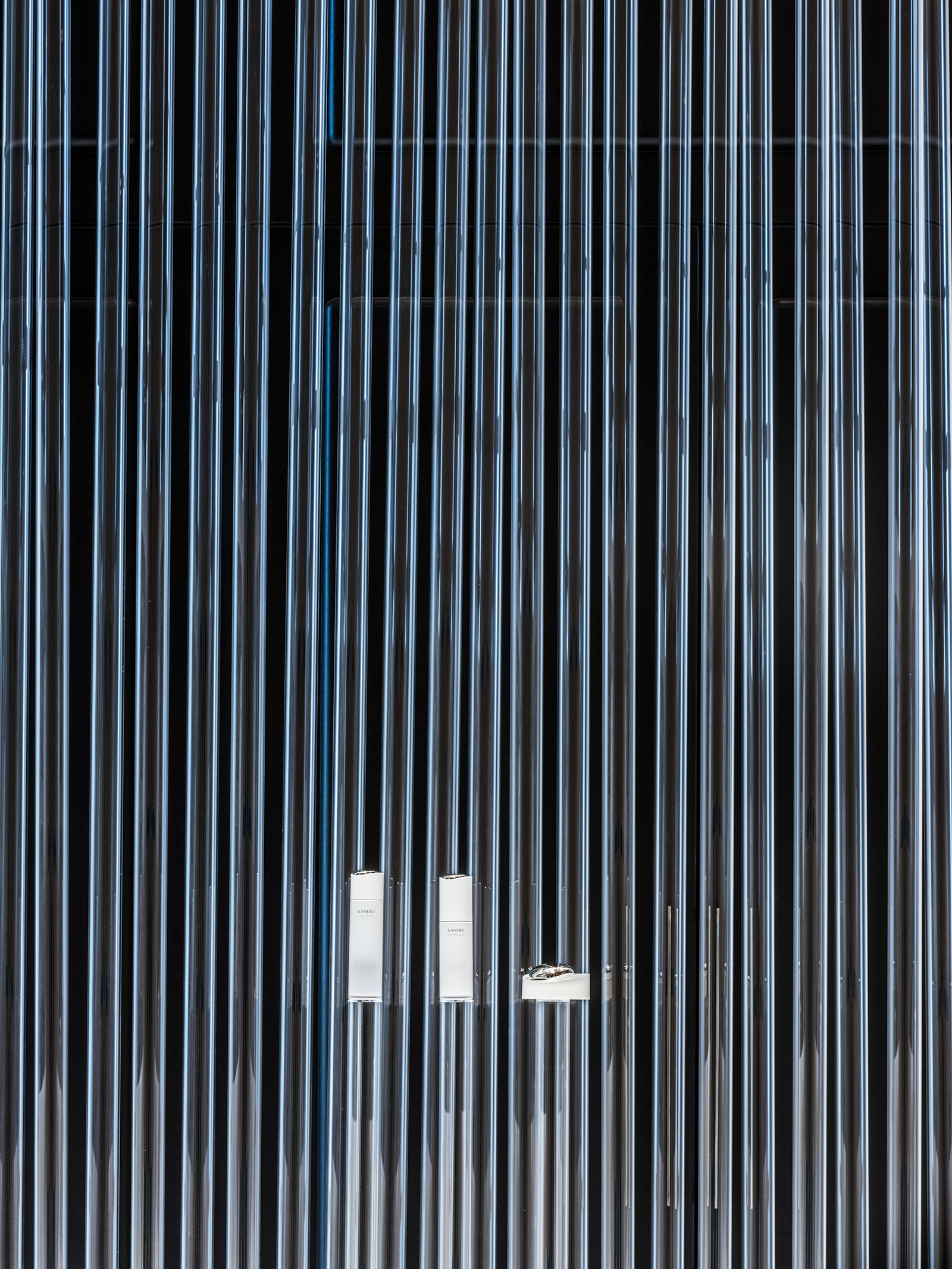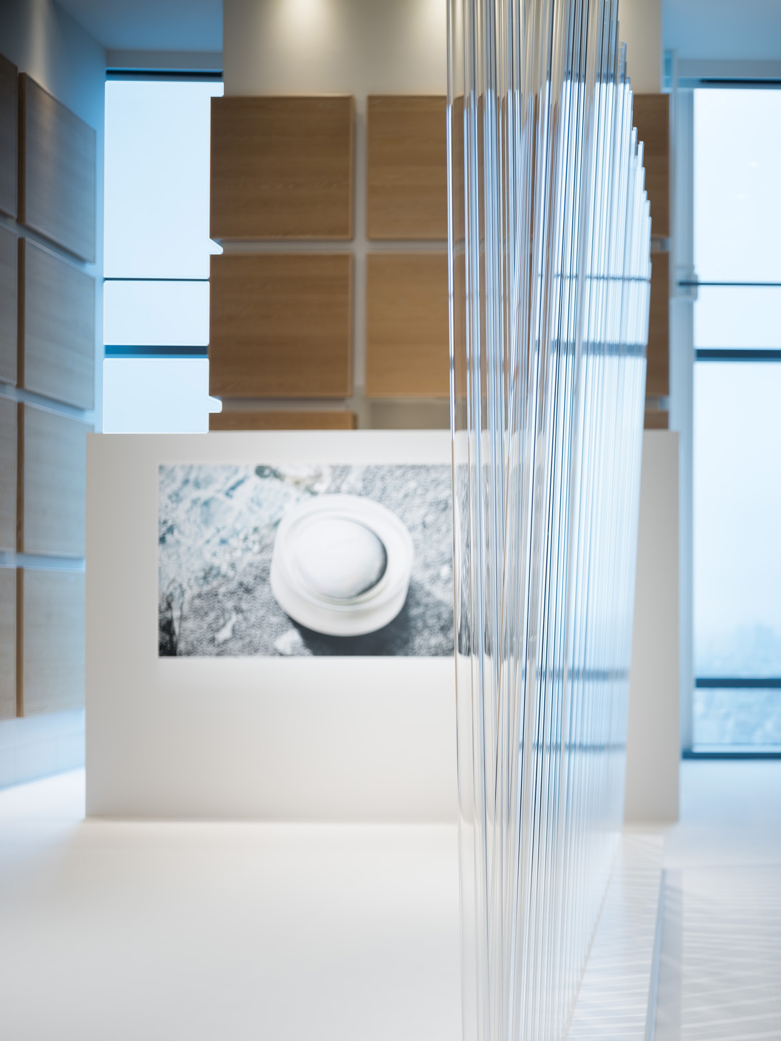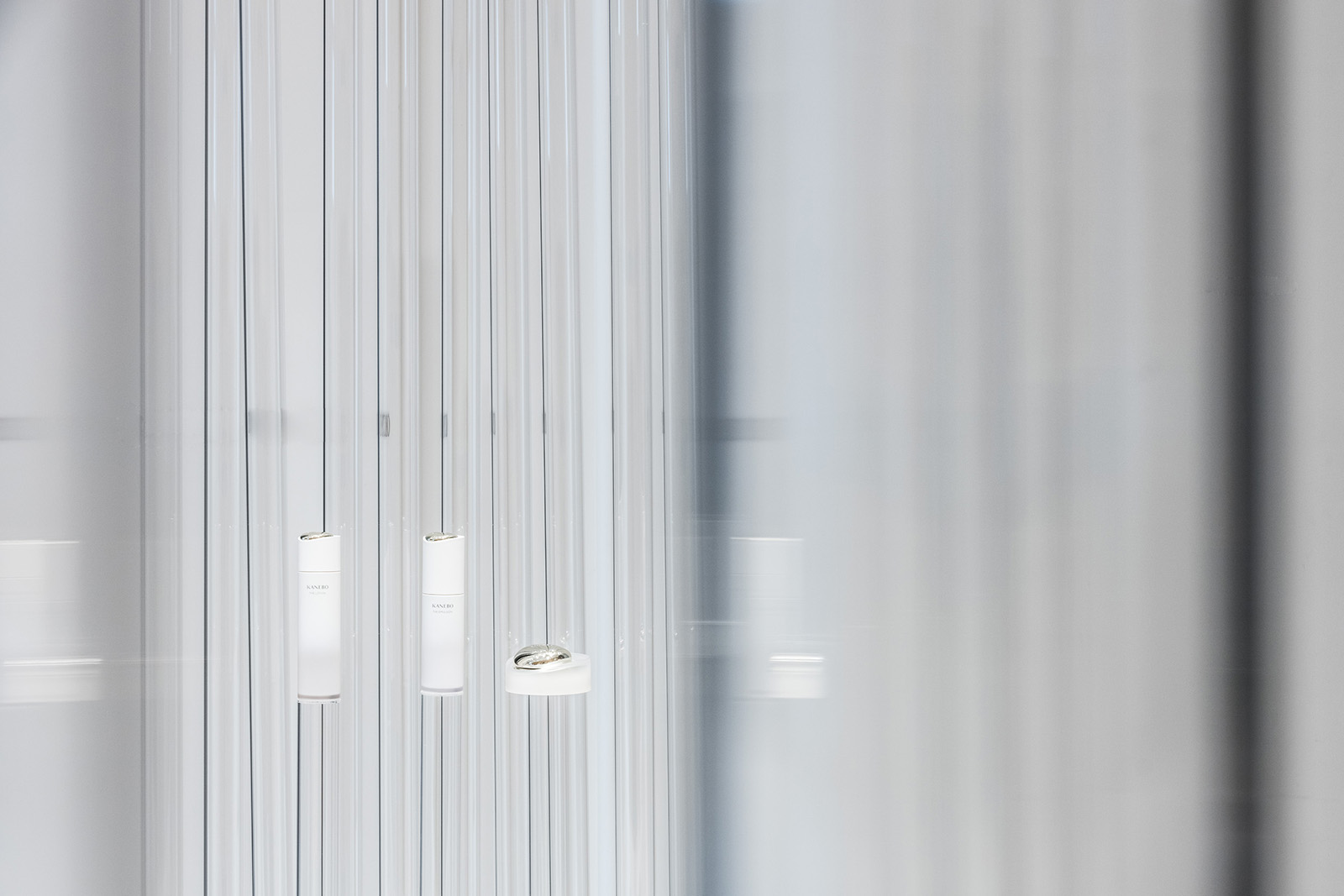 Event space for new product launch of Japanese cosmetic brand Kanebo in Andaz Hotel, Tokyo. The space at Andaz Hotel, Tokyo has been filled by 3 meter long acrylic tubes, emphasizing the concept of skin transparency and clarity, influenced by Kanebo's new cosmetic products. Like a cleansed skin, transparent and refined, pure space surrounded by layers of acrylic tubes, implies the feeling of many layers, transparent, creating beautiful luminosity and facets when people pass behind them. The product on display floats within transparent tubes on eye level, creating eye-catching displays between the layers of fragile tubes, for the visitors to encounter. The customers are invited in the event room at Andaz, where they are sat around white, pure tables and encouraged to try the cosmetic products. 'Served' in water-filled acrylic trays, the products look like floating in the water. This presentation tool reflects the same lightness and transparency as the entrance display, creating a place of harmony and purity.