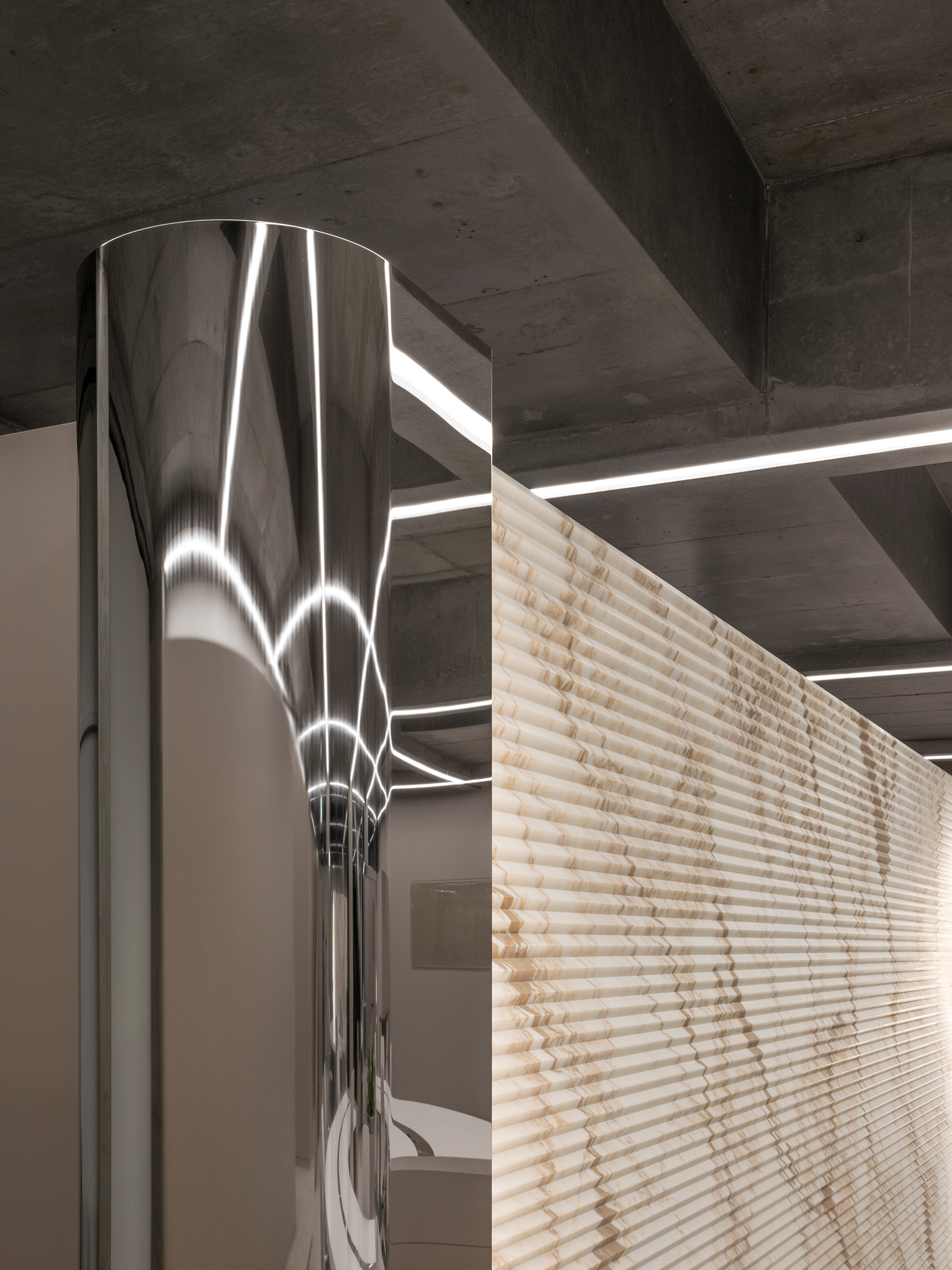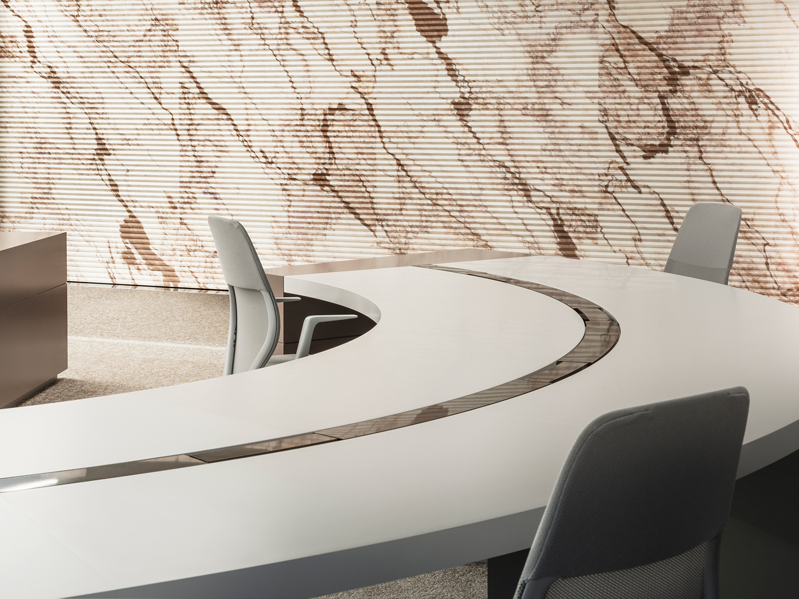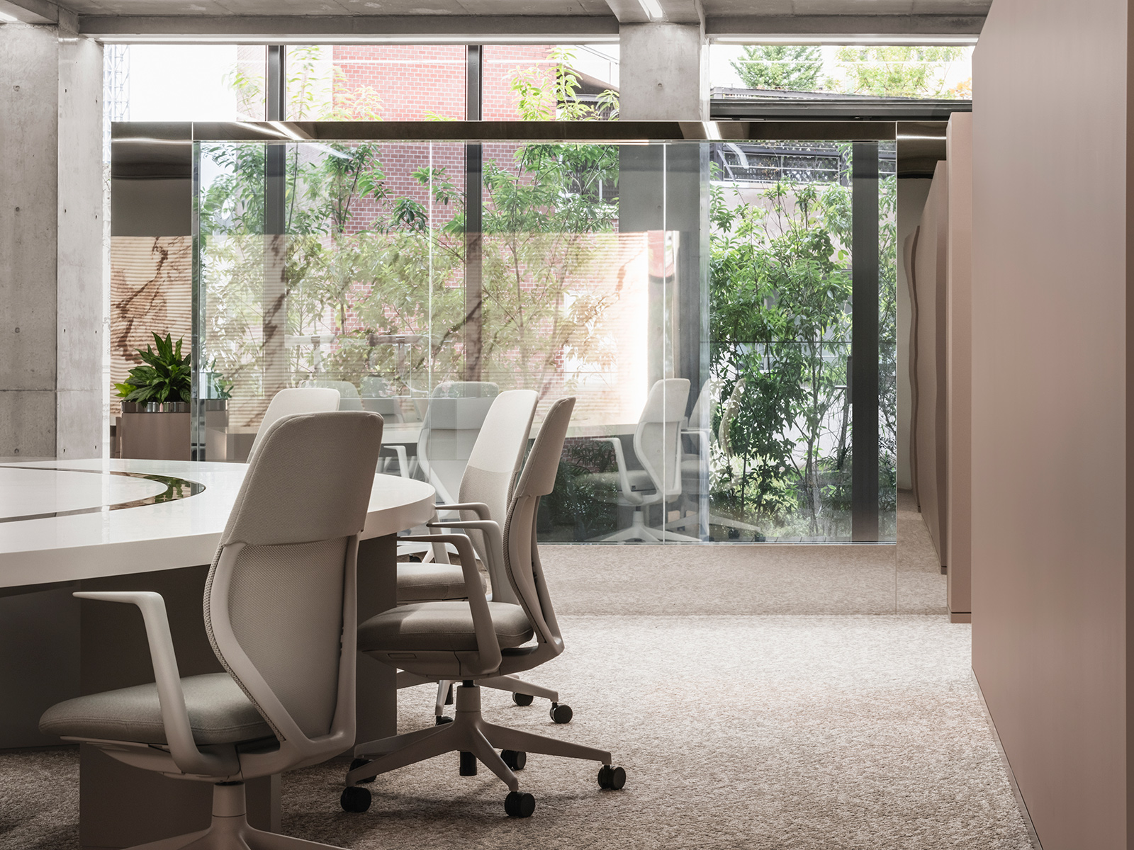 The office design for KINUJO, a brand specializing in hair care products, embodies the brand’s concept of “wearing refined beauty” through a sophisticated yet impactful approach. A glass partition between the entrance and the main workspace softly connects the external and internal areas, providing a subtle boundary. Reflections from various design elements create layered scenery, enriching the limited space with a visually dynamic experience. At the center of the workspace stands a grand circular desk that brings people together, fostering a strong sense of unity while also allowing for personal privacy by adjusting sightlines. Behind this area, a marble wall with finely carved linear details stands like a painting, symbolizing the delicate elegance and flow of hair. Enveloped by this distinctive office environment, the brand-representative backdrop instills a deep sense of pride and attachment in those who work there.