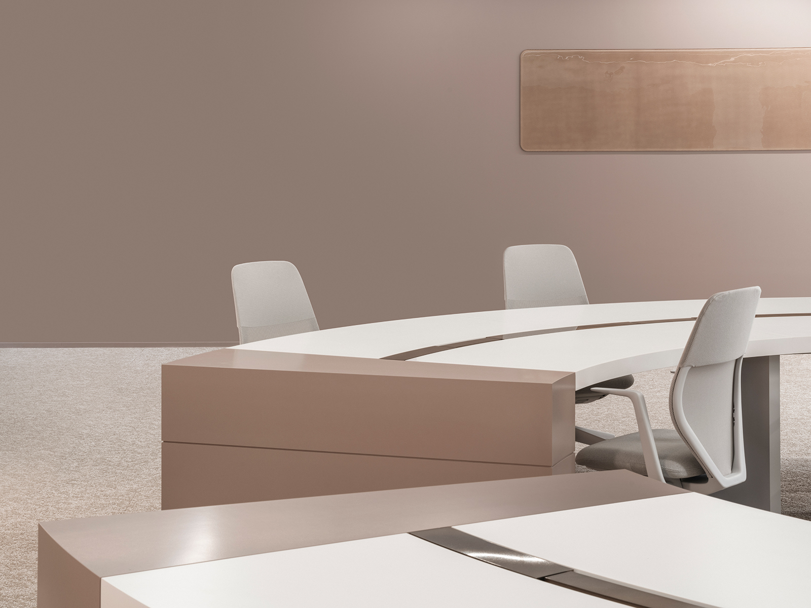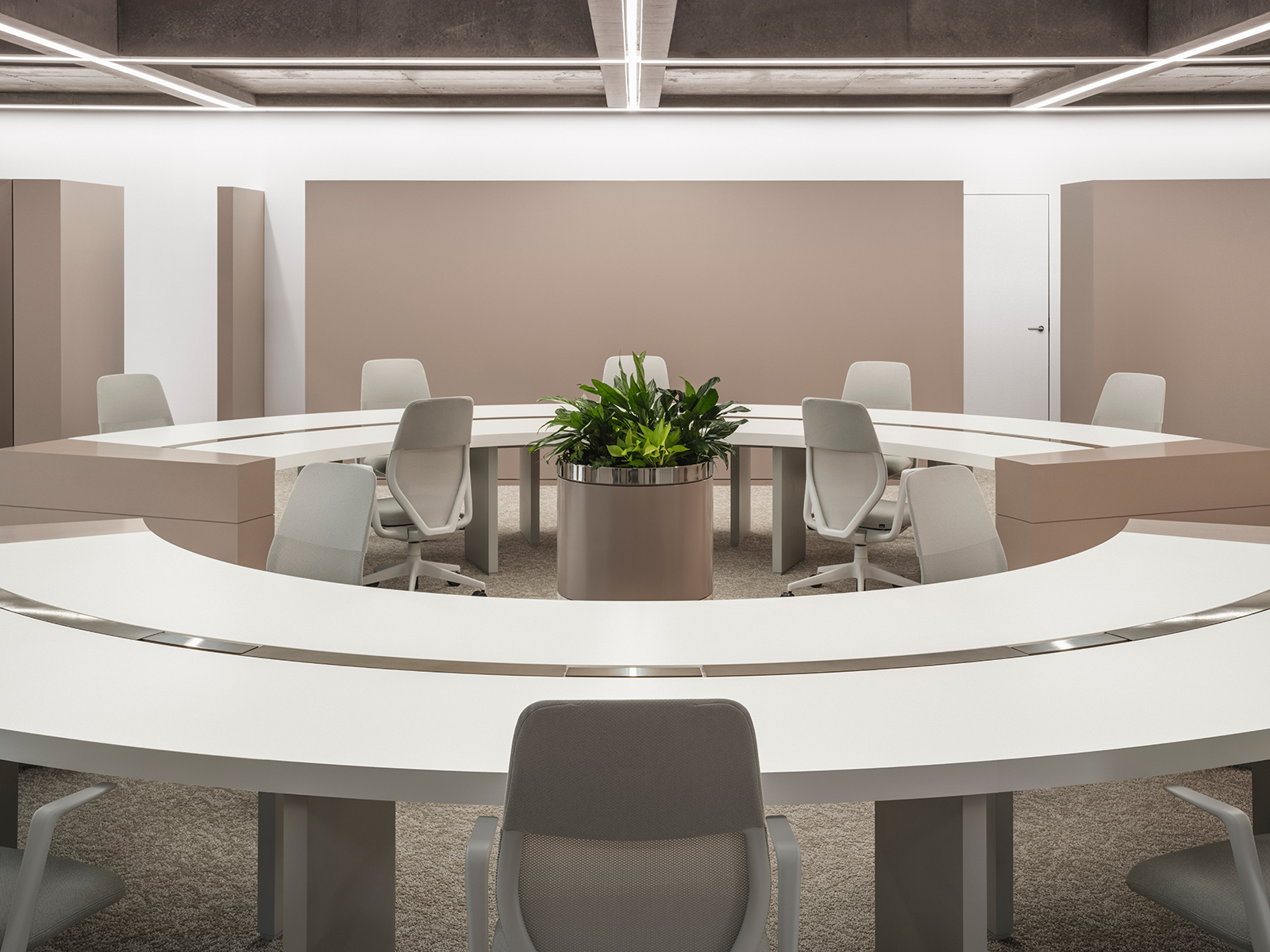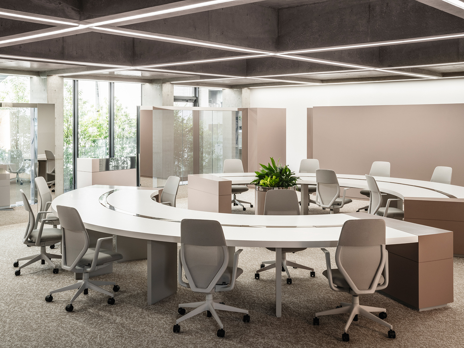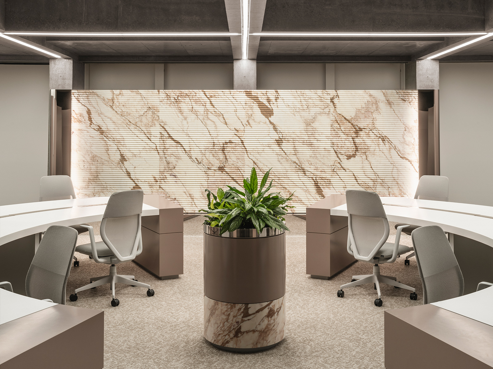 The office design for KINUJO, a brand specializing in hair care products, embodies the brand’s concept of “wearing refined beauty” through a sophisticated yet impactful approach. A glass partition between the entrance and the main workspace softly connects the external and internal areas, providing a subtle boundary. Reflections from various design elements create layered scenery, enriching the limited space with a visually dynamic experience. At the center of the workspace stands a grand circular desk that brings people together, fostering a strong sense of unity while also allowing for personal privacy by adjusting sightlines. Behind this area, a marble wall with finely carved linear details stands like a painting, symbolizing the delicate elegance and flow of hair. Enveloped by this distinctive office environment, the brand-representative backdrop instills a deep sense of pride and attachment in those who work there.