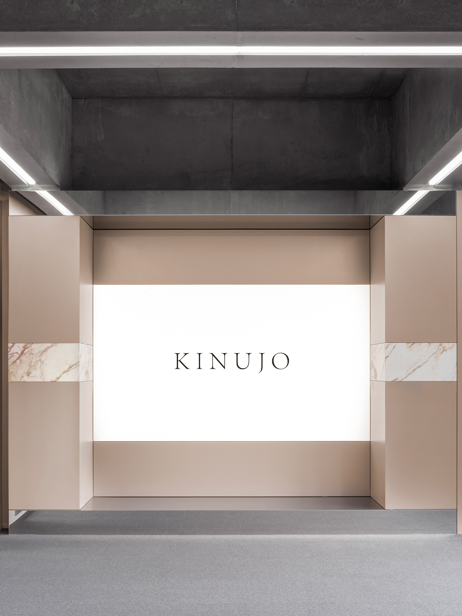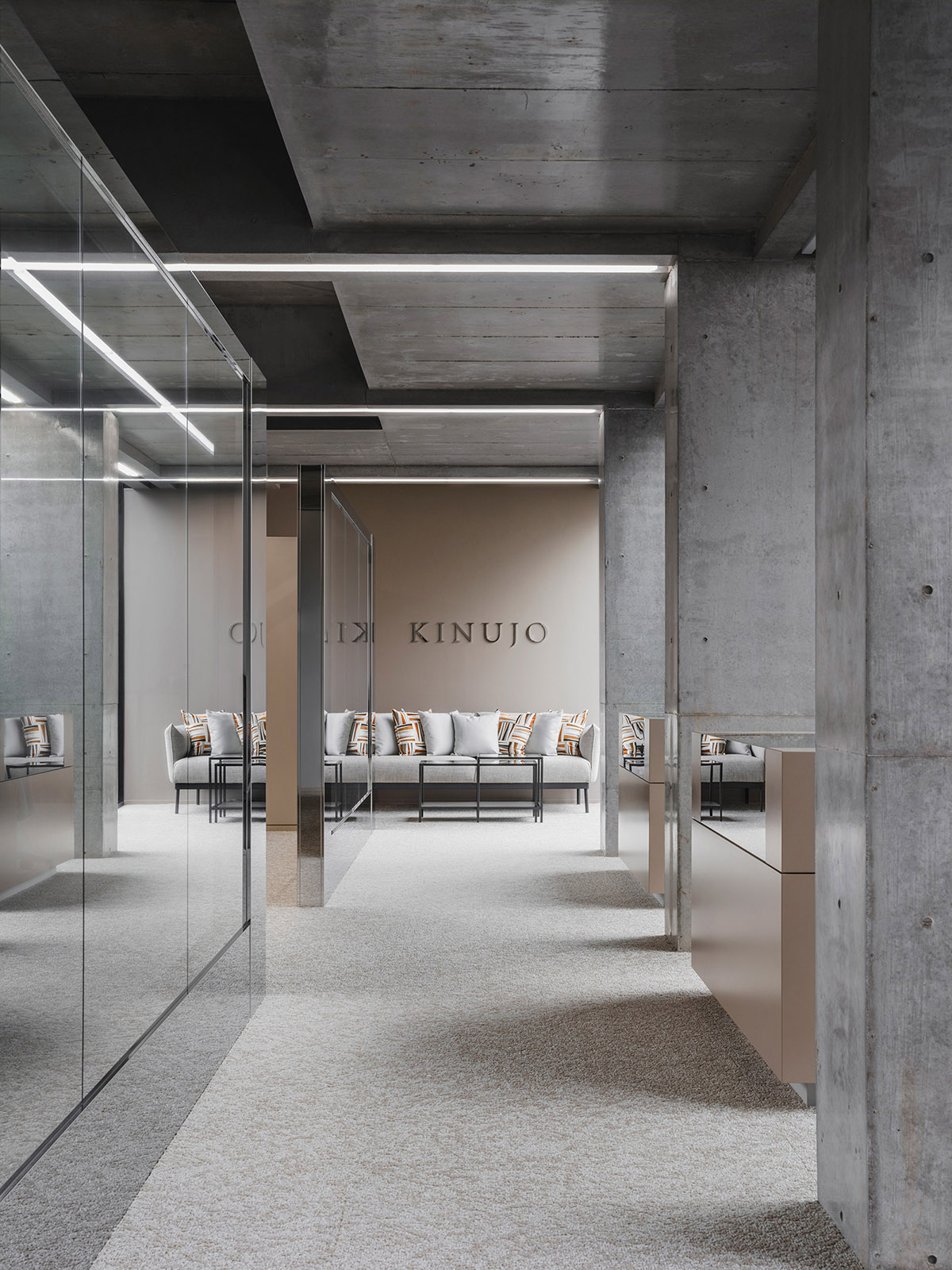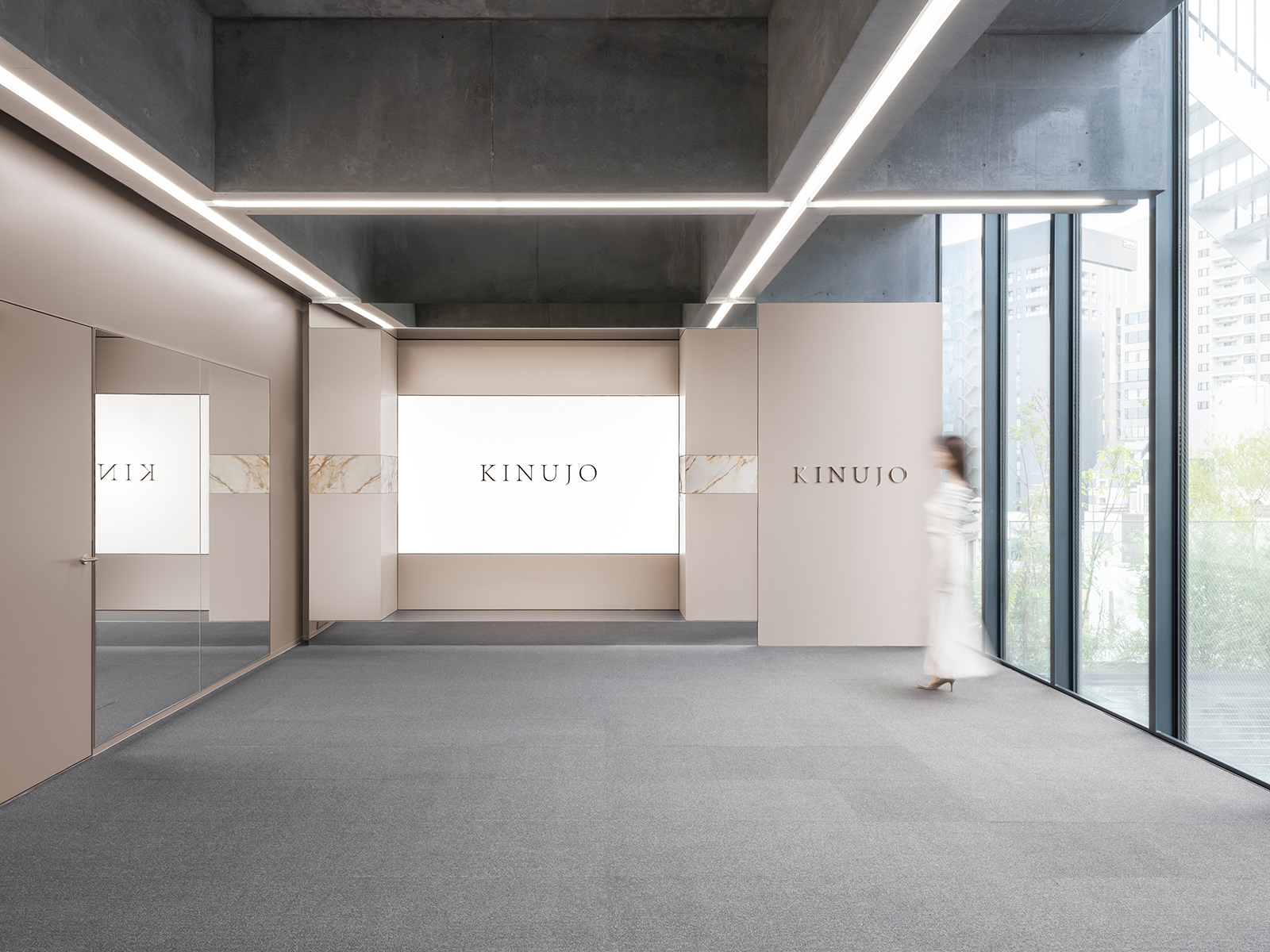 ヘアケア製品を扱うブランド、KINUJOのオフィスデザイン。"洗練された美を纏う"という企業コンセプトを繊細かつ大きなデザインで表現した。エントランスと執務エリア間に存在するガラスパーテションは、外部と内部を遮りながらも柔らかく繋いでいる。様々な要素の反射体が集合することによって風景のレイヤーが重なり、限られた空間の中に豊かなビジュアル体験をつくり出す。執務エリア中央にはゆったりとした円形デスクが堂々と構える。働く人々を一堂に集め、強い一体感を育みながらも、目線を変える事で各々の適度なプライバシーを確保する。中央の背景に佇む絵画のような大理石壁面は、細かな線状の彫り込みが施され、髪の持つ繊細さと優雅な流れを表現している。ブランドを体現する背景に包まれる特別なオフィス空間は、そこで働く人々に強い誇りと愛着を与える。
