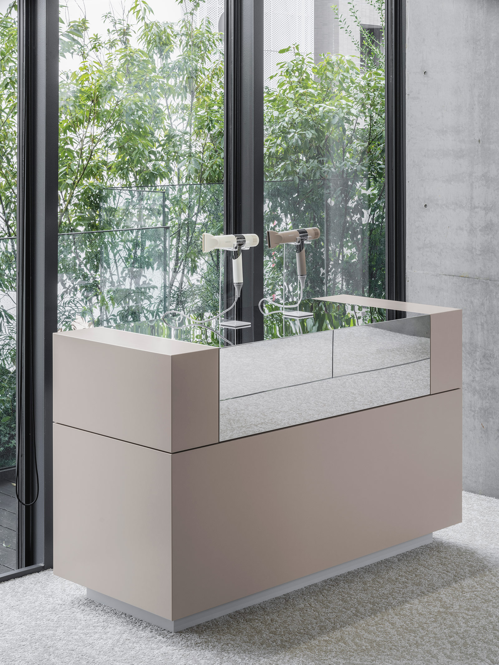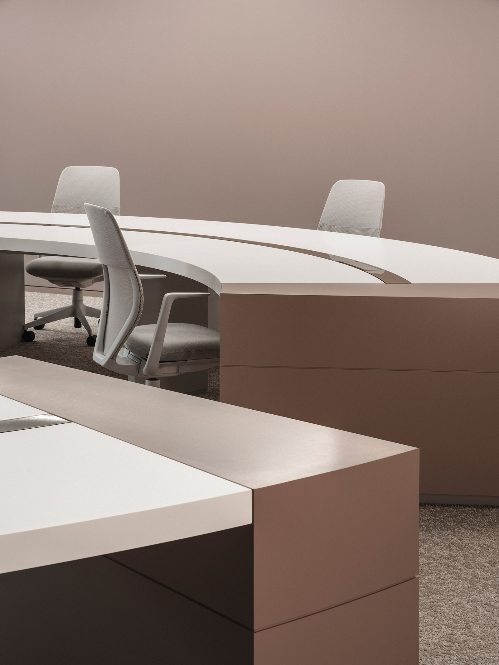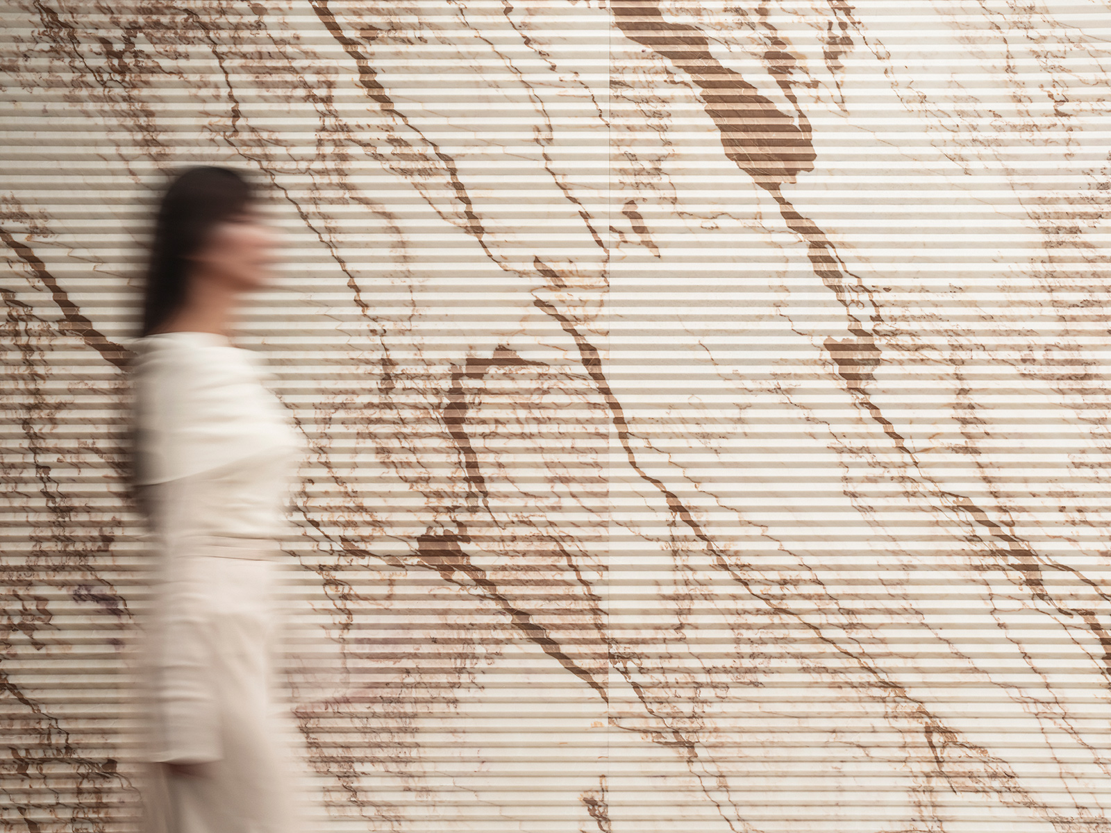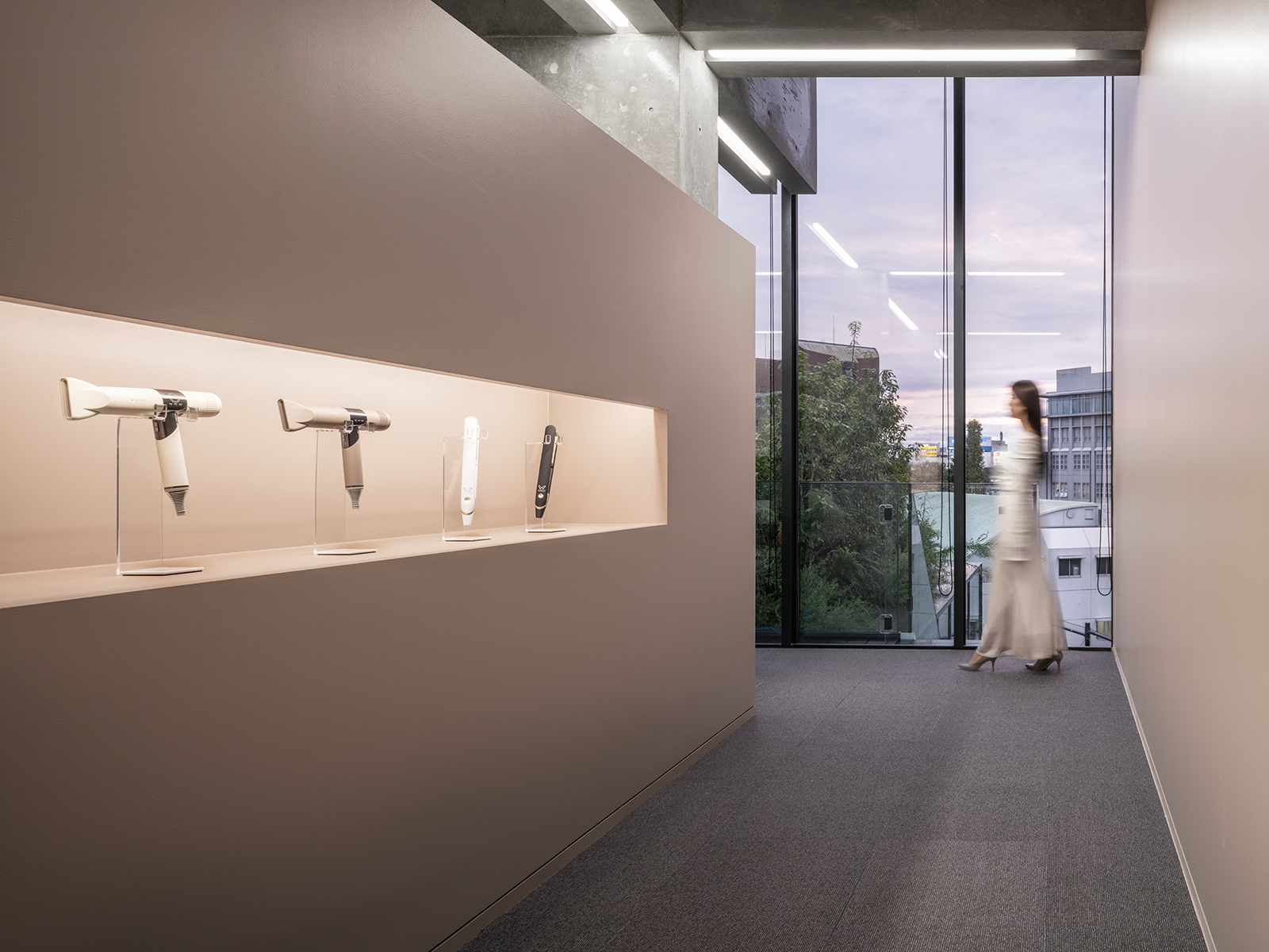 ヘアケア製品を扱うブランド、KINUJOのオフィスデザイン。"洗練された美を纏う"という企業コンセプトを繊細かつ大きなデザインで表現した。エントランスと執務エリア間に存在するガラスパーテションは、外部と内部を遮りながらも柔らかく繋いでいる。様々な要素の反射体が集合することによって風景のレイヤーが重なり、限られた空間の中に豊かなビジュアル体験をつくり出す。執務エリア中央にはゆったりとした円形デスクが堂々と構える。働く人々を一堂に集め、強い一体感を育みながらも、目線を変える事で各々の適度なプライバシーを確保する。中央の背景に佇む絵画のような大理石壁面は、細かな線状の彫り込みが施され、髪の持つ繊細さと優雅な流れを表現している。ブランドを体現する背景に包まれる特別なオフィス空間は、そこで働く人々に強い誇りと愛着を与える。