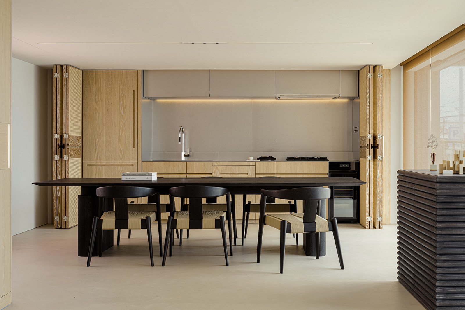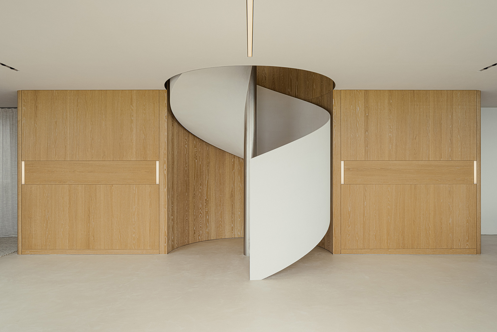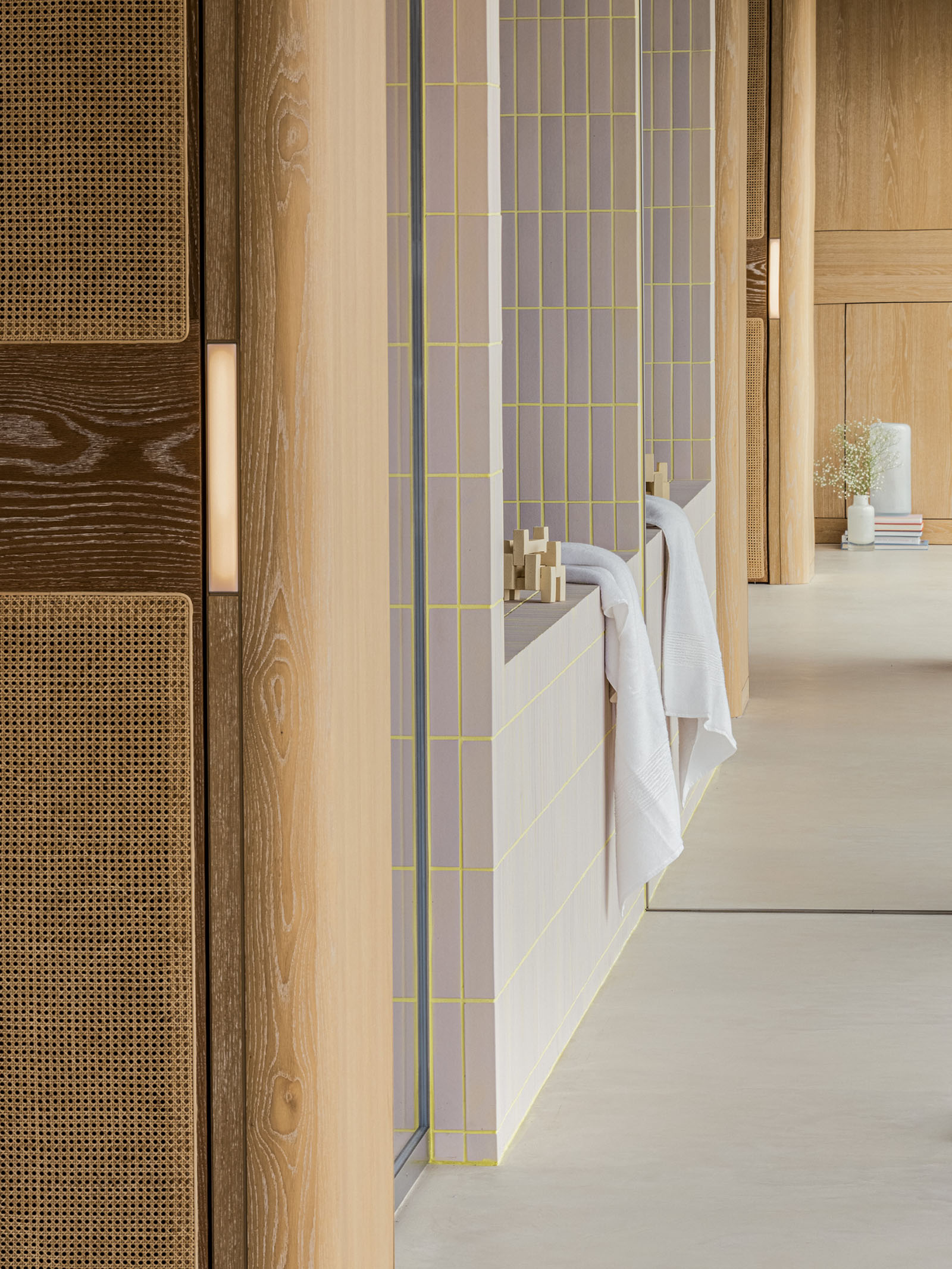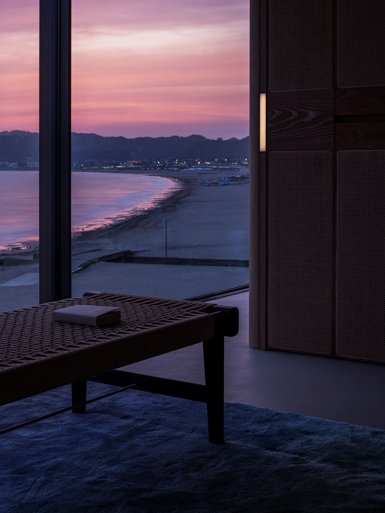 Lulla House is a weekend house that reflects a client’s lifestyle who has launched a fash-ion brand. It serves as both the owner’s residence and the brand’s home. The layout, mate-rials, furniture and details exude elegance, uniqueness, majesty, softness and suggestive-ness. For this house, the design aim was to depict the client’s dignified personality through the space itself. Surrounded by the ocean, the beach and the sky, the location is so overwhelming that you feel like you are part of the environment. Looking out of the window, all elements of the exterior scene are captured within the frame: Waves flowing, birds drifting in the wind, people playing on the beach, a distant coastline with mountains faintly visible and the sun setting between the sea and the sky. The large windows on the west side were designed with a sense of scale, making it feel as if one could physically immerse oneself in the outside world. In the centre of the space, a newly installed spiral staircase awaits visitors, while lights on the walls guide and invite people to each space like a lantern. The wooden pieces in the house were brushed to give an impression of life-like texture. The human sensibilities emanate from the floors and walls, which were me-ticulously finished by hand on-site, enriching the space with a touch of life and ele-gance. On the second floor, light reflected from the sea enters the entire space from the living room to the dining room. To disrupt the monotonous series of wide openings, a solid titanium volume was intentionally inserted between the two. When the titanium volume is opened, it transforms into an entrance from the terrace. It has a very distinct character; an intervening vol-ume that creates a rhythm of natural light within the living/ dining space. The kitchen and closet doors are made of rattan, keeping the design light to allow light and air to pass through. The rat-tan, crafted through the act of weaving, evokes an atmosphere of handcraftsmanship, much like the process of making clothes. The third floor of Lulla House has a unique layout. Going up the stairs, one would be greeted by an open closet strategically placed at the house’s core – a bright and airy space – to symbolise the centrality of dressing in one’s lifestyle. The open bathroom, which gives one a sense of unity with the ocean, occupies nearly half of the third floor. From the shower room and vanity counter to the bathtub, spaces for inter-acting with water are seamlessly connected. The pink tiles are assembled with yellow grout as an accent, making the space appear fashionably playful, echoing the process of working with cloth and thread. All the furniture was designed with the client’s individual character in mind. A dignified appearance, graceful figure and pure ideas, all of which harmonise beautifully together under one roof.
