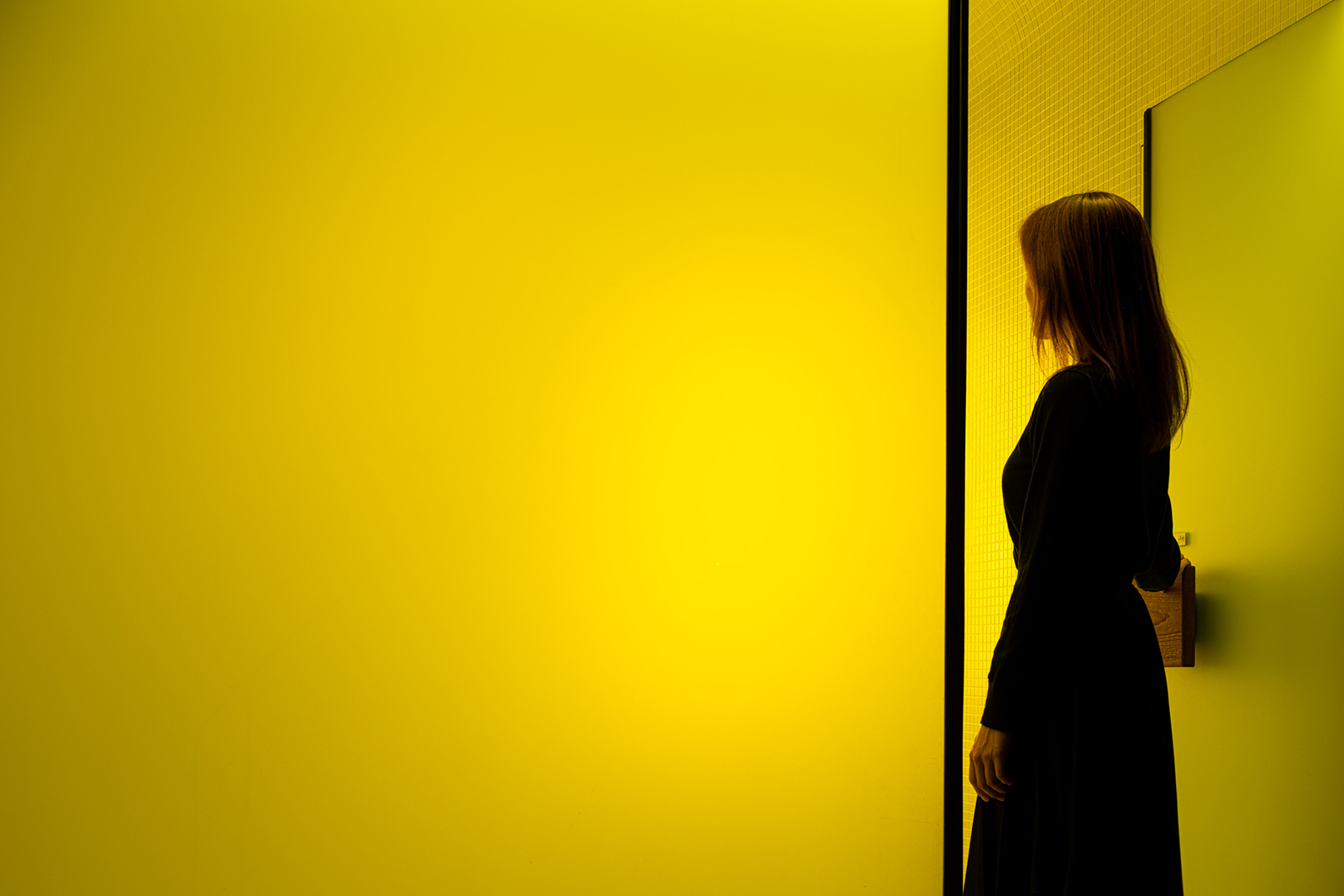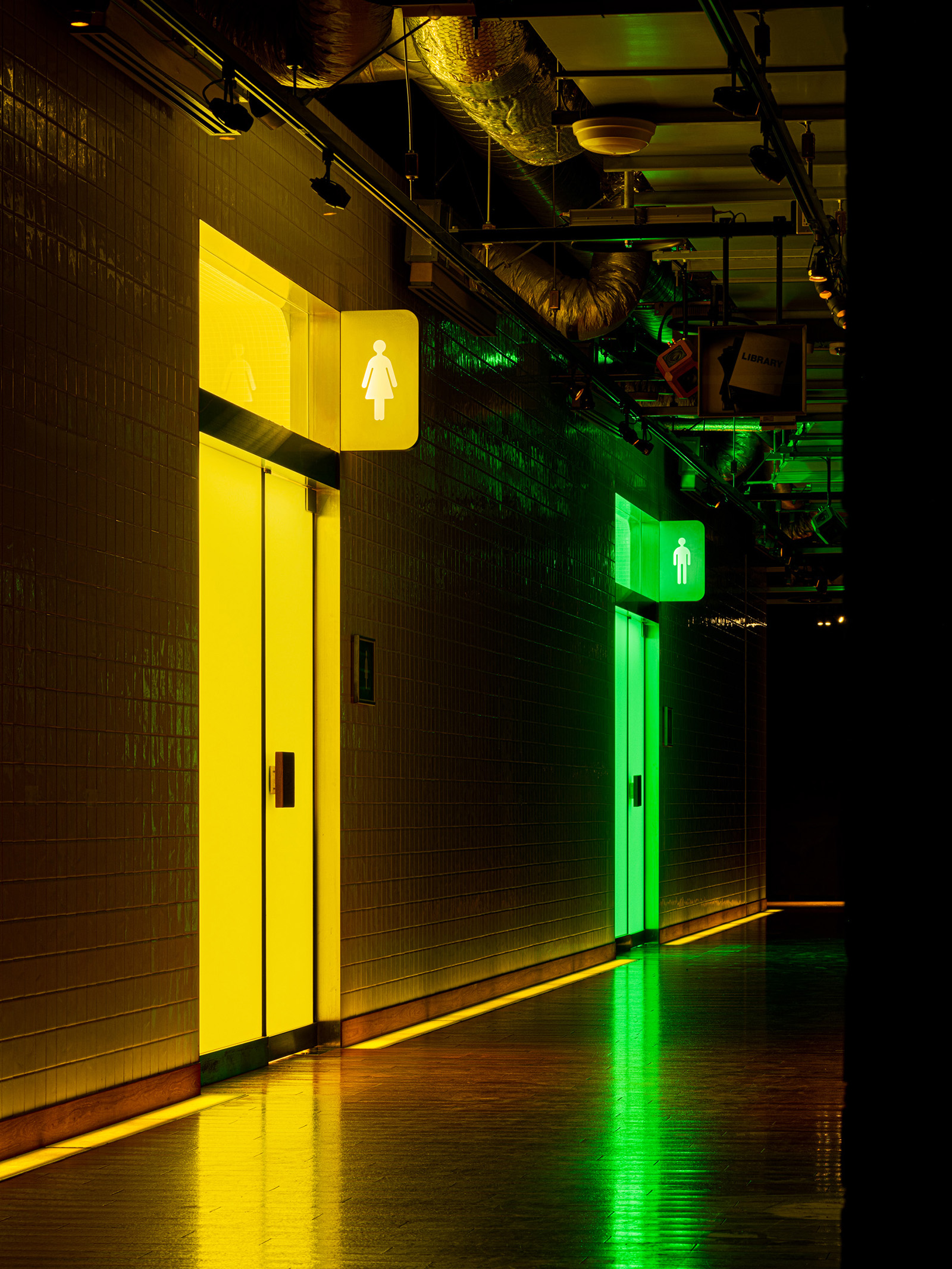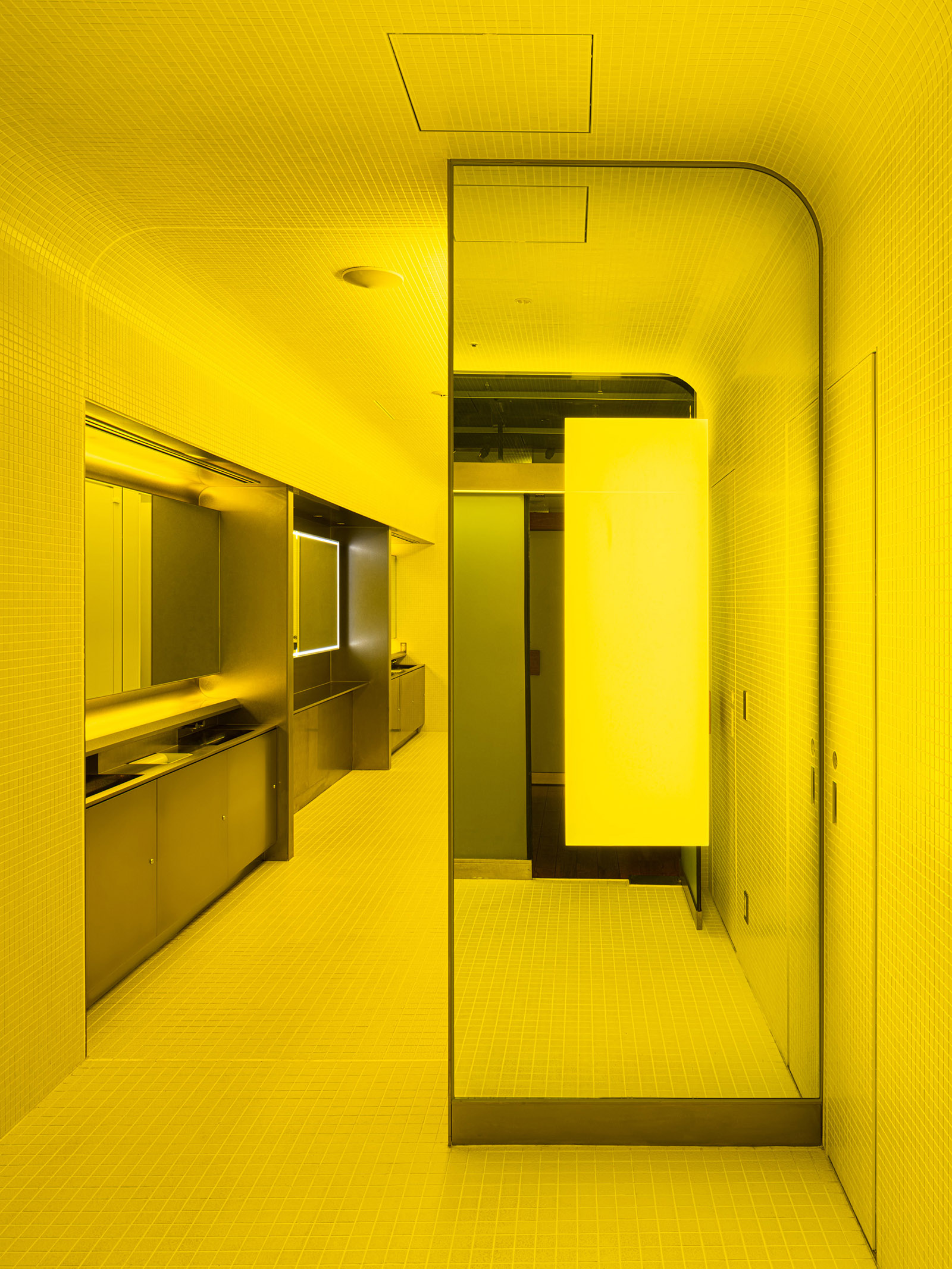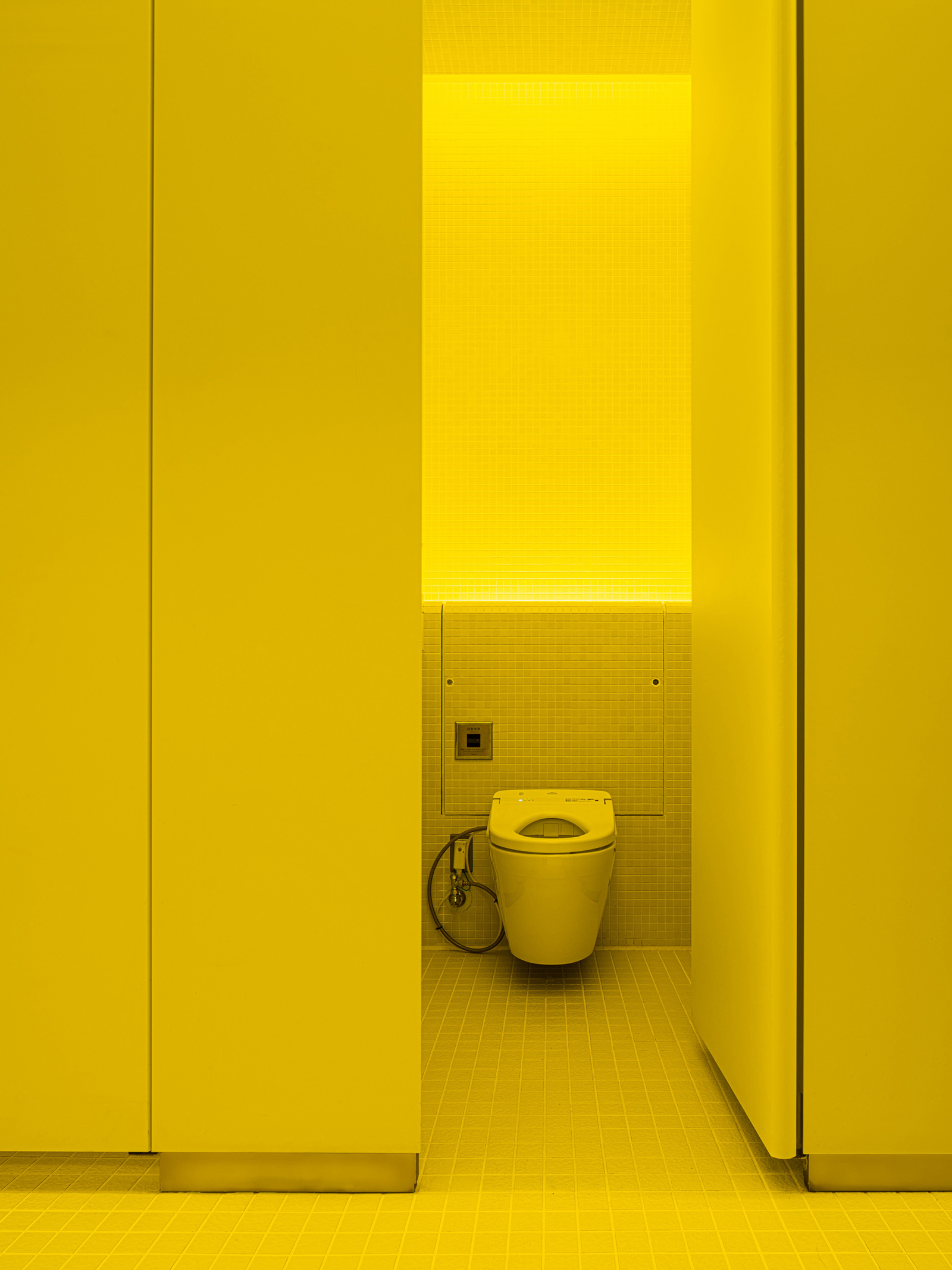 新丸の内ビルディング、飲食フロア内、"marunouchi HOUSE" 内のパブリックトイレ。ジェンダーを示す色の新しい在り方の提案。多様性の象徴であるレインボーカラーにおいて、隣合う黄色と緑色の2色を用いることで、ジェンダーの隔たりを和らげる表現とする事を試みた。それぞれの色が空間の中一杯に広がり、訪れる人は光の色彩を体全体で体験する事ができる。床、壁、天井を構成する白いタイルは清潔感を強調し、その表面の凹凸が光を受けることによって繊細な陰影を生み出している。金物で構成された特注洗面カウンターが空間の中で強い存在感を放ちながら、集まる人々を包み込む新たな手洗いの行為を提案している。光の色によって洗い流されるような感覚が、トイレでの全ての体験要素を非日常的なものへと転換し、訪れる人に強い印象を残していく。