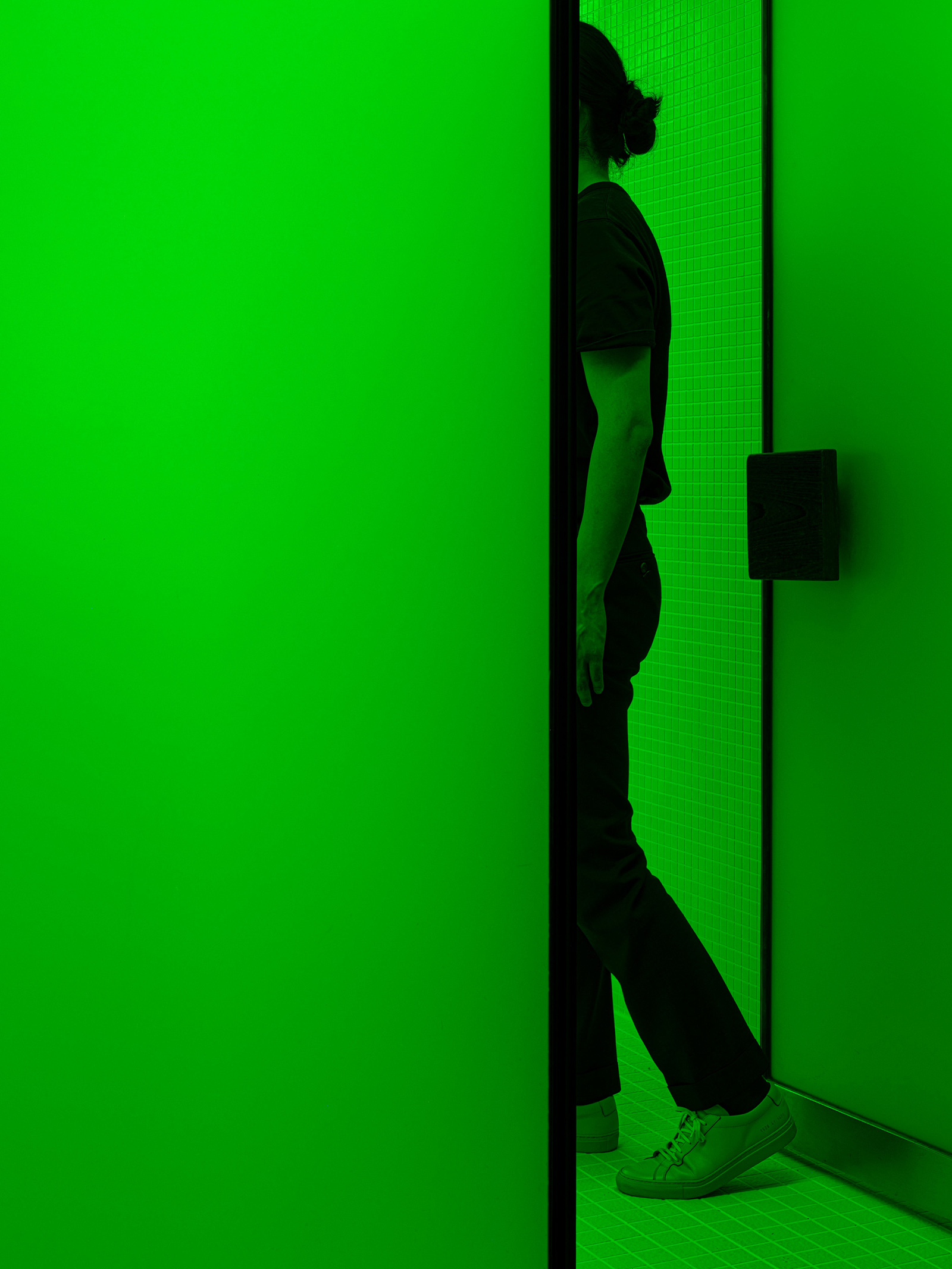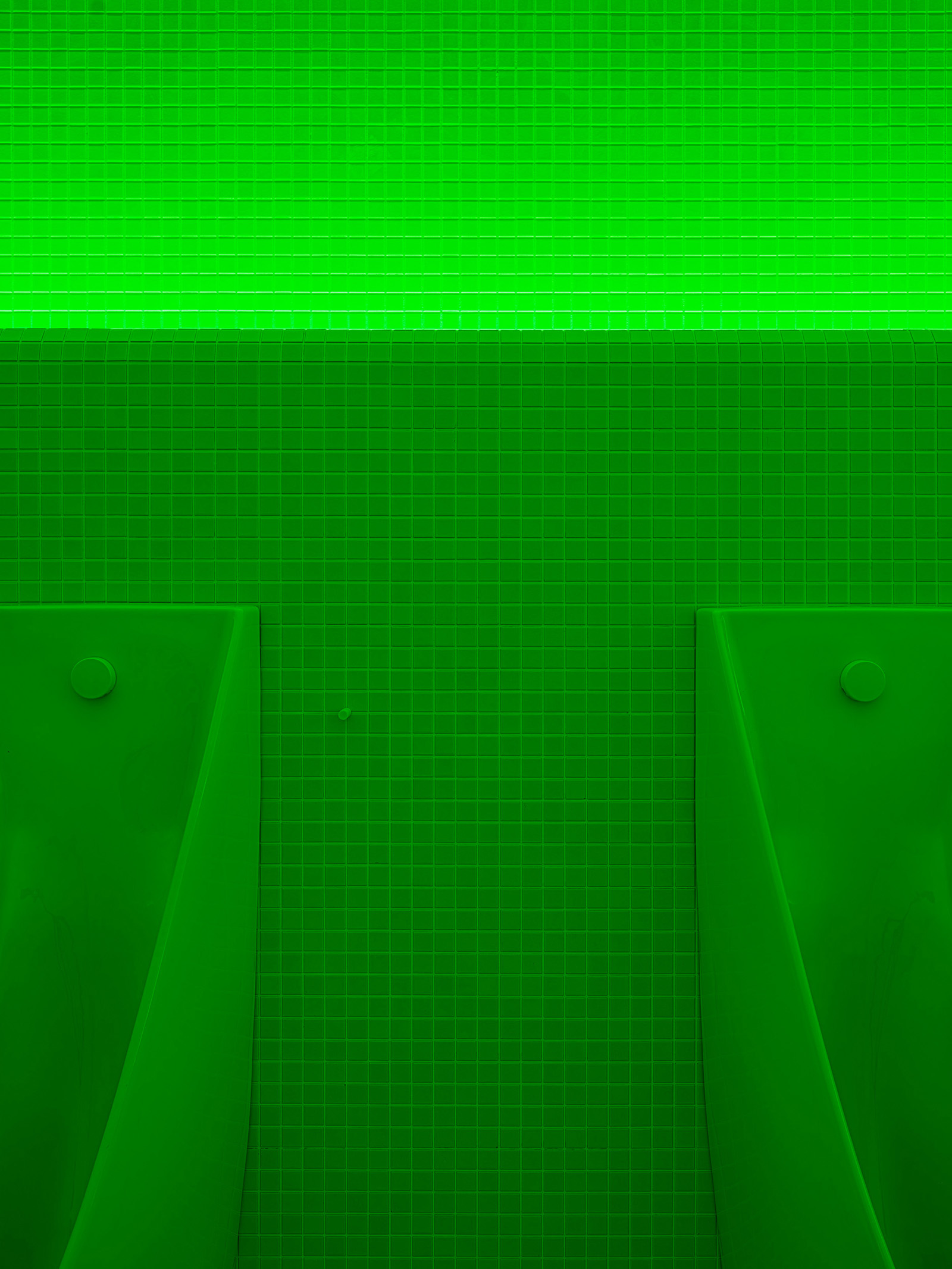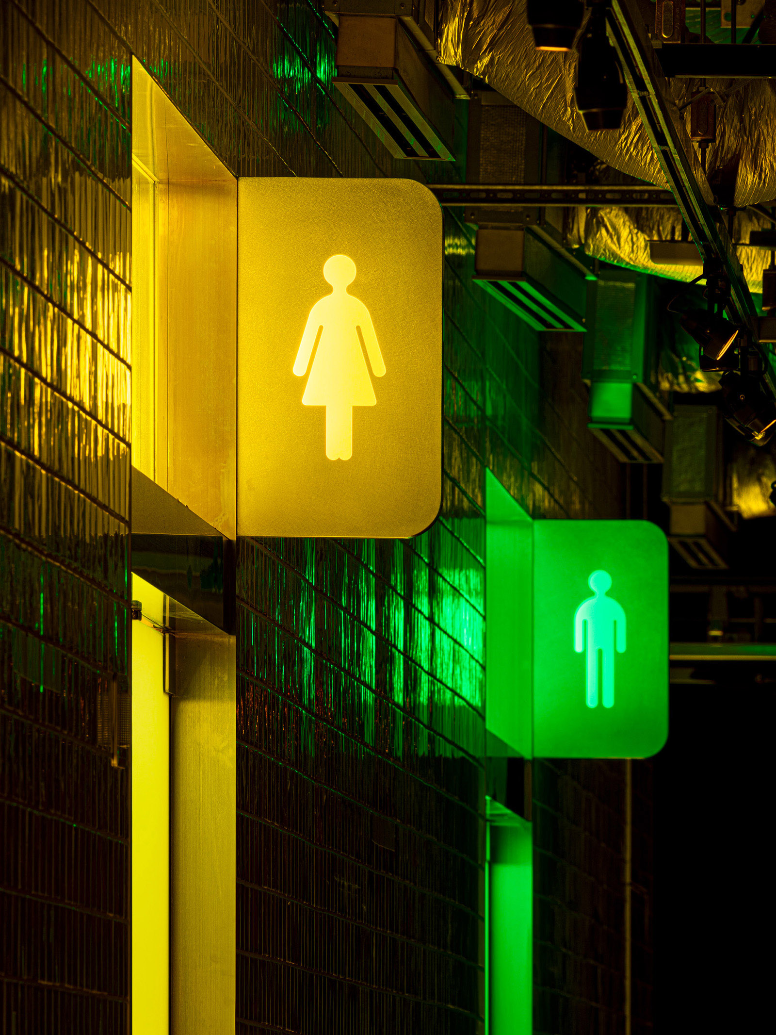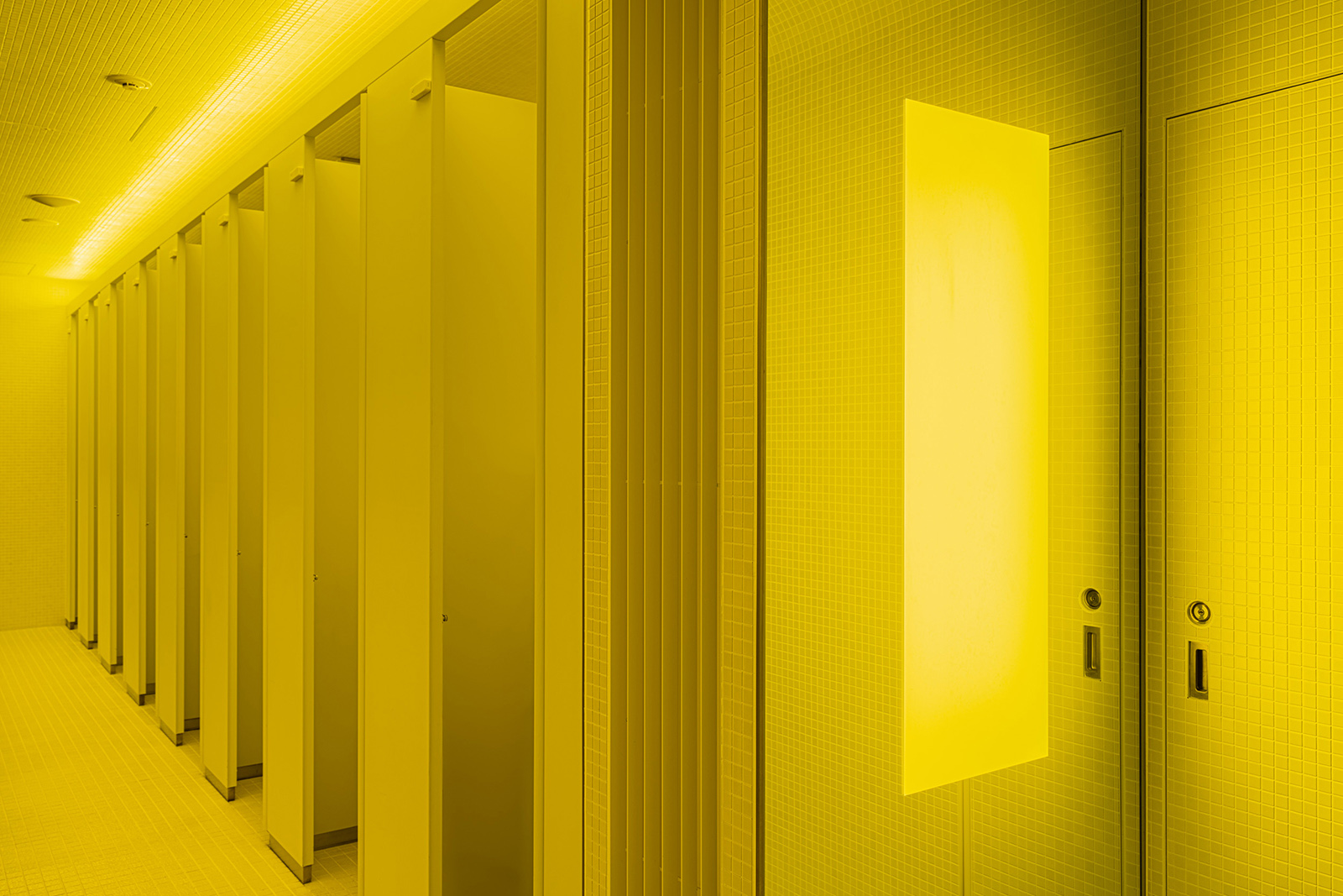 This public restroom of the ‘marunouchi HOUSE’ restaurant floor of the Shin-Marunouchi Building proposes an innovative use of colour to blur the boundaries between gender. Yellow and green, two central and adjacent colours of the rainbow, a symbol of gender diversity, soften the gender divide long associated with conventional codes of red and blue. Inside, coloured light permeates the spaces, allowing visitors to experience the hues with their entire bodies. White tiling throughout — across floors, walls and ceilings — emphasises cleanliness, its uneven textured surfaces creating subtle shadows as they catch the light. The strong presence of long, custom-made silver washbasins presents a new kind of restroom ritual, their curved and rounded structures embracing visitors’ hands as they wash. The sensation of being saturated by the colour of light transforms all elements of the restroom experience into something extraordinary, leaving a powerful lasting impression on the visitor.