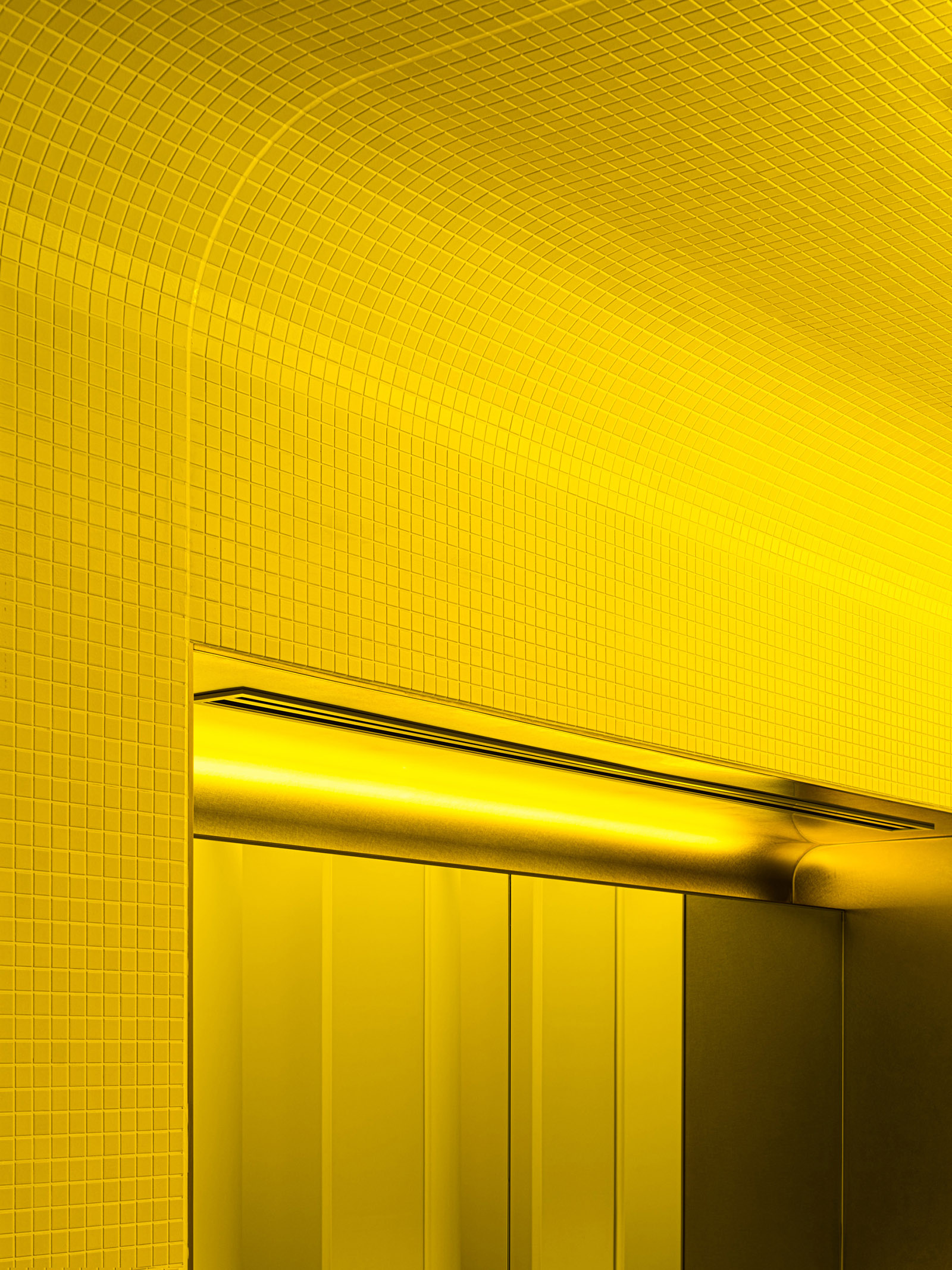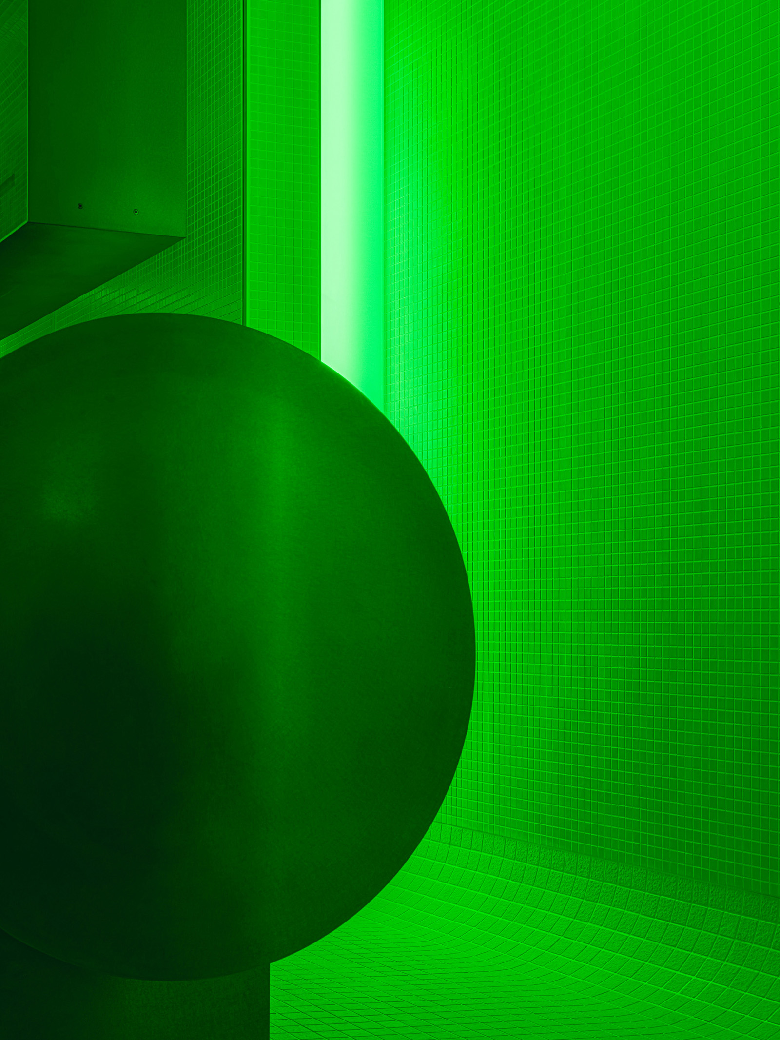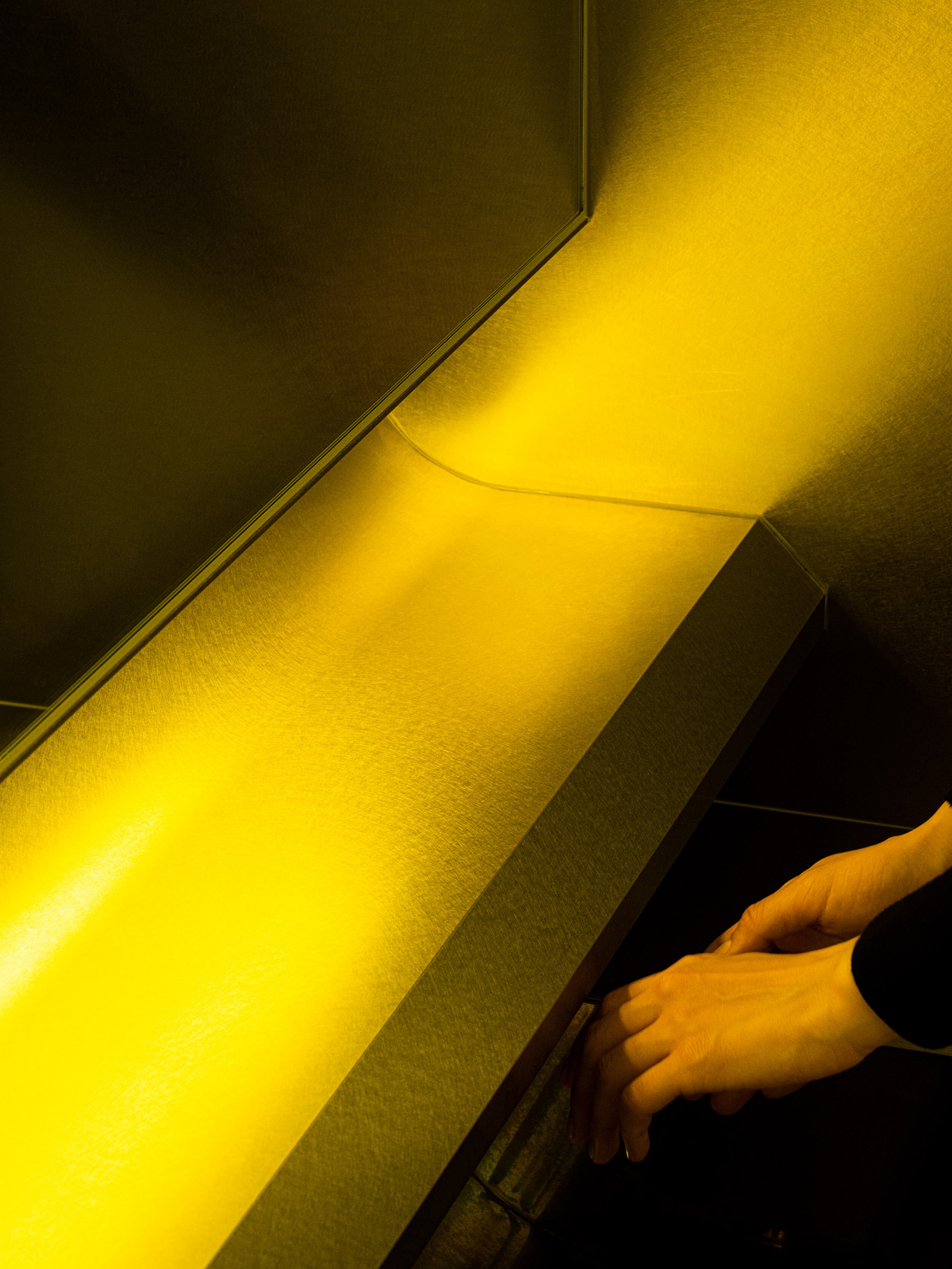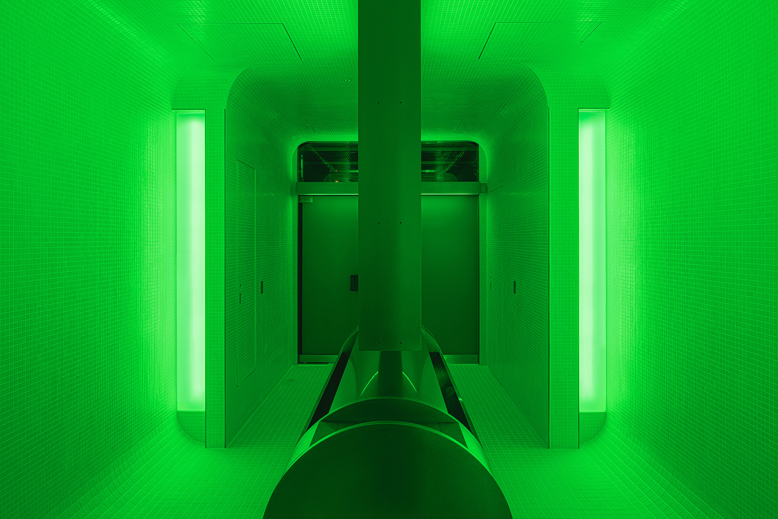 This public restroom of the ‘marunouchi HOUSE’ restaurant floor of the Shin-Marunouchi Building proposes an innovative use of colour to blur the boundaries between gender. Yellow and green, two central and adjacent colours of the rainbow, a symbol of gender diversity, soften the gender divide long associated with conventional codes of red and blue. Inside, coloured light permeates the spaces, allowing visitors to experience the hues with their entire bodies. White tiling throughout — across floors, walls and ceilings — emphasises cleanliness, its uneven textured surfaces creating subtle shadows as they catch the light. The strong presence of long, custom-made silver washbasins presents a new kind of restroom ritual, their curved and rounded structures embracing visitors’ hands as they wash. The sensation of being saturated by the colour of light transforms all elements of the restroom experience into something extraordinary, leaving a powerful lasting impression on the visitor.