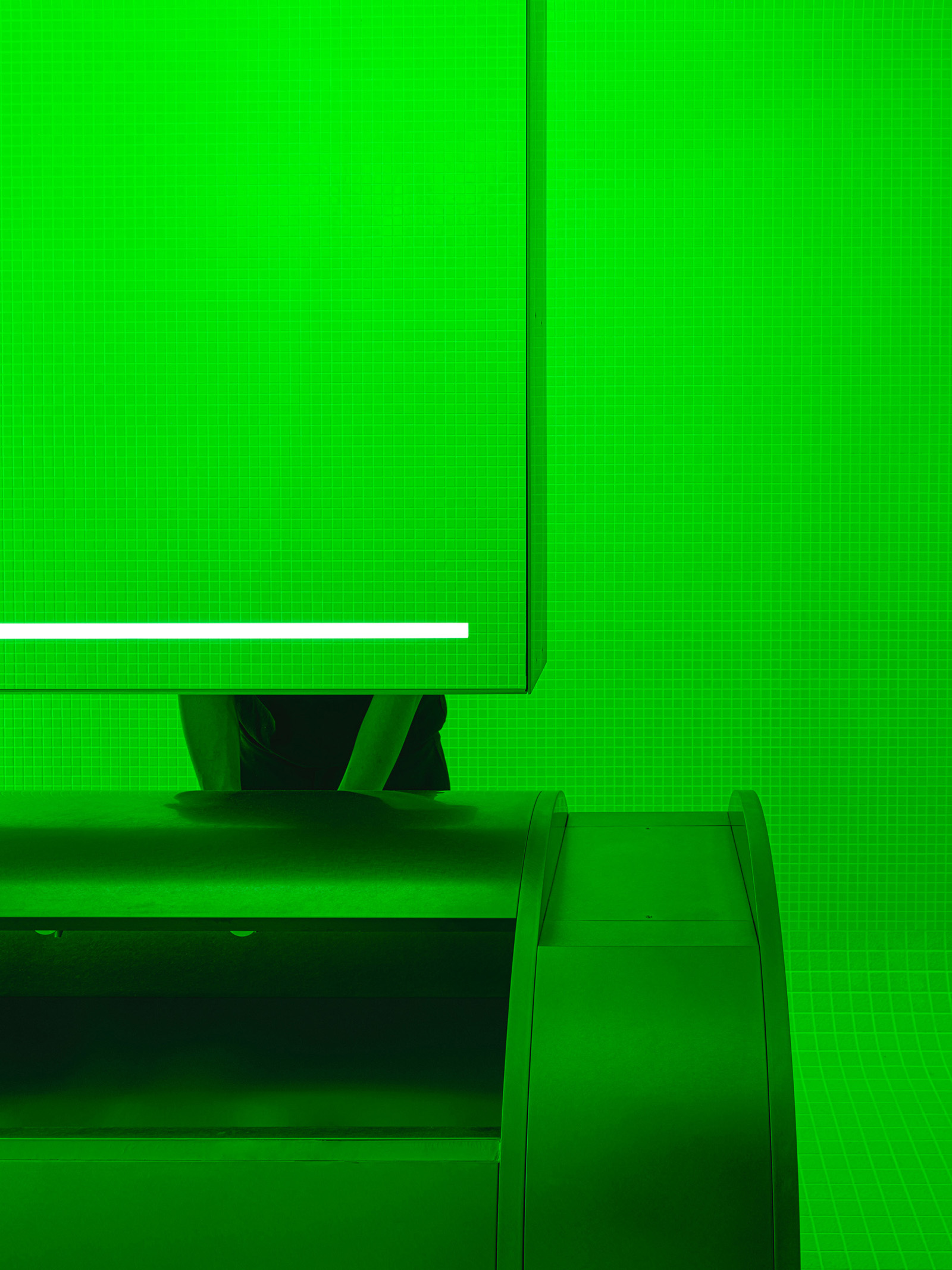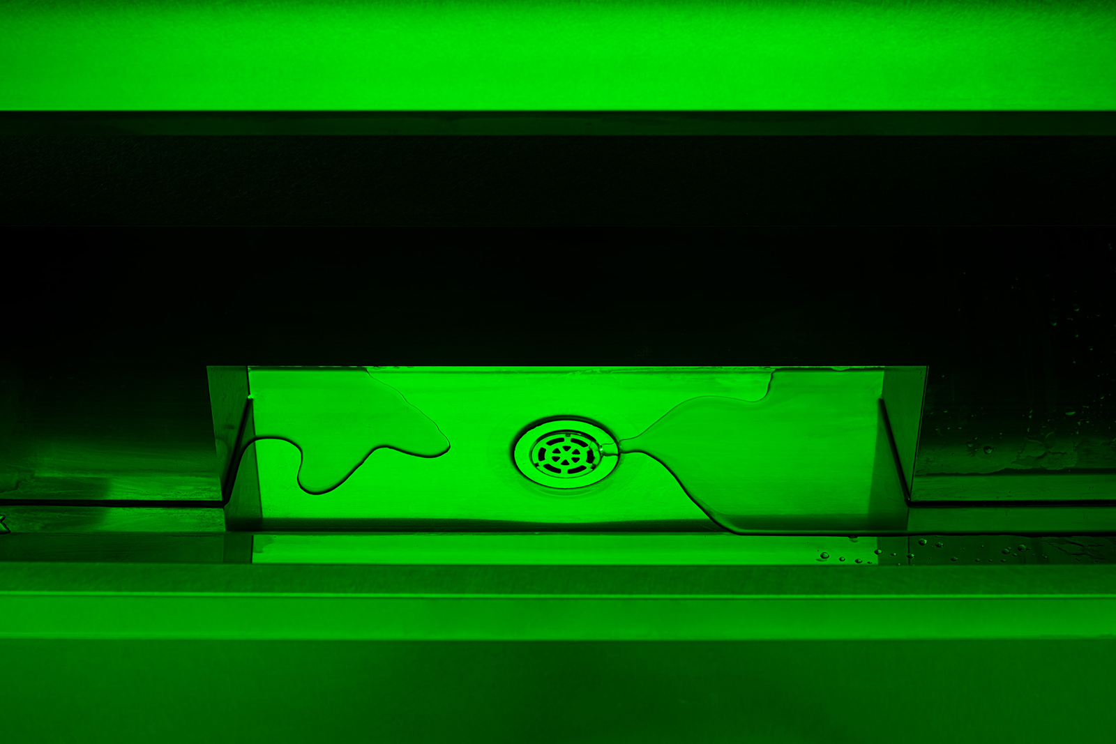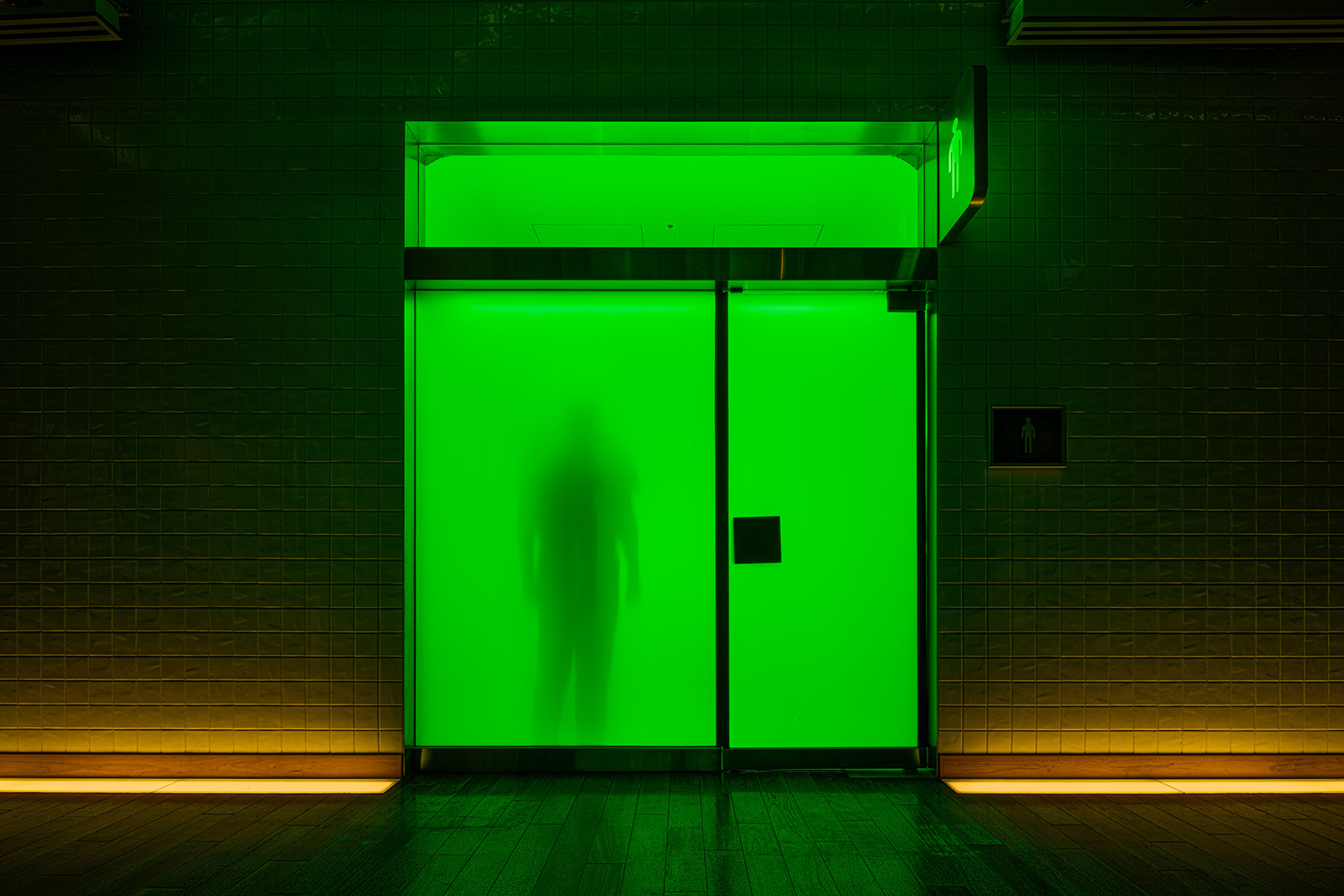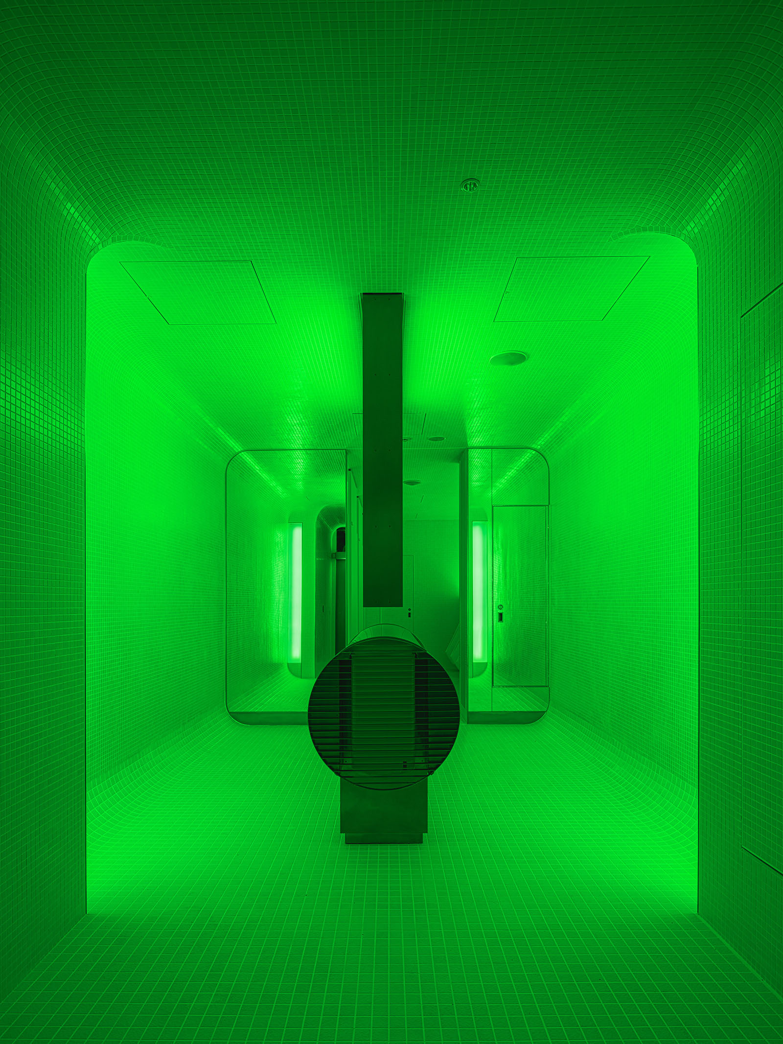 This public restroom of the ‘marunouchi HOUSE’ restaurant floor of the Shin-Marunouchi Building proposes an innovative use of colour to blur the boundaries between gender. Yellow and green, two central and adjacent colours of the rainbow, a symbol of gender diversity, soften the gender divide long associated with conventional codes of red and blue. Inside, coloured light permeates the spaces, allowing visitors to experience the hues with their entire bodies. White tiling throughout — across floors, walls and ceilings — emphasises cleanliness, its uneven textured surfaces creating subtle shadows as they catch the light. The strong presence of long, custom-made silver washbasins presents a new kind of restroom ritual, their curved and rounded structures embracing visitors’ hands as they wash. The sensation of being saturated by the colour of light transforms all elements of the restroom experience into something extraordinary, leaving a powerful lasting impression on the visitor.