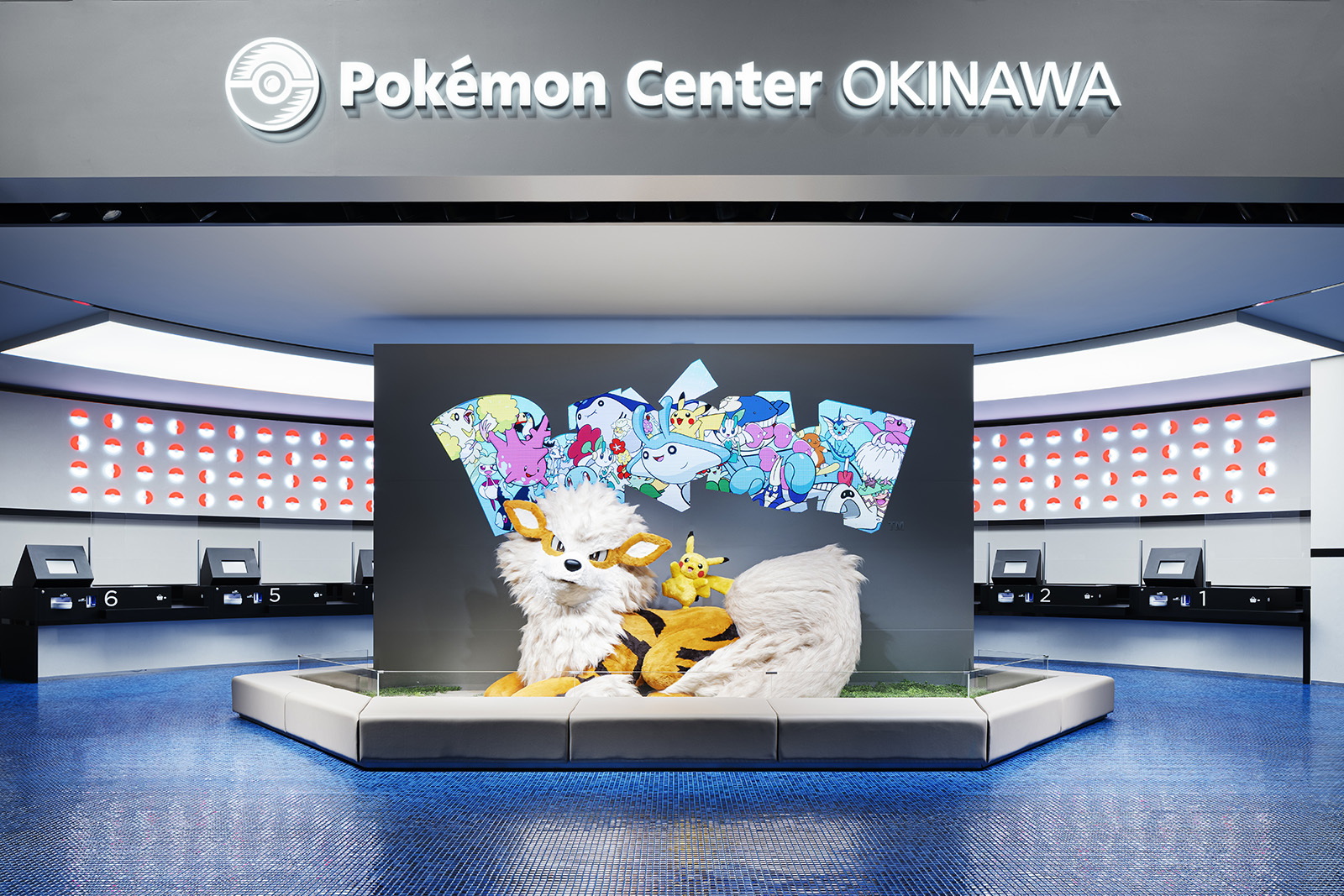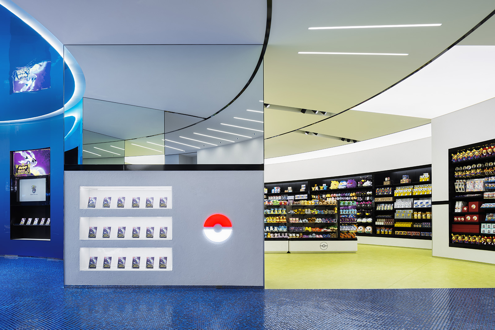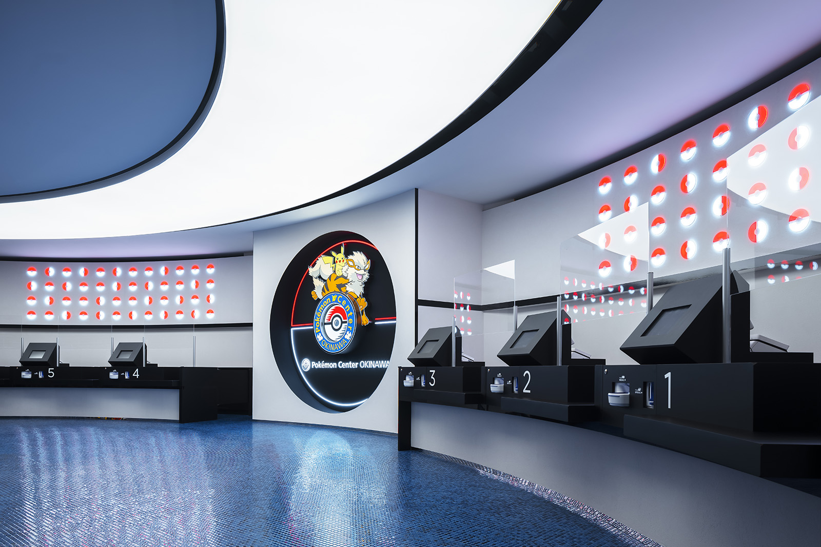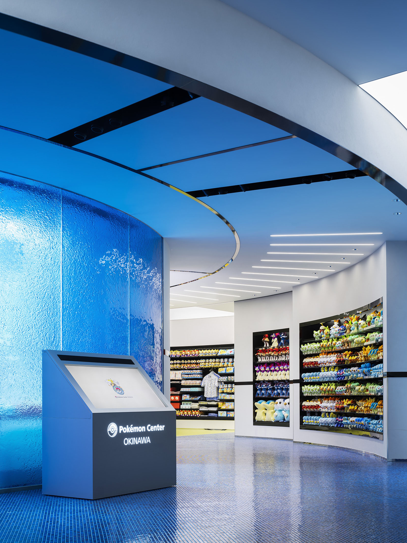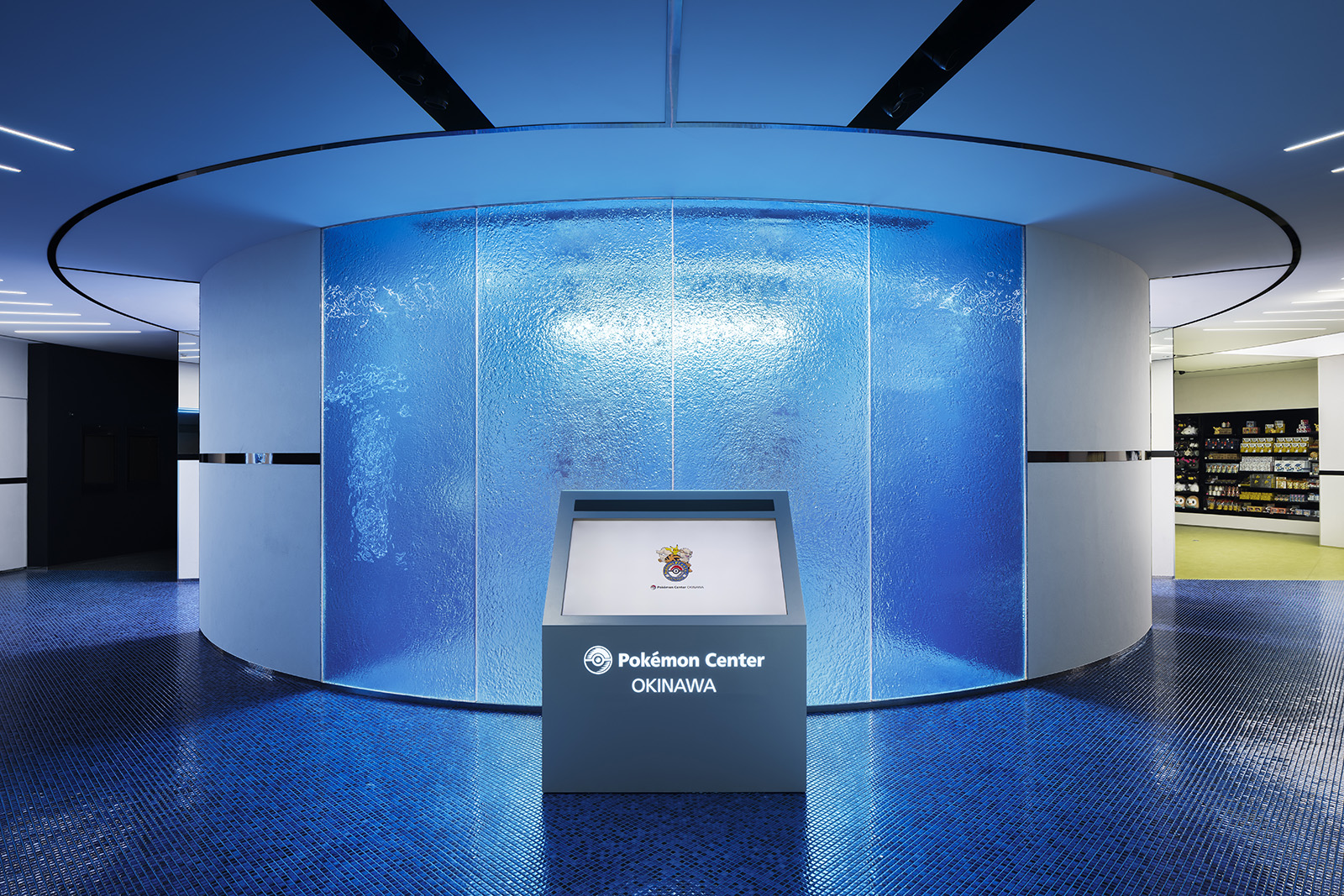 ポケモンの魅力を伝え、コンテンツを届けるための拠点であるポケモンセンター。ポケモンのもつ世界観をベースに、一つのゲームを体験する感覚を持てるような空間づくりを目指した。円形のダイナミックでシームレスな空間からは、空想世界の建築物のような印象を受けると同時に、ゲームの中の洞窟やランドスケープのようにも感じることができる。発光するモンスターボールなど、ポケモンのアイコン性を、最小限の要素で空間全体を通して表現することで、空間自体の主張よりもその中で展開されるポケモンのコンテンツにフォーカスが当たるようなバランスを生み出している。沖縄の海や緑といった自然を抽象的かつ大胆に表現することで、一つの世界に入っていくような深い没入感をもつ空間となっている。中央の水の中のような象徴的な円形空間では、ポケモンの世界の原点であるゲームの魅力を、映像や演出を通して体験することができる。その周囲にグッズ、カードゲーム、映像メディアといった、それぞれのコンテンツごとに変化のある空間を配置することで、連続的な期待感を産む空間体験をすることができる。人々に浸透しているポケモンの世界。その魅力をより強く広く伝えるための仮想と現実をつなぐような店舗となった。