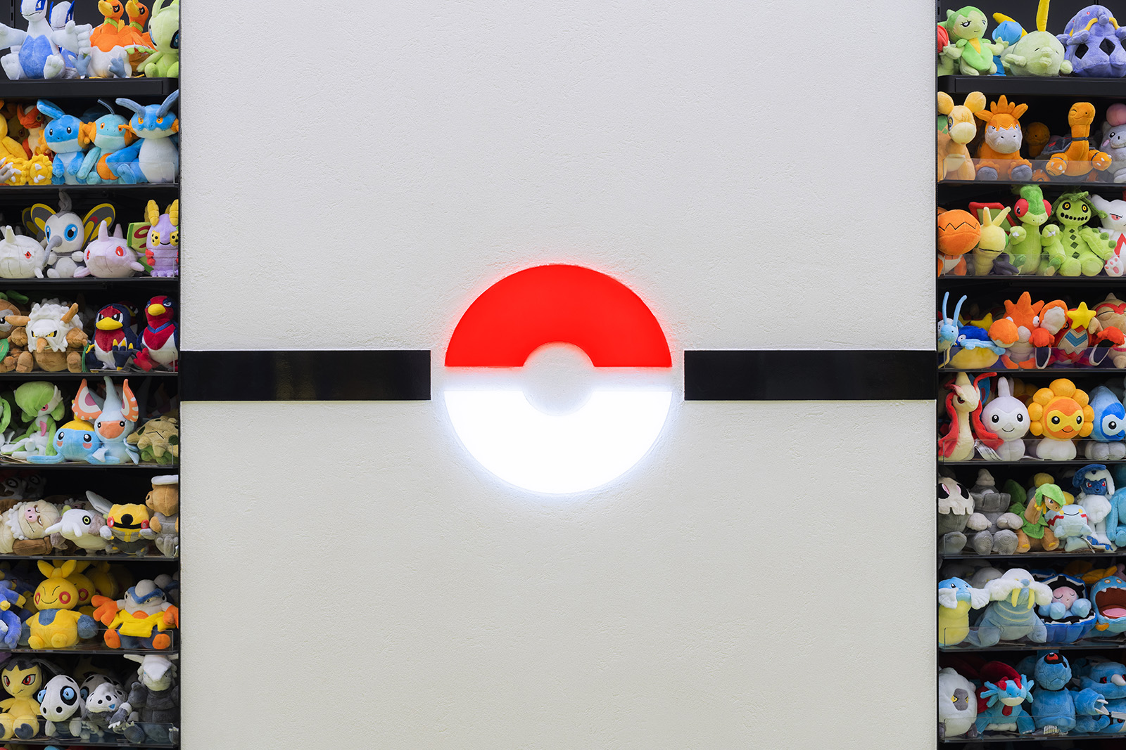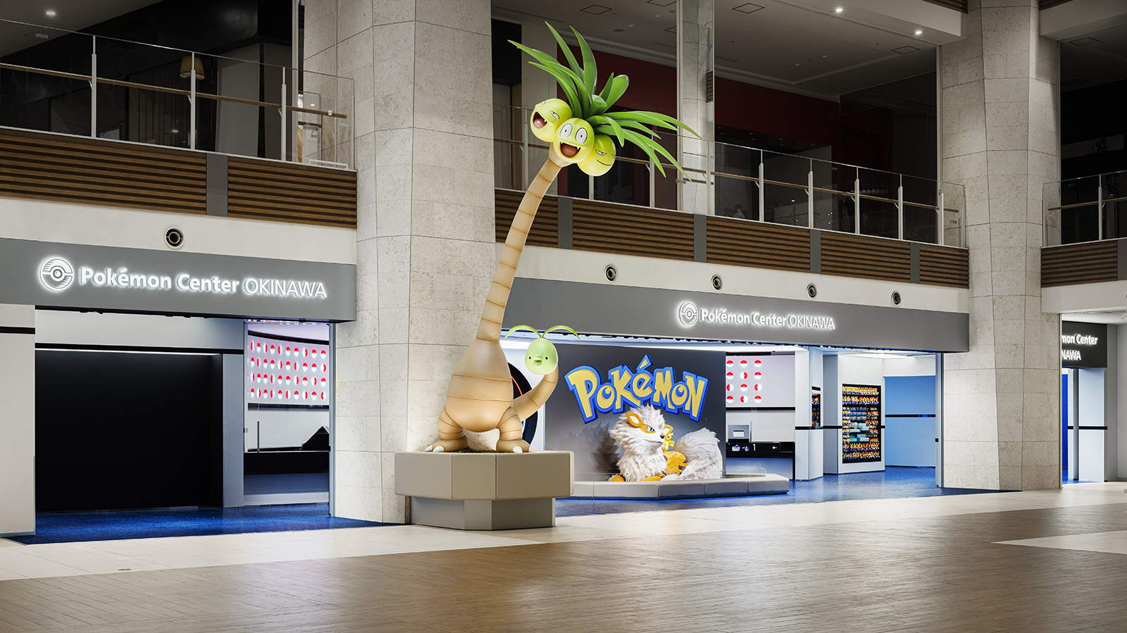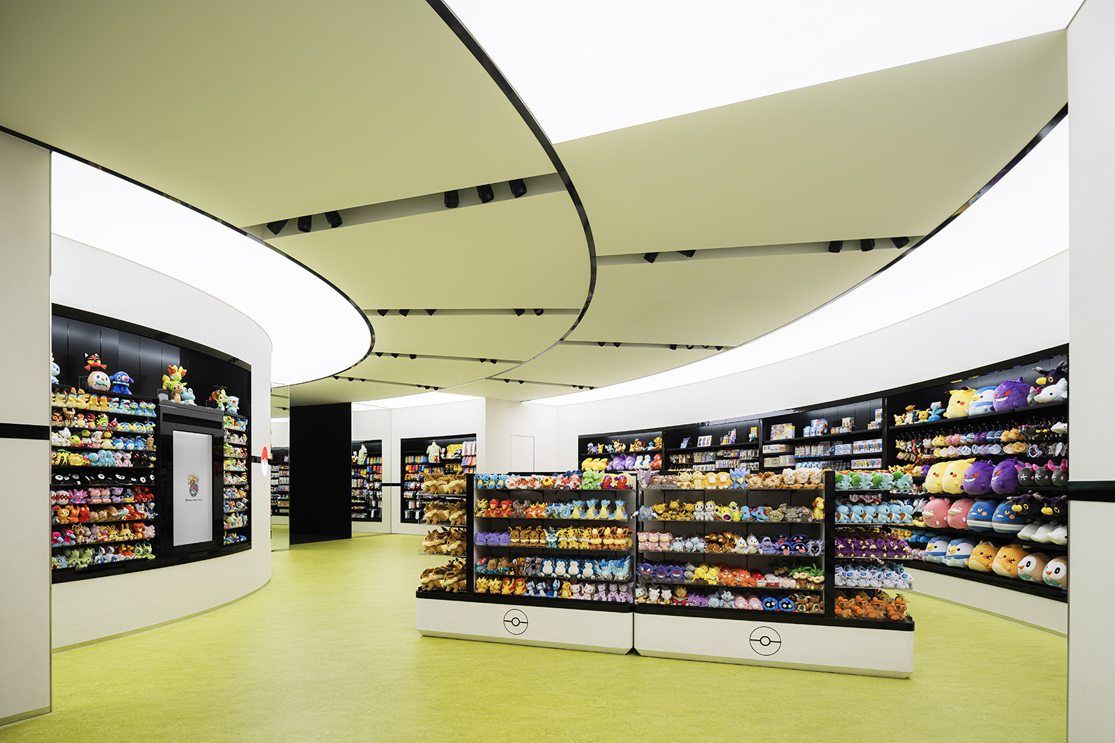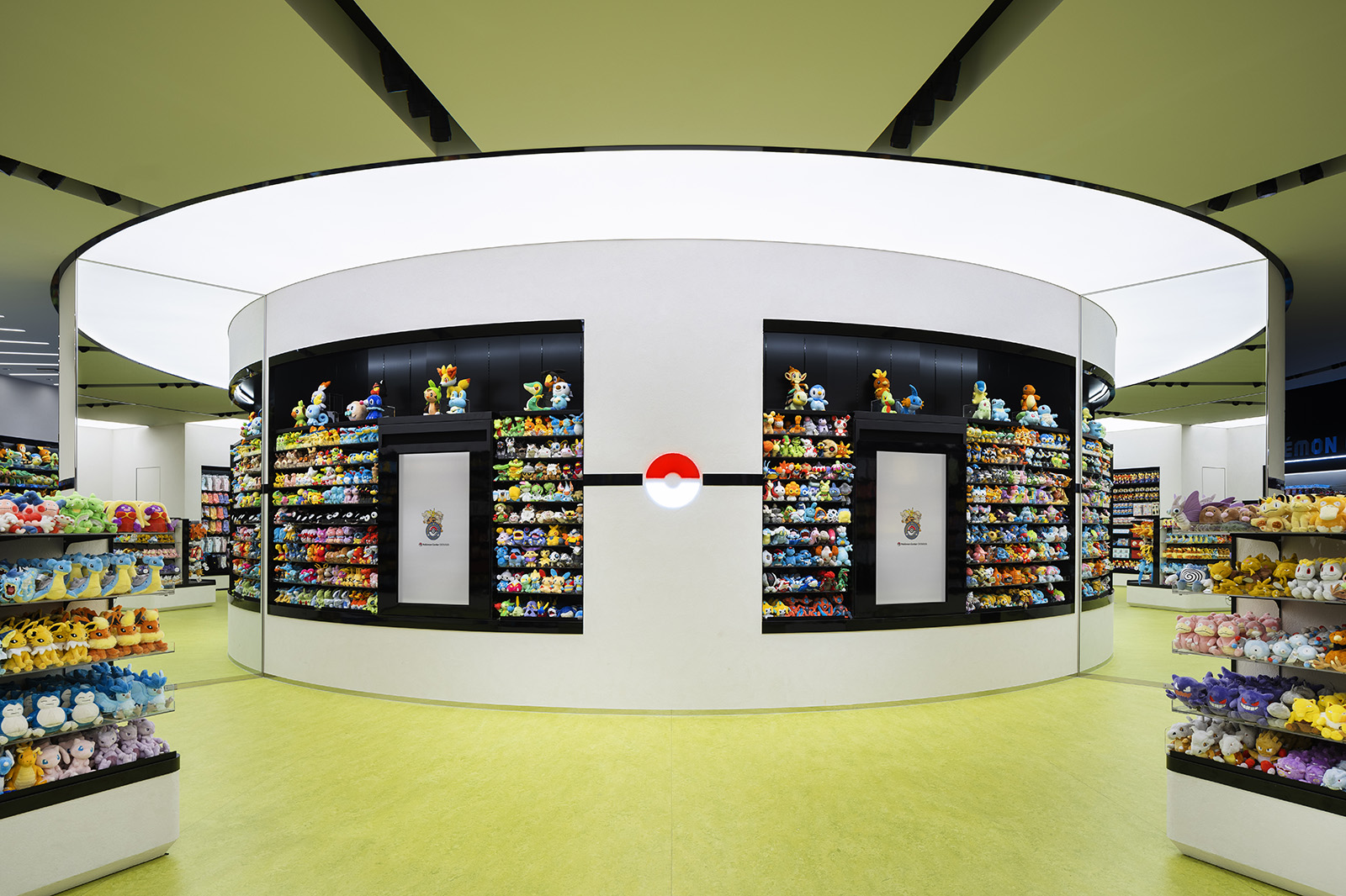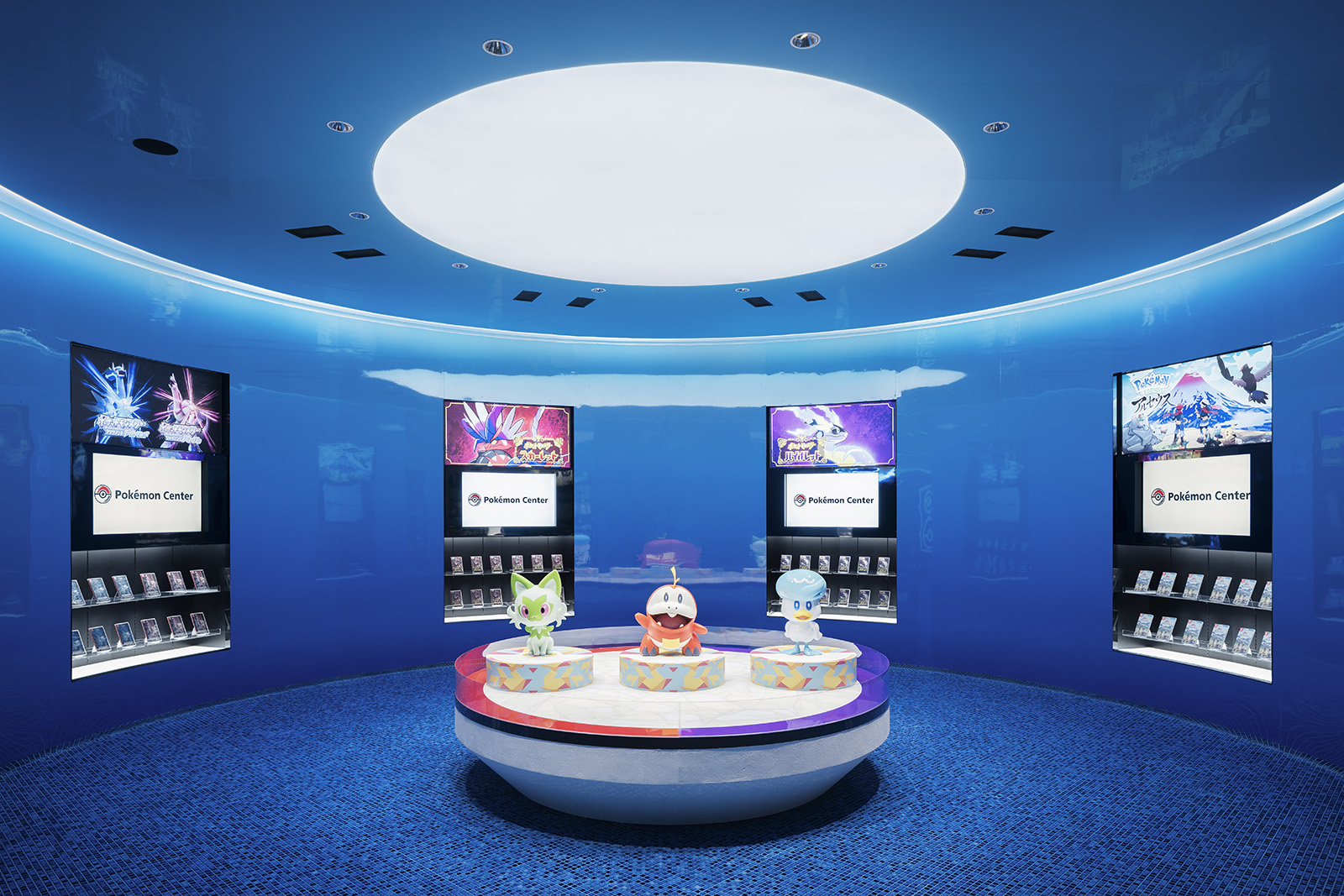ポケモンの魅力を伝え、コンテンツを届けるための拠点であるポケモンセンター。ポケモンのもつ世界観をベースに、一つのゲームを体験する感覚を持てるような空間づくりを目指した。円形のダイナミックでシームレスな空間からは、空想世界の建築物のような印象を受けると同時に、ゲームの中の洞窟やランドスケープのようにも感じることができる。発光するモンスターボールなど、ポケモンのアイコン性を、最小限の要素で空間全体を通して表現することで、空間自体の主張よりもその中で展開されるポケモンのコンテンツにフォーカスが当たるようなバランスを生み出している。沖縄の海や緑といった自然を抽象的かつ大胆に表現することで、一つの世界に入っていくような深い没入感をもつ空間となっている。中央の水の中のような象徴的な円形空間では、ポケモンの世界の原点であるゲームの魅力を、映像や演出を通して体験することができる。その周囲にグッズ、カードゲーム、映像メディアといった、それぞれのコンテンツごとに変化のある空間を配置することで、連続的な期待感を産む空間体験をすることができる。人々に浸透しているポケモンの世界。その魅力をより強く広く伝えるための仮想と現実をつなぐような店舗となった。