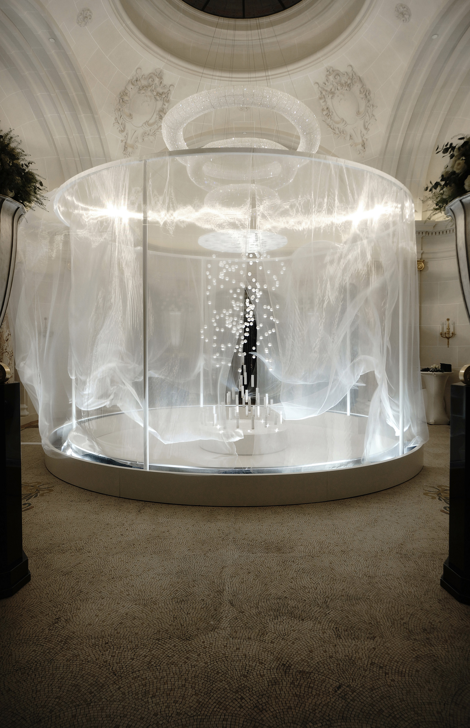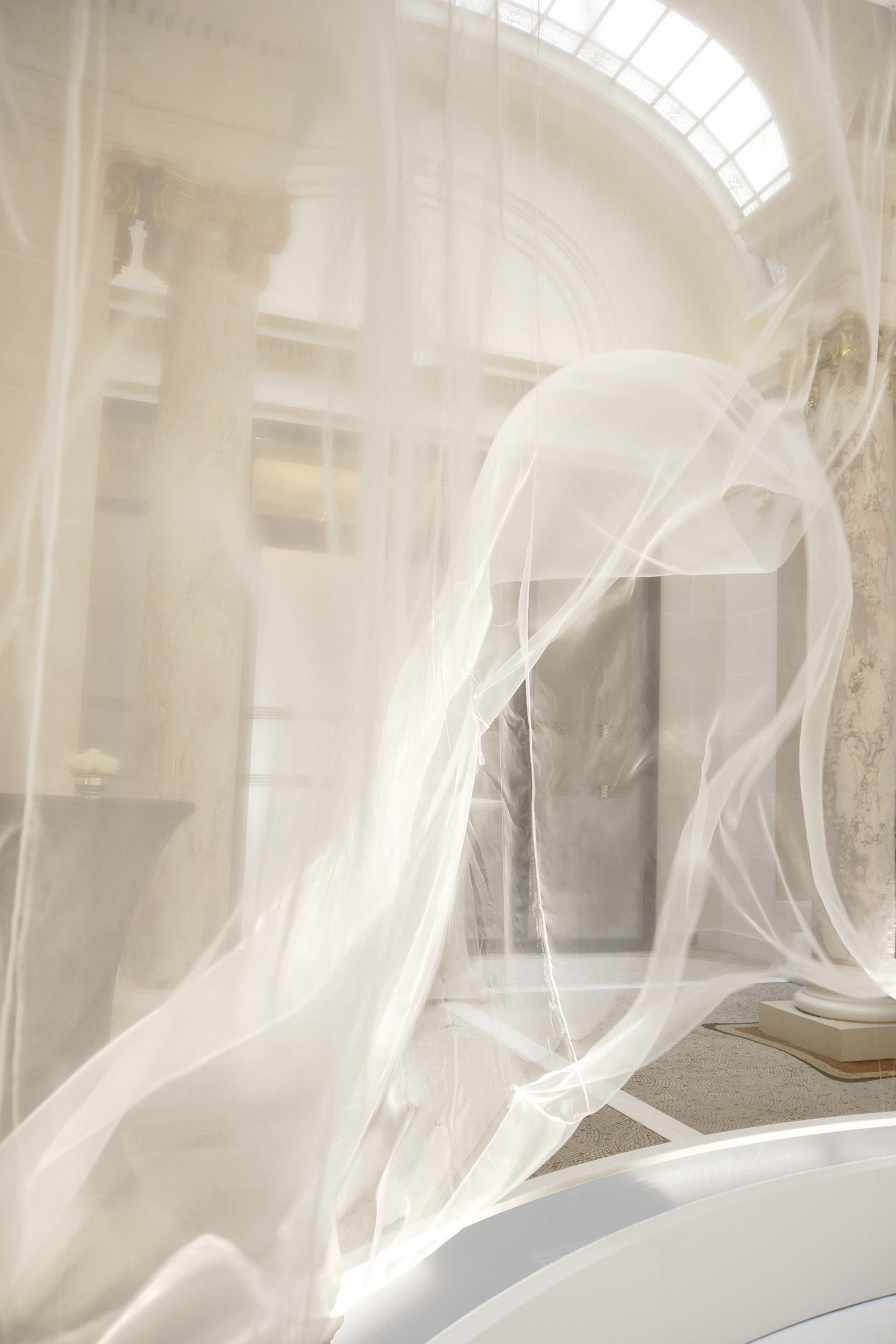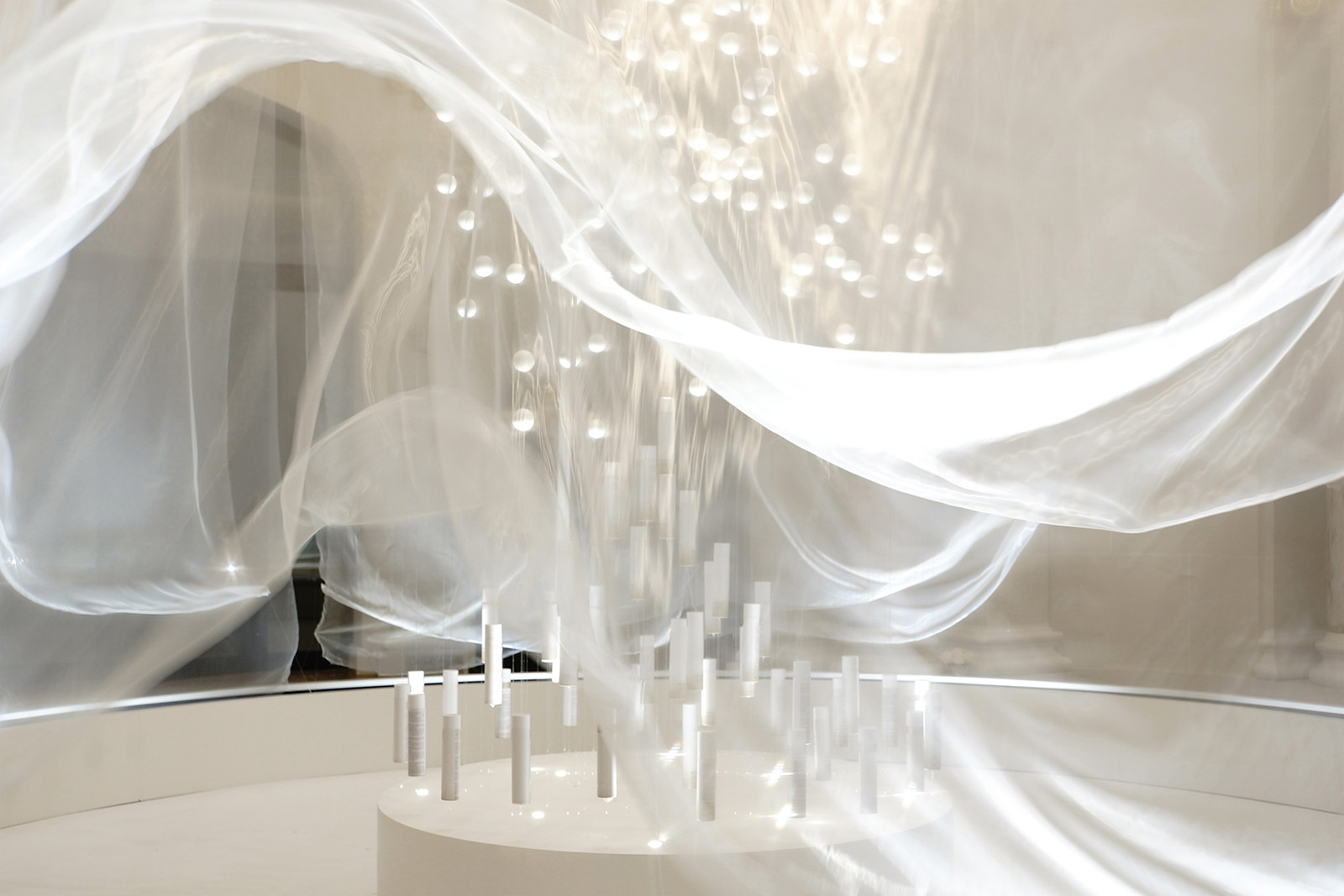 パリで行われた日本化粧品メーカーによる、新商品発表会のためのインスタレーション。様式的円形スペースの中で、高さ4mの空気のようなファブリックは風の動きを受けて軽やかに舞い続ける。訪れる人々はファブリックによる柔らかい光に包まれながら、新商品の世界観に触れる。中央では商品の特徴を捉えた、浮遊するディスプレイを設置。動き続ける風景の中で時が静止したように感じさせることで、商品の存在感を浮き立たせる。視覚だけでなく、ブランディングを肌で感じることのできるインスタレーションを表現した。
