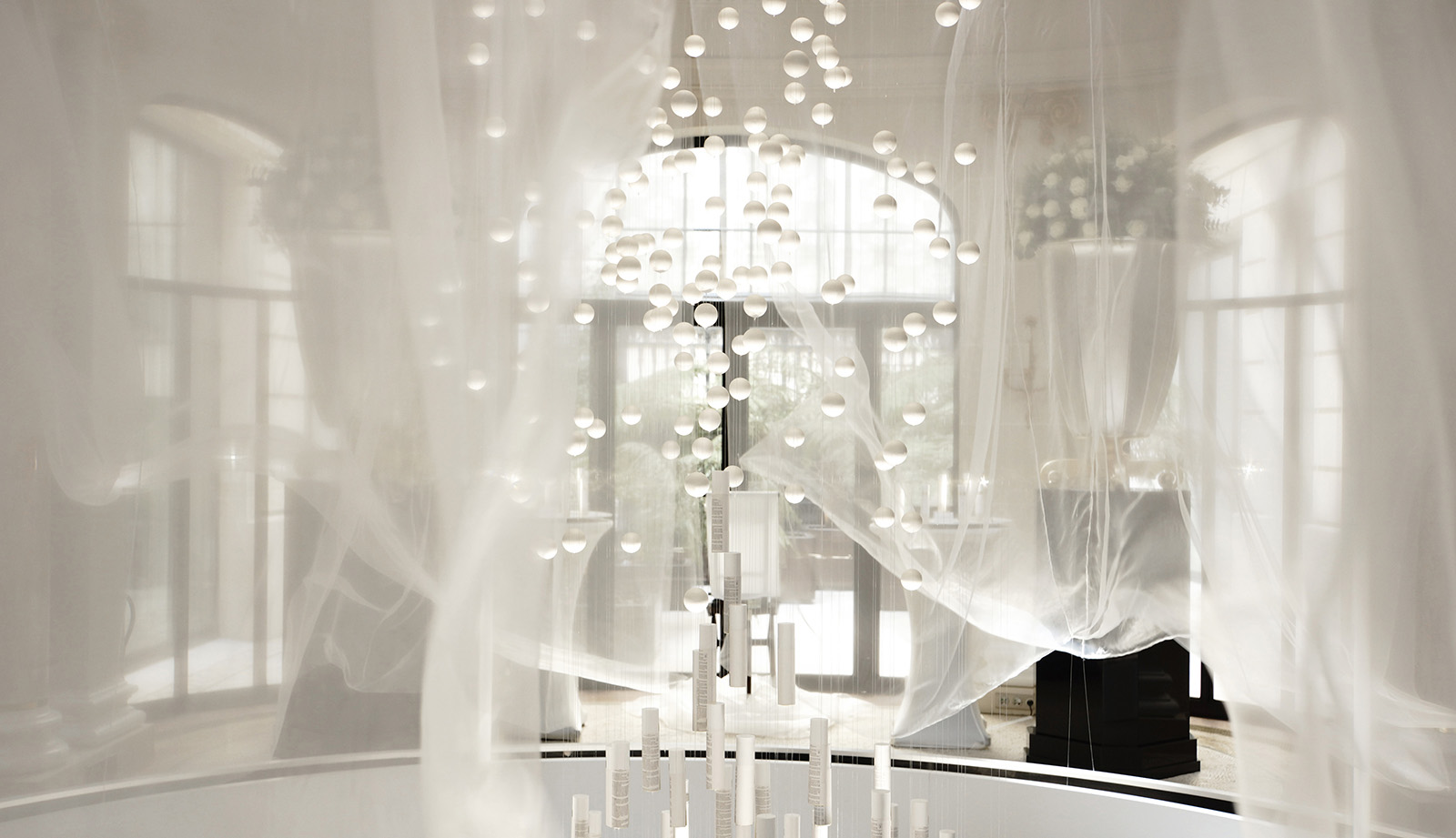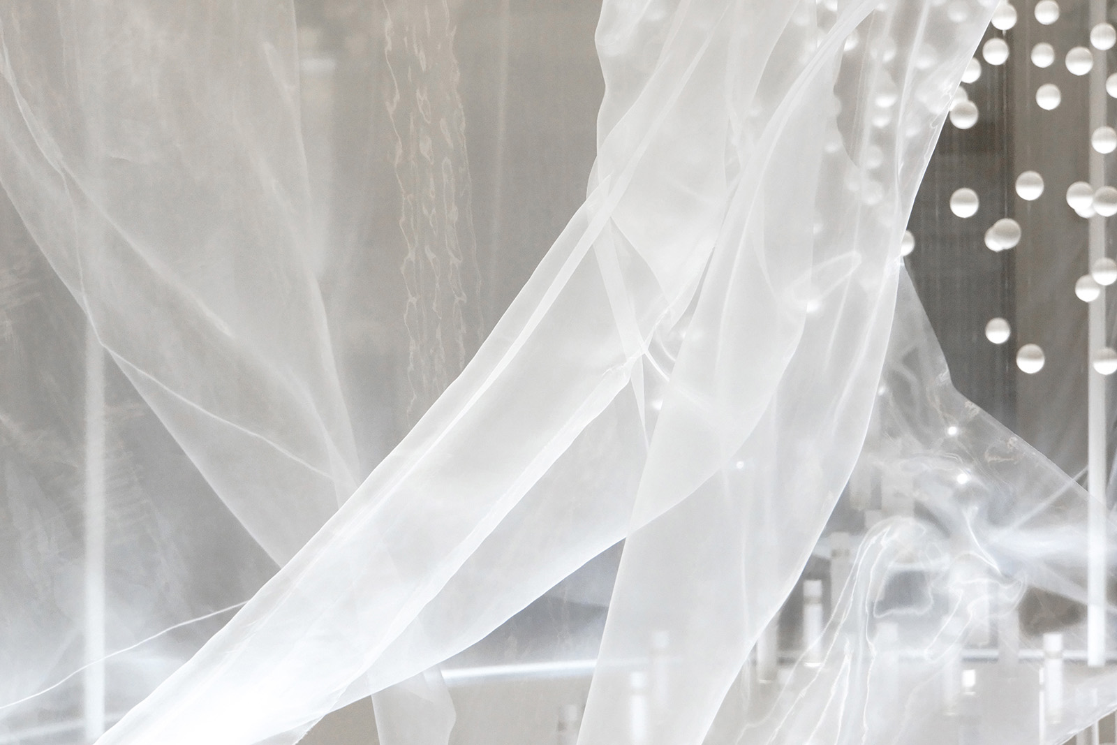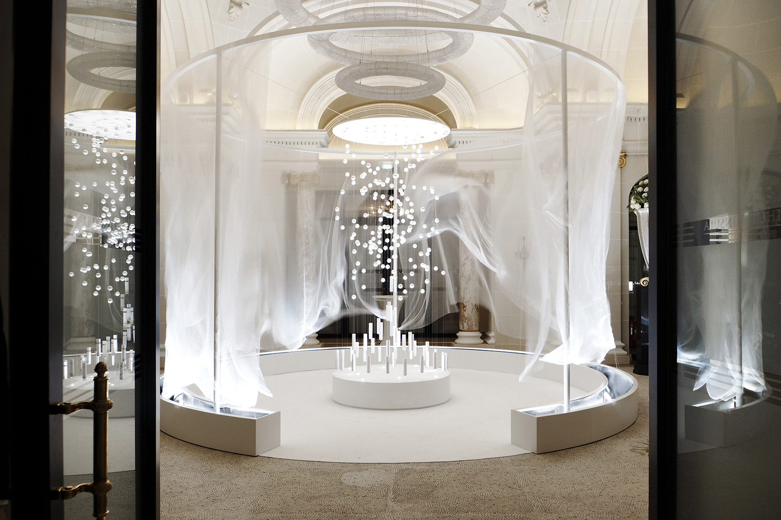 パリで行われた日本化粧品メーカーによる、新商品発表会のためのインスタレーション。様式的円形スペースの中で、高さ4mの空気のようなファブリックは風の動きを受けて軽やかに舞い続ける。訪れる人々はファブリックによる柔らかい光に包まれながら、新商品の世界観に触れる。中央では商品の特徴を捉えた、浮遊するディスプレイを設置。動き続ける風景の中で時が静止したように感じさせることで、商品の存在感を浮き立たせる。視覚だけでなく、ブランディングを肌で感じることのできるインスタレーションを表現した。