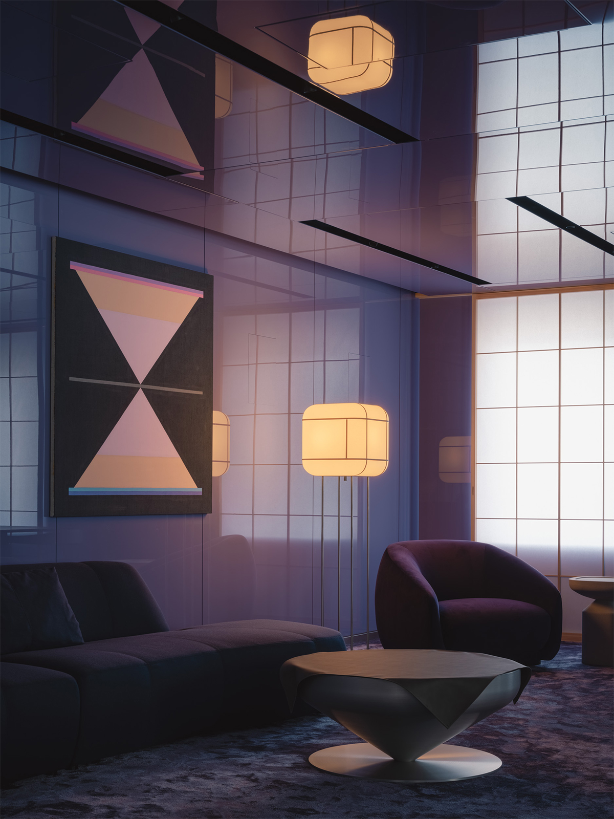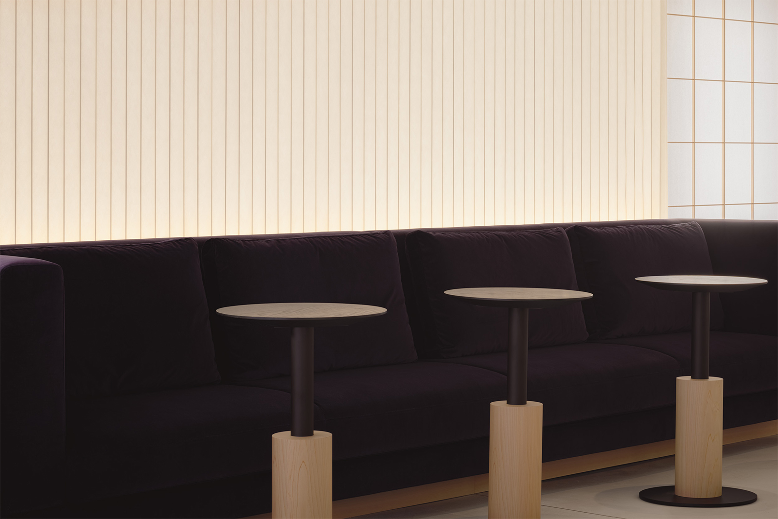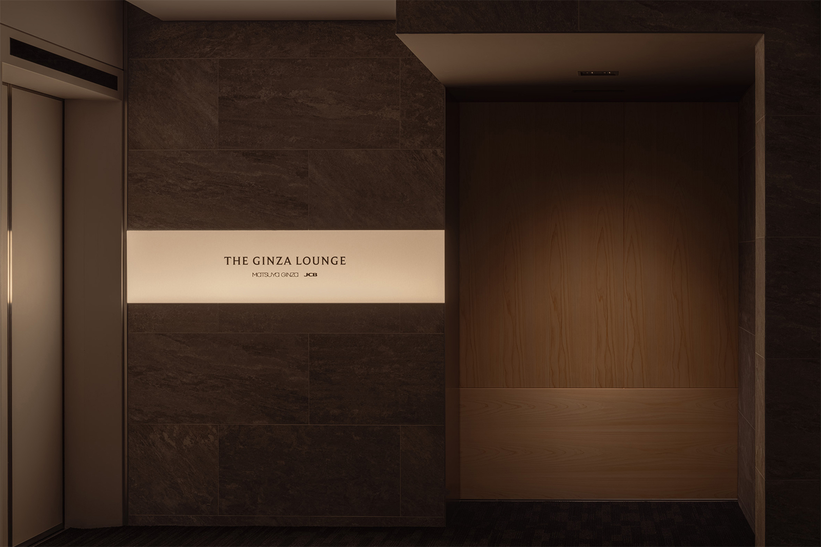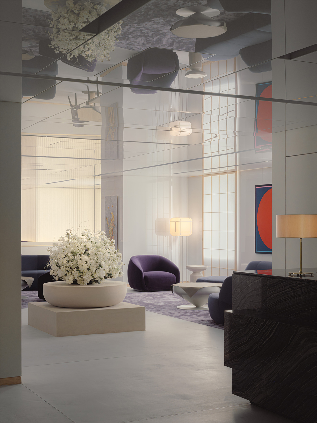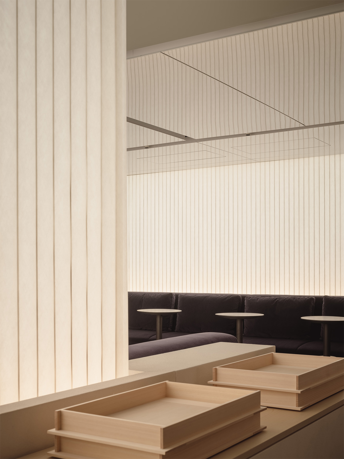 松屋銀座とJCBの顧客のためのプレミアムラウンジのデザイン。ロケーションである銀座という街の魅力を一言で表すならば、それは「艶」にあると考えた。光を纏い、情緒をまとい、人の気配とともに表情を変えるその質感をラウンジ空間の核となるテーマとした。白を基調としたモダンな空間に、「江戸紫」を挿し色として配することで、凛とした美しさと日本の伝統を同居させた。白と紫という潔い色彩のコントラストが、訪れる人の記憶に鮮やかに刻まれる。リノベーション前の空間が持っていた、奥へと続く伸びやかな構成と、リズミカルに並ぶ天井まで届く窓。そのポテンシャルを活かすため、天井に光を反射する素材を用い、外からの自然光や室内の象徴的な照明が空間全体に広がる設計とした。光のボリューム、フロアランプの穏やかな光、窓から射し込む自然光を受けた障子が、天井や壁にやわらかく反射しながら空間を満たしていく。その風景は、銀座の街に点在する建築の灯りやショーウィンドウといったきらめく光の粒子たちを想起させ、このラウンジを都市の風景の一部として呼応させる。エントランスから続くしっとりとしたソファエリア、光のボリュームに挟まれた中央部、そして奥には江戸紫に包まれる少し厳かな空間。ひとつながりの空間の中に、異なる質感と感情のレイヤーを持たせた。銀座という街が持つ「艶」の精神を、素材・光・構成を通じて現代的に翻訳した、新鮮でありながら深みのあるラウンジを目指した。