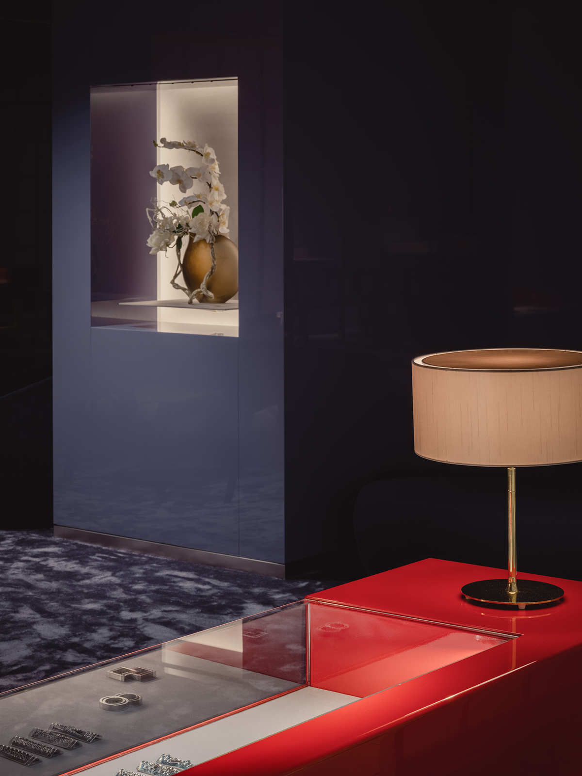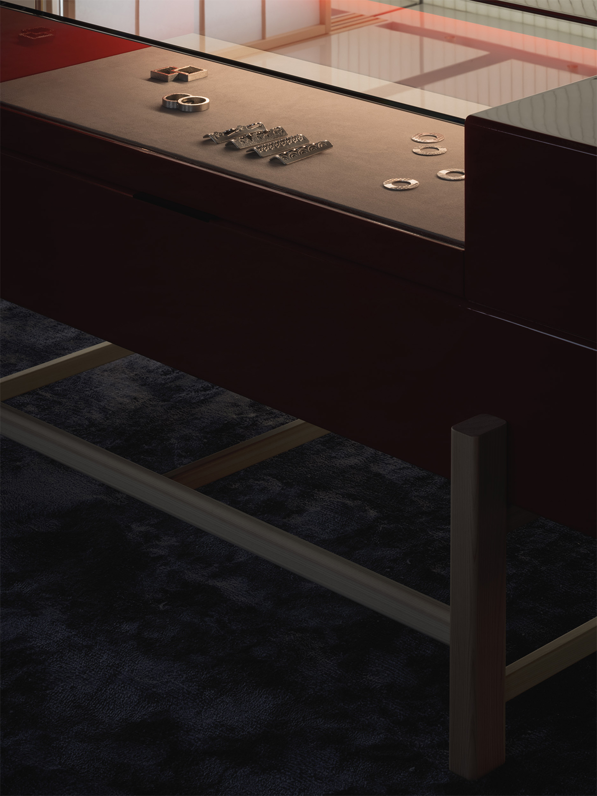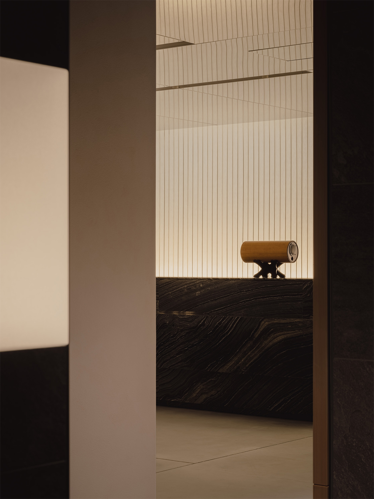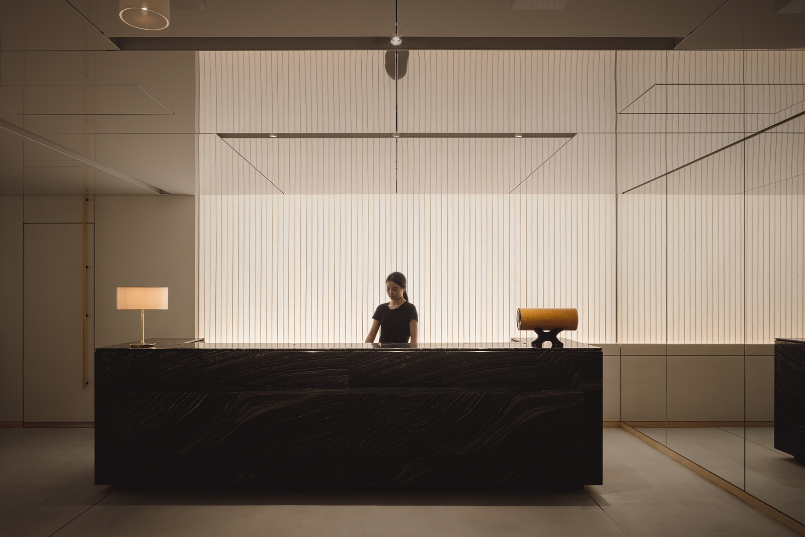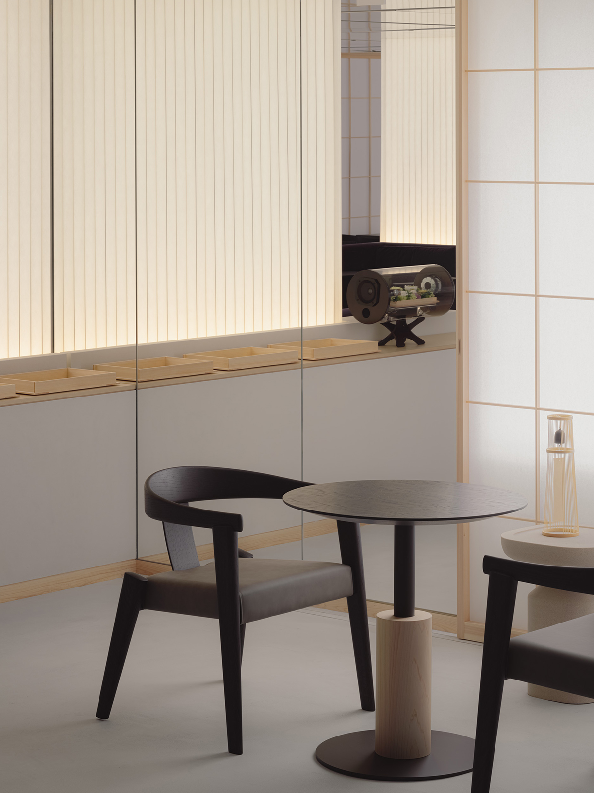 松屋銀座とJCBの顧客のためのプレミアムラウンジのデザイン。ロケーションである銀座という街の魅力を一言で表すならば、それは「艶」にあると考えた。光を纏い、情緒をまとい、人の気配とともに表情を変えるその質感をラウンジ空間の核となるテーマとした。白を基調としたモダンな空間に、「江戸紫」を挿し色として配することで、凛とした美しさと日本の伝統を同居させた。白と紫という潔い色彩のコントラストが、訪れる人の記憶に鮮やかに刻まれる。リノベーション前の空間が持っていた、奥へと続く伸びやかな構成と、リズミカルに並ぶ天井まで届く窓。そのポテンシャルを活かすため、天井に光を反射する素材を用い、外からの自然光や室内の象徴的な照明が空間全体に広がる設計とした。光のボリューム、フロアランプの穏やかな光、窓から射し込む自然光を受けた障子が、天井や壁にやわらかく反射しながら空間を満たしていく。その風景は、銀座の街に点在する建築の灯りやショーウィンドウといったきらめく光の粒子たちを想起させ、このラウンジを都市の風景の一部として呼応させる。エントランスから続くしっとりとしたソファエリア、光のボリュームに挟まれた中央部、そして奥には江戸紫に包まれる少し厳かな空間。ひとつながりの空間の中に、異なる質感と感情のレイヤーを持たせた。銀座という街が持つ「艶」の精神を、素材・光・構成を通じて現代的に翻訳した、新鮮でありながら深みのあるラウンジを目指した。