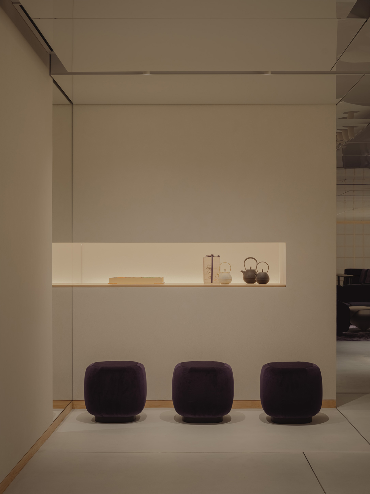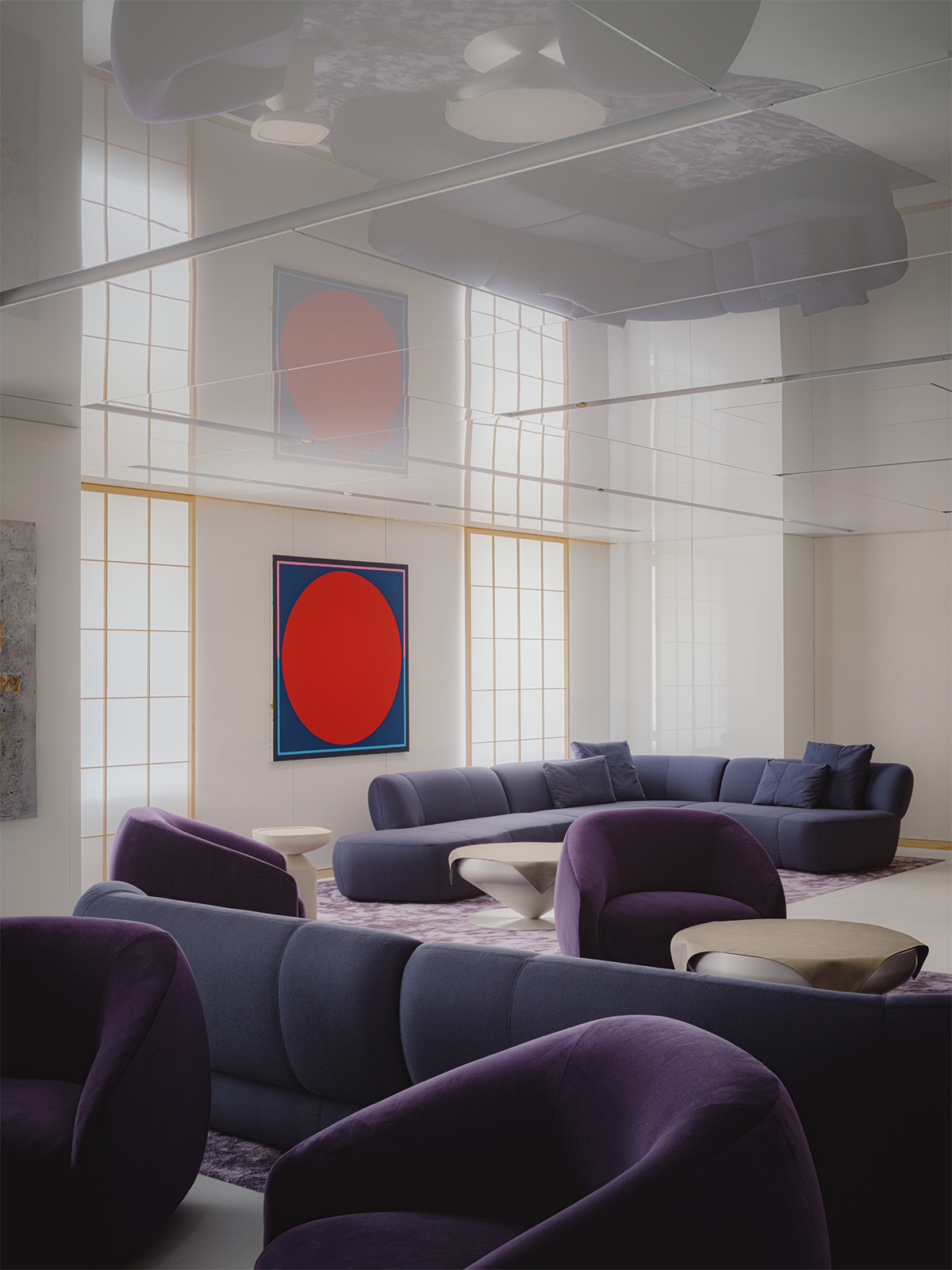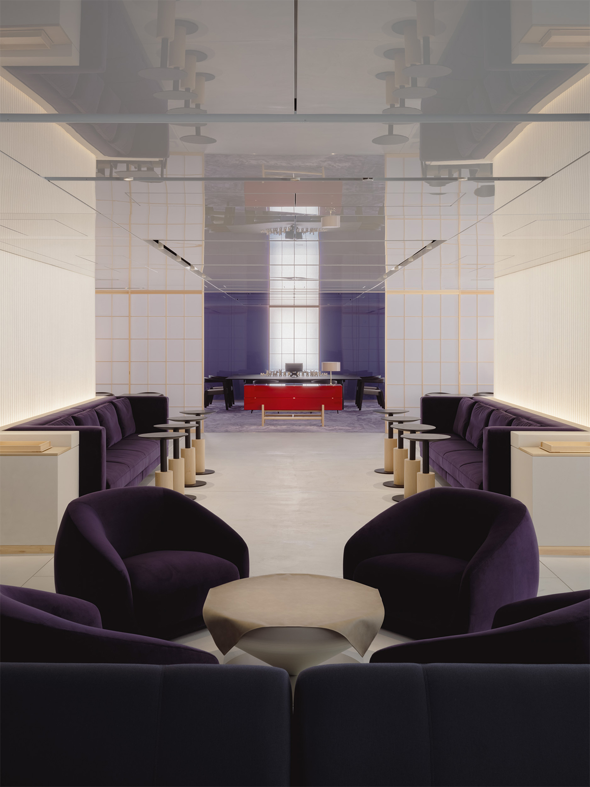 This is a premium lounge designed for the customers of Matsuya Ginza and JCB. To capture the essence of Ginza-the project’s location-we sought to express its allure in a single word: “gloss”. We made this texture, which is cloaked in light, filled with emotion, and changes its expression with the presence of people, the core theme of the lounge space. In a modern space based on white, we placed “Edo purple” as an accent color to bring together dignified beauty and Japanese tradition. The clear contrast between white and purple leaves a vivid impression on visitors. The original space before renovation featured a layout that extended toward the back and a rhythmical sequence of windows reaching up to the ceiling. To make the most of that potential, we used reflective materials on the ceiling and designed the space so that natural light from outside and symbolic lighting from within would spread throughout the interior. The volume of light, the gentle glow of floor lamps, and the shoji screens illuminated by natural light from the windows softly reflect off the ceiling and walls, gradually filling the entire space. This scene evokes the glittering particles of light found in Ginza’s architecture and show windows, and allows the lounge to resonate as part of the cityscape. The space begins with a calm sofa area following the entrance, transitions into a central zone filled with volumes of light, and finally leads to a slightly solemn area wrapped in Edo purple. Within this single, continuous environment, we created a series of layers with differing textures and emotional qualities. Our goal was to create a lounge that feels both fresh and profound by translating the spirit of “en,” which symbolizes the essence of Ginza, into a modern expression through materials, light, and spatial composition.