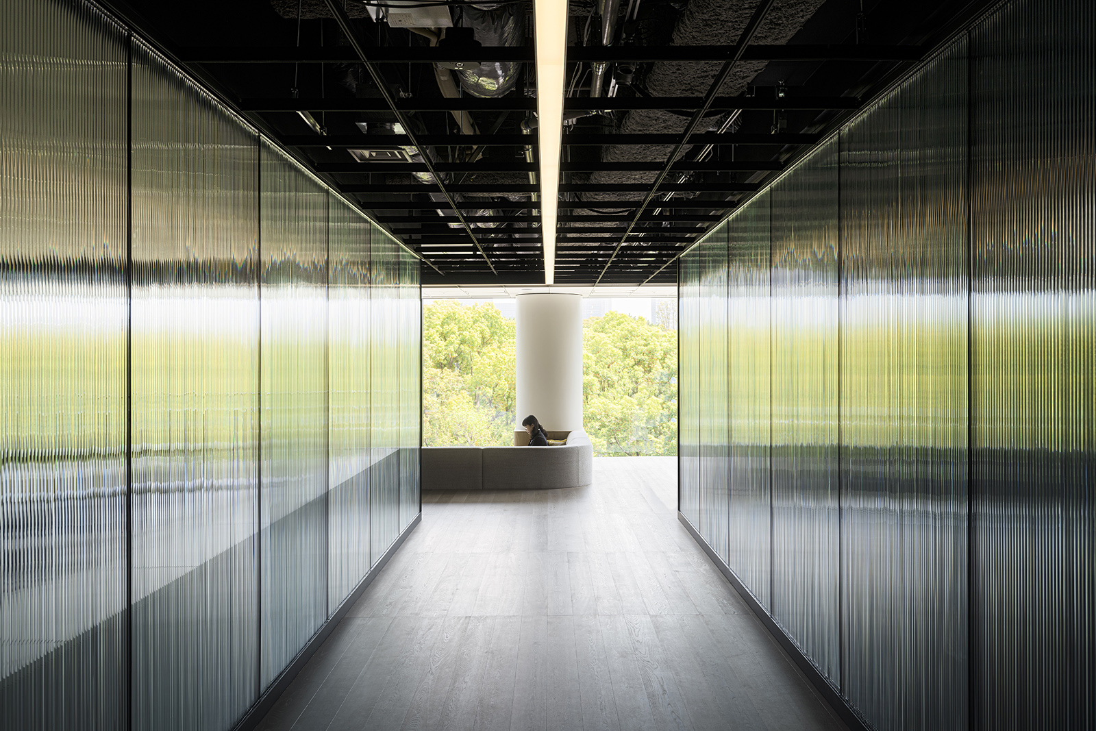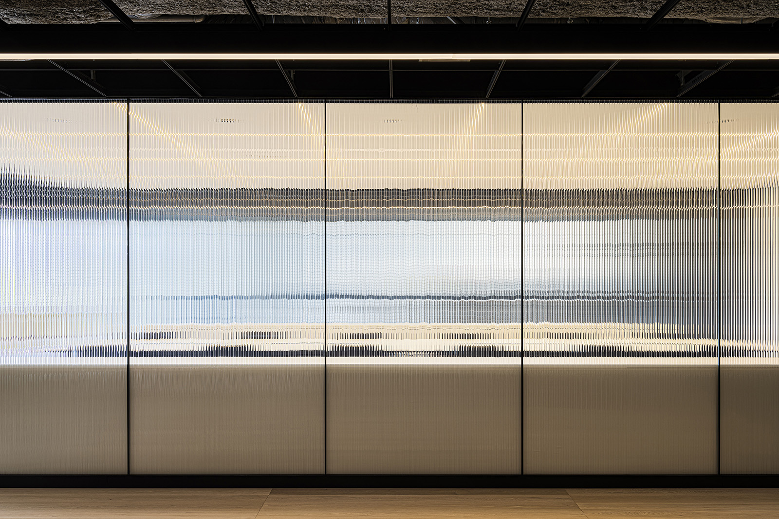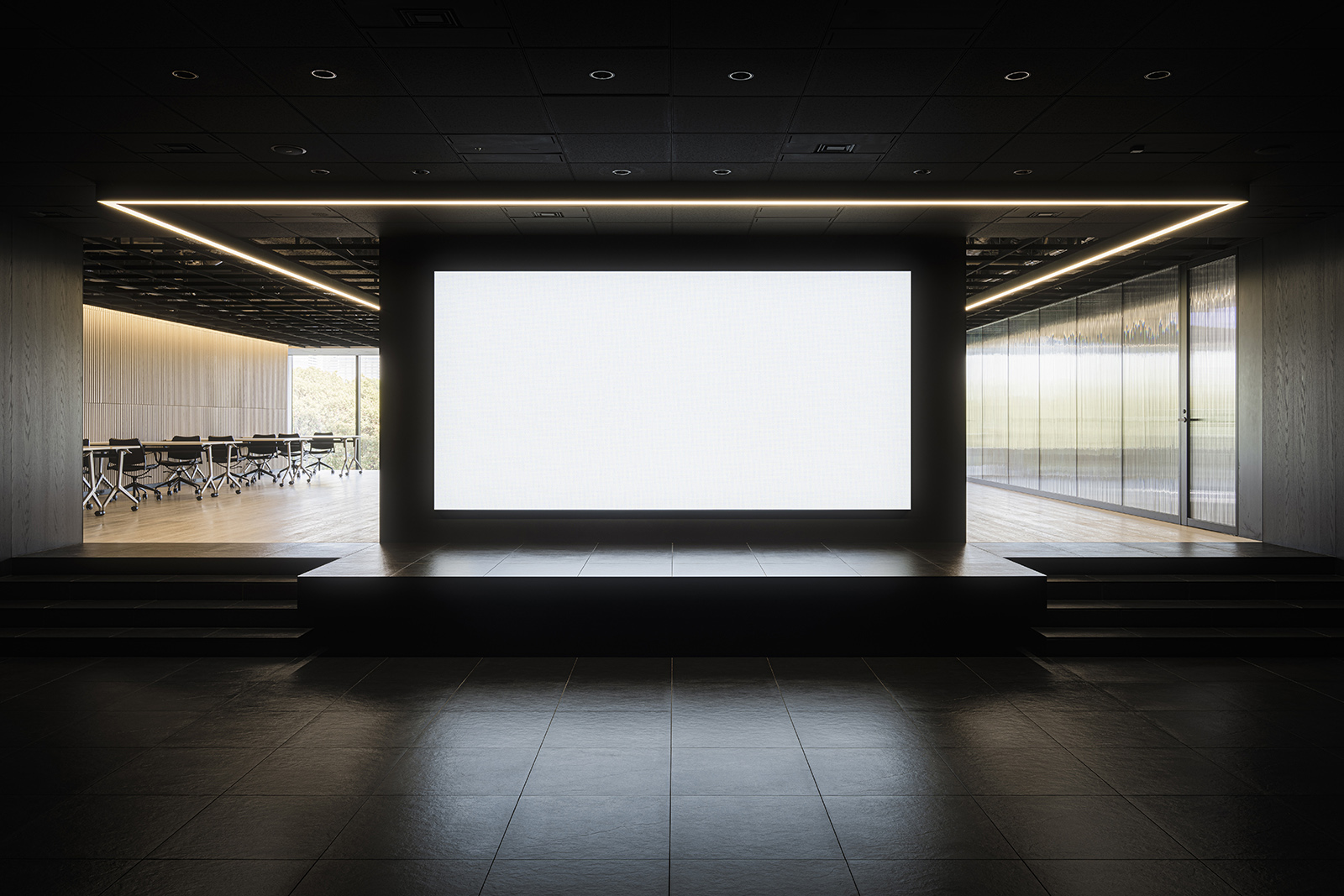 An office design for an in-house hive of creativity, this space functions as a laboratory to develop, nurture and present ideas. At the entrance, a theater-like presentation stage welcomes guests in a grand manner. From within the blackout interiors of the welcoming area, architectural elements of light emerge to float in the darkness, creating a spellbinding space that seems disconnected from the rest of the structure. Shallow steps lead into a light-filled office area beyond, where floor-to-ceiling windows stand out against the light-toned woods and black lines of the space. Areas are separated by meticulously textured glass partitions. Within these translucent overlapping configurations, people and objects become abstract presences in each space. This becomes an expression of the confidential nature of the lab’s experimentation and the open mindedness that is essential for open communication and creativity. Ahead of the windows, a spacious sofa lounge offers visitors relaxing views of verdant greenery outside. Its sunken floor physically lowers visitors to change their perspective and encourage new ways of seeing things. Every area of the office space is designed to stimulate ideas and streamline their experimentation and implementation.