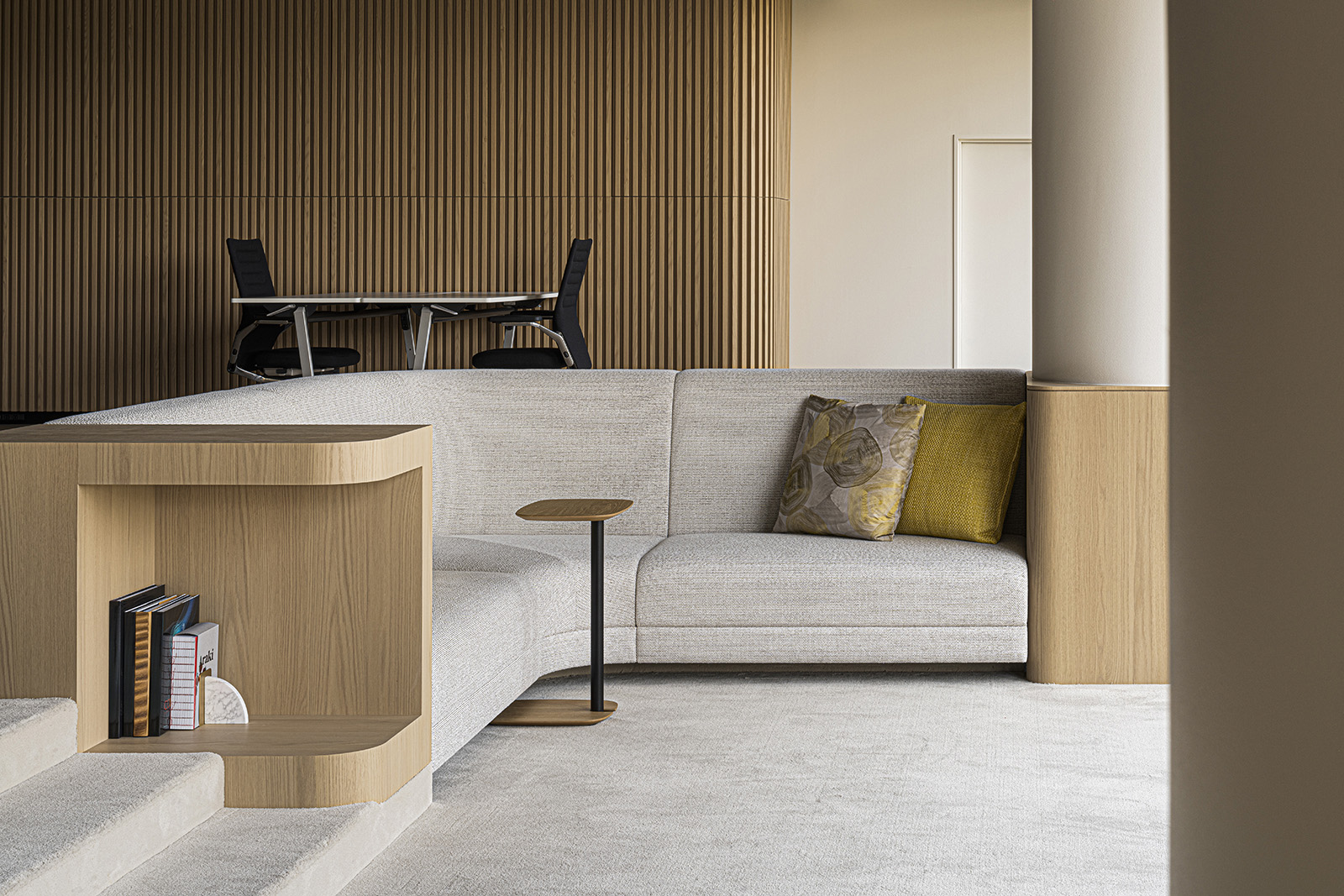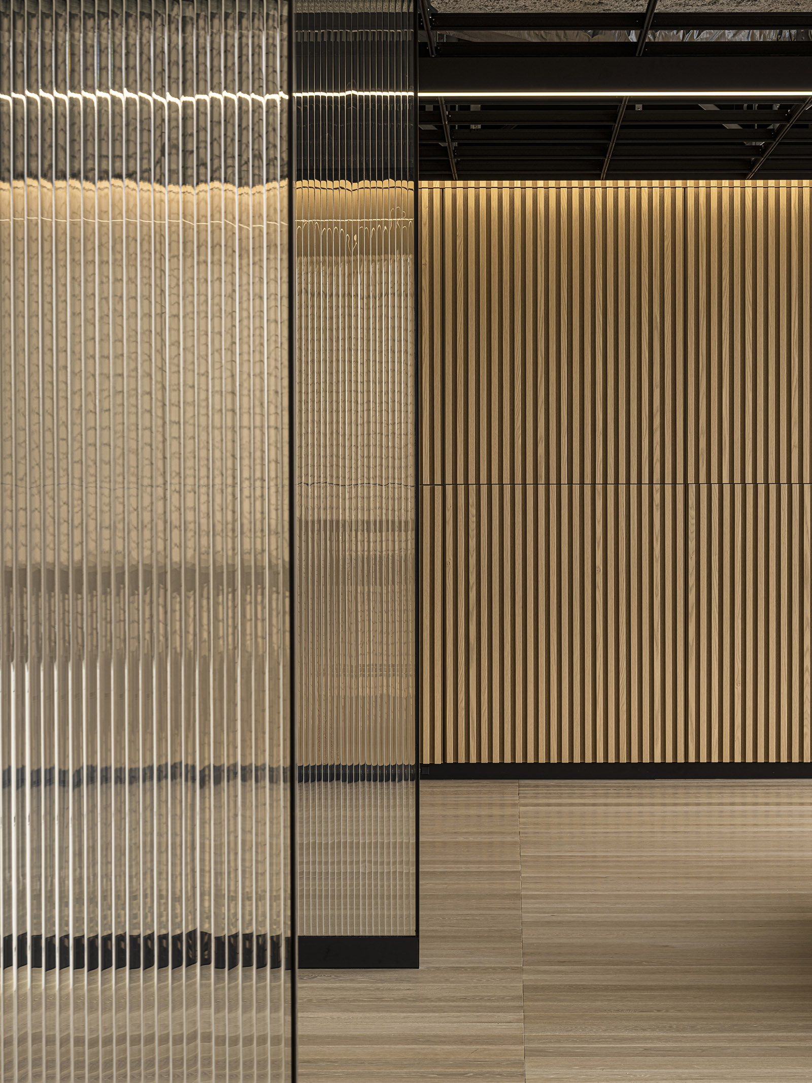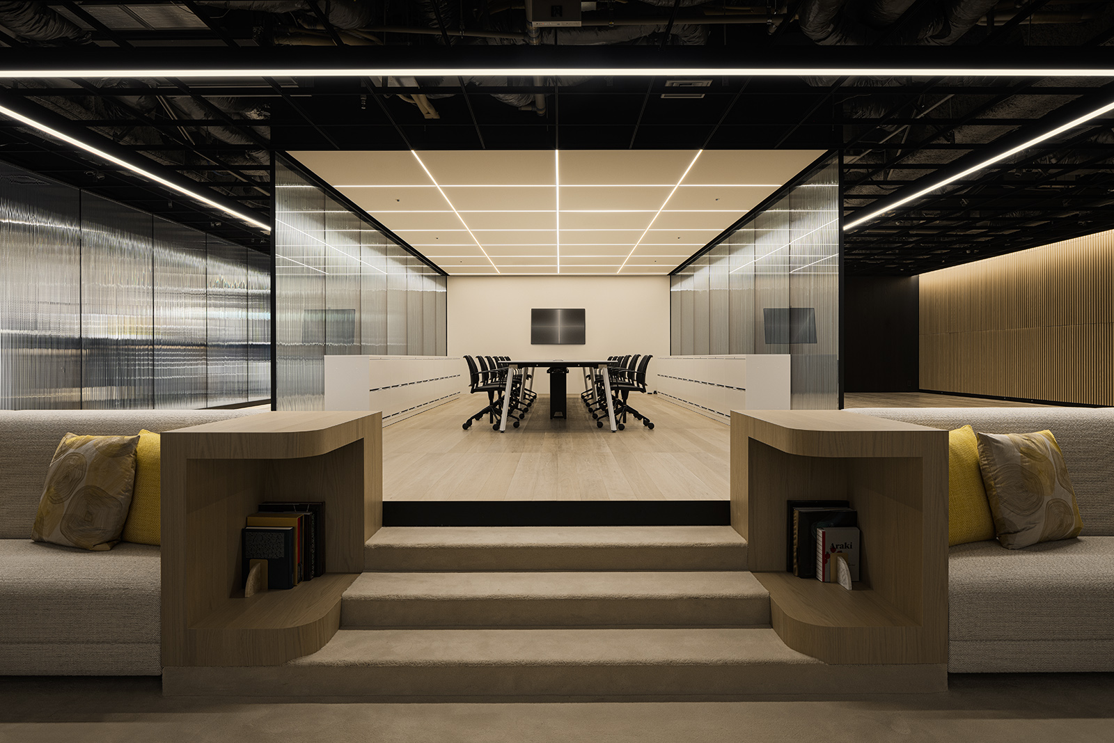 An office design for an in-house hive of creativity, this space functions as a laboratory to develop, nurture and present ideas. At the entrance, a theater-like presentation stage welcomes guests in a grand manner. From within the blackout interiors of the welcoming area, architectural elements of light emerge to float in the darkness, creating a spellbinding space that seems disconnected from the rest of the structure. Shallow steps lead into a light-filled office area beyond, where floor-to-ceiling windows stand out against the light-toned woods and black lines of the space. Areas are separated by meticulously textured glass partitions. Within these translucent overlapping configurations, people and objects become abstract presences in each space. This becomes an expression of the confidential nature of the lab’s experimentation and the open mindedness that is essential for open communication and creativity. Ahead of the windows, a spacious sofa lounge offers visitors relaxing views of verdant greenery outside. Its sunken floor physically lowers visitors to change their perspective and encourage new ways of seeing things. Every area of the office space is designed to stimulate ideas and streamline their experimentation and implementation.