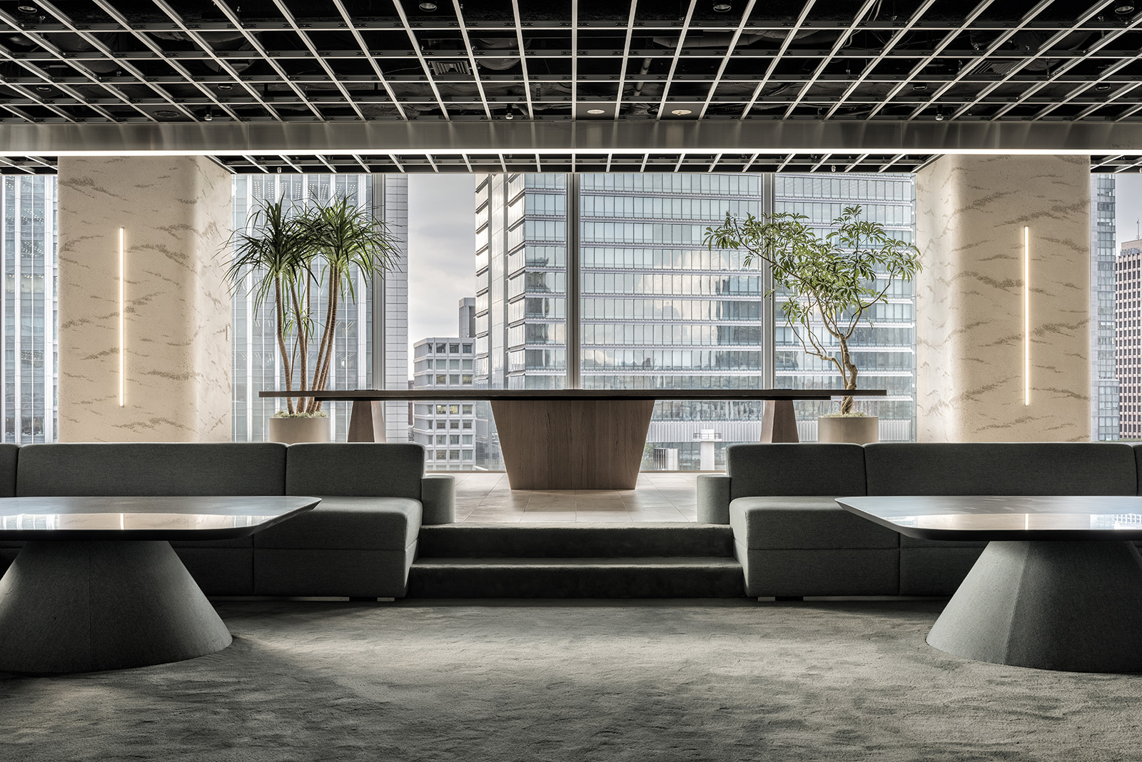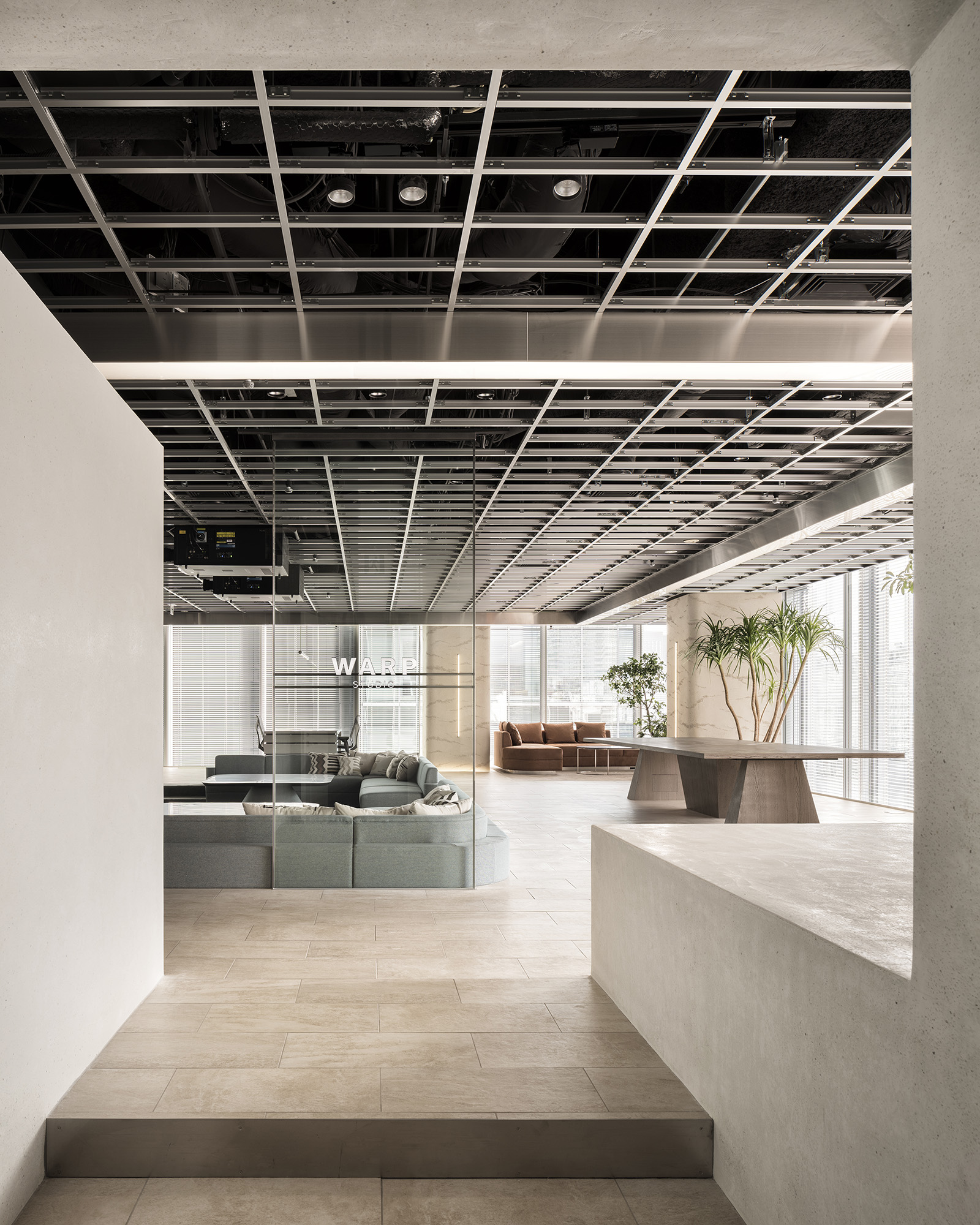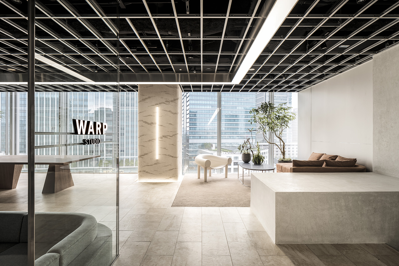 三井不動産の新規事業を軸に人々が集まるコミュニケーションオフィス。デスクワークを主とする通常のオフィス空間とは大きく異なるオフィスのあり方を求められた。人が本当にリラックスをして過ごせるオフィスづくりをするため、住居での空間のあり方をヒントに、リビングやダイニングのようなインキュベーションスペースを設けた。未来を感じる空間づくりとして、日常生活に寄り添うテクノロジーのあり方を新しさの表現の切り口とした。オフィス中央に流れる高解像度、高出力の映像は空間を彩る光を放つ存在となる。映像と実物の境界を曖昧にすることで、本当の意味での未来観を象徴する表現を目指した。陰影が柔らかな左官の曲壁面に囲われた会議室はオープンスペースとは対照的に、静かな空間を目指した。シンボルカラーのグラデーションを用いたガラスを通し、ほのかに色のついた光が室内に流れる。光・造形・素材、そして人々の過ごし方を改めて構築することで、新しい未来観を示しつつも、随所に心地良い居場所を持つオフィス空間となった。