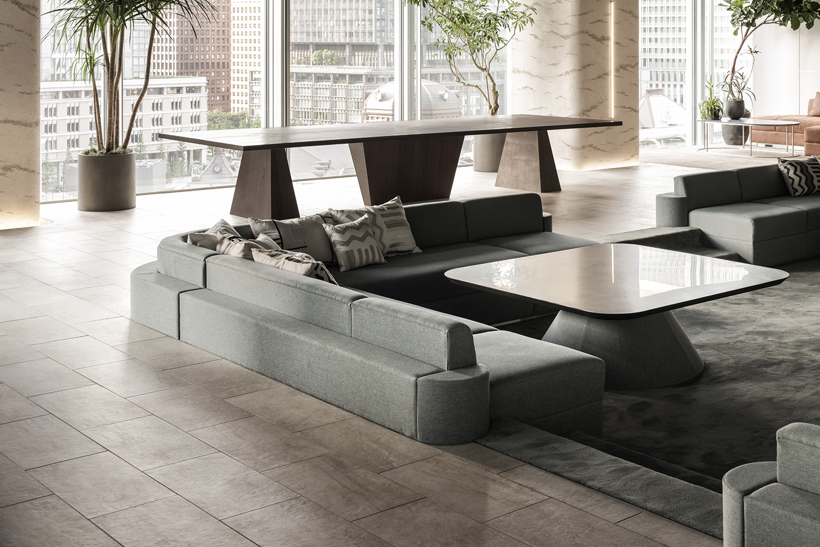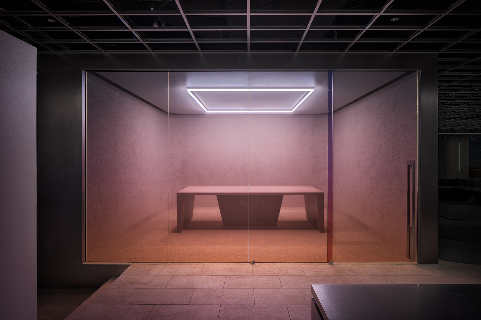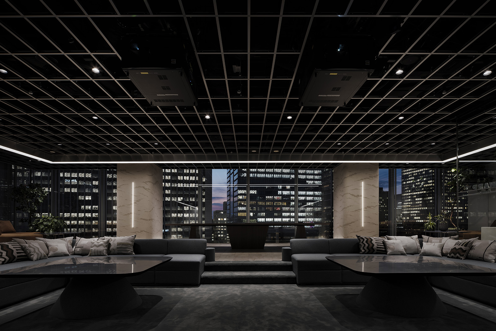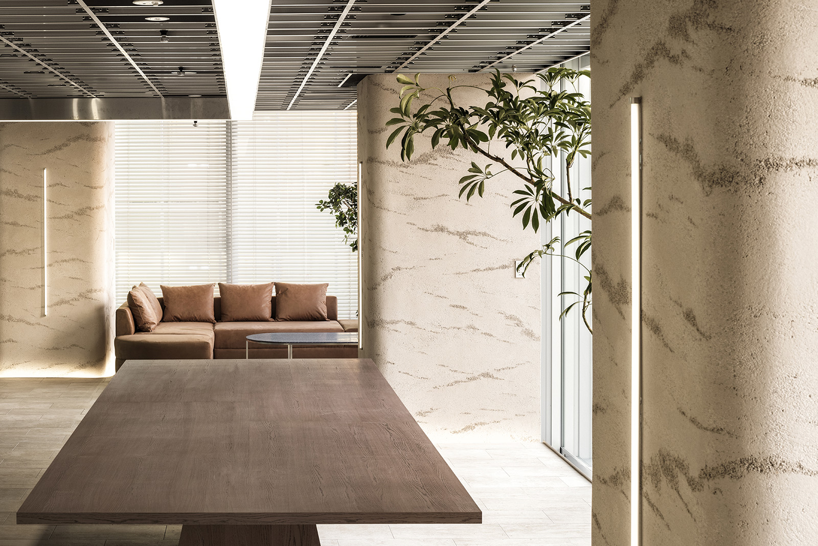 三井不動産の新規事業を軸に人々が集まるコミュニケーションオフィス。デスクワークを主とする通常のオフィス空間とは大きく異なるオフィスのあり方を求められた。人が本当にリラックスをして過ごせるオフィスづくりをするため、住居での空間のあり方をヒントに、リビングやダイニングのようなインキュベーションスペースを設けた。未来を感じる空間づくりとして、日常生活に寄り添うテクノロジーのあり方を新しさの表現の切り口とした。オフィス中央に流れる高解像度、高出力の映像は空間を彩る光を放つ存在となる。映像と実物の境界を曖昧にすることで、本当の意味での未来観を象徴する表現を目指した。陰影が柔らかな左官の曲壁面に囲われた会議室はオープンスペースとは対照的に、静かな空間を目指した。シンボルカラーのグラデーションを用いたガラスを通し、ほのかに色のついた光が室内に流れる。光・造形・素材、そして人々の過ごし方を改めて構築することで、新しい未来観を示しつつも、随所に心地良い居場所を持つオフィス空間となった。