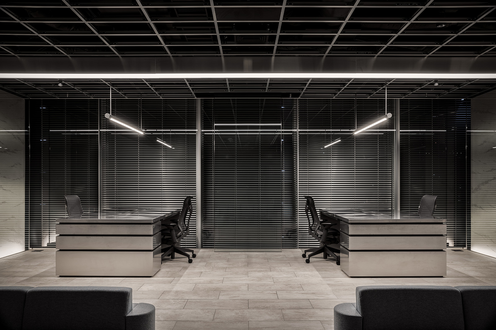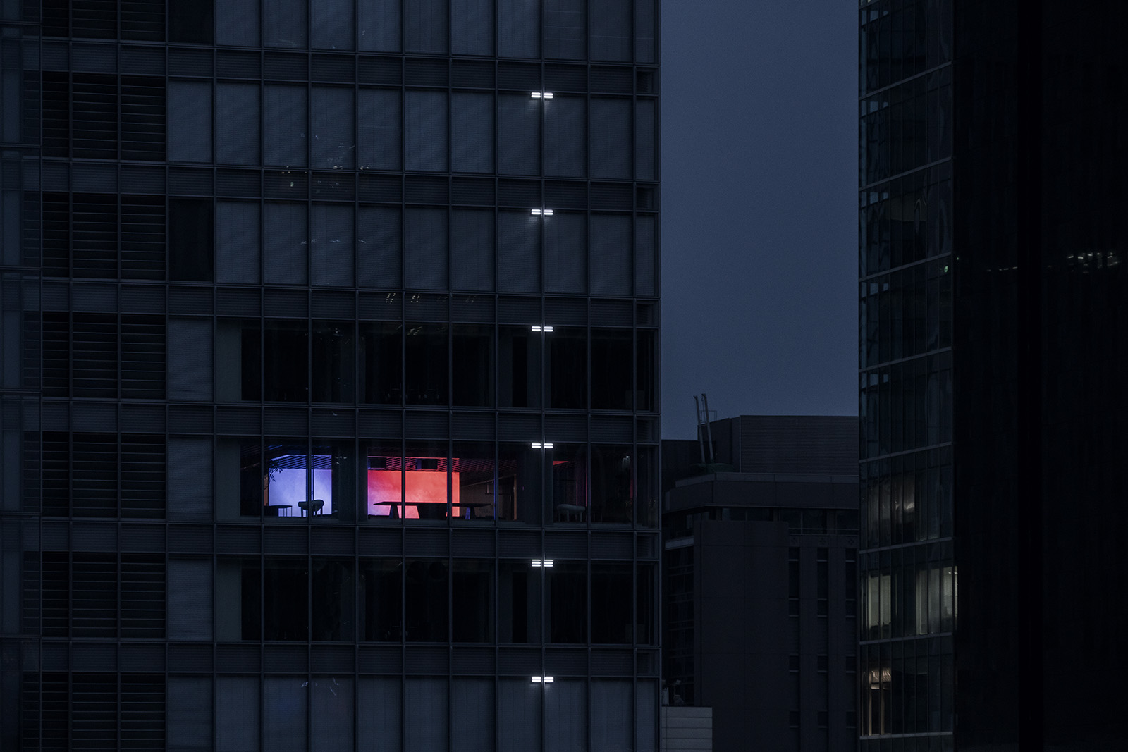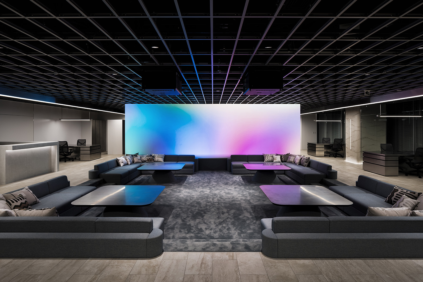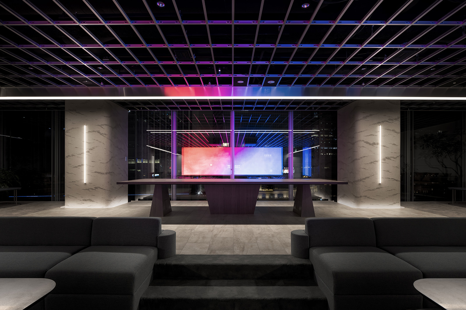 The office for Mitsui Fudosan is a new type of space designed by I IN, used by company members for various independent projects. A different office style was required for the design of the new business of the well-known Japanese company. The space had to differ from the typical office space, where the usual atmosphere would be for people to work at their desk. The point was to create an office where people can truly relax and spend their time in freedom. In essence, the feeling of being in one's own house was taken into inspiration and applied to all common spaces, such as living and dining environments. To create a place, where people can feel the future, technology that embraces everyday life has been used as a way of expressing newness. A high-resolution screen with high-output images flowing in the center of the office, emits colour-lit images throughout the whole space. By blurring the boundaries between the image and the reality, I IN aimed for an expression that symbolised the true future. In contrast to the open space, the meeting room, which is surrounded by a plastered curved wall with soft shading, is much more quiet and the design reflects its calmness. Through the glass, using characteristic colour gradation, slightly coloured light flows into the room. By rebuilding light, shape, materials and the way people spend their time at work, the whole office becomes a comfortable space, while presenting a new view of the future.