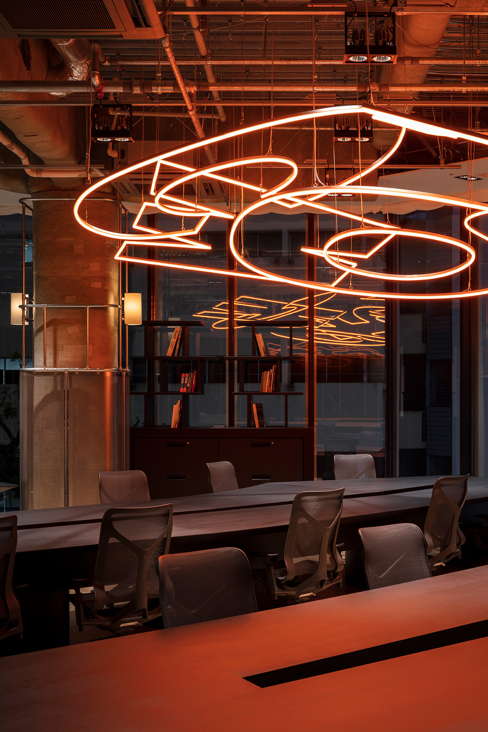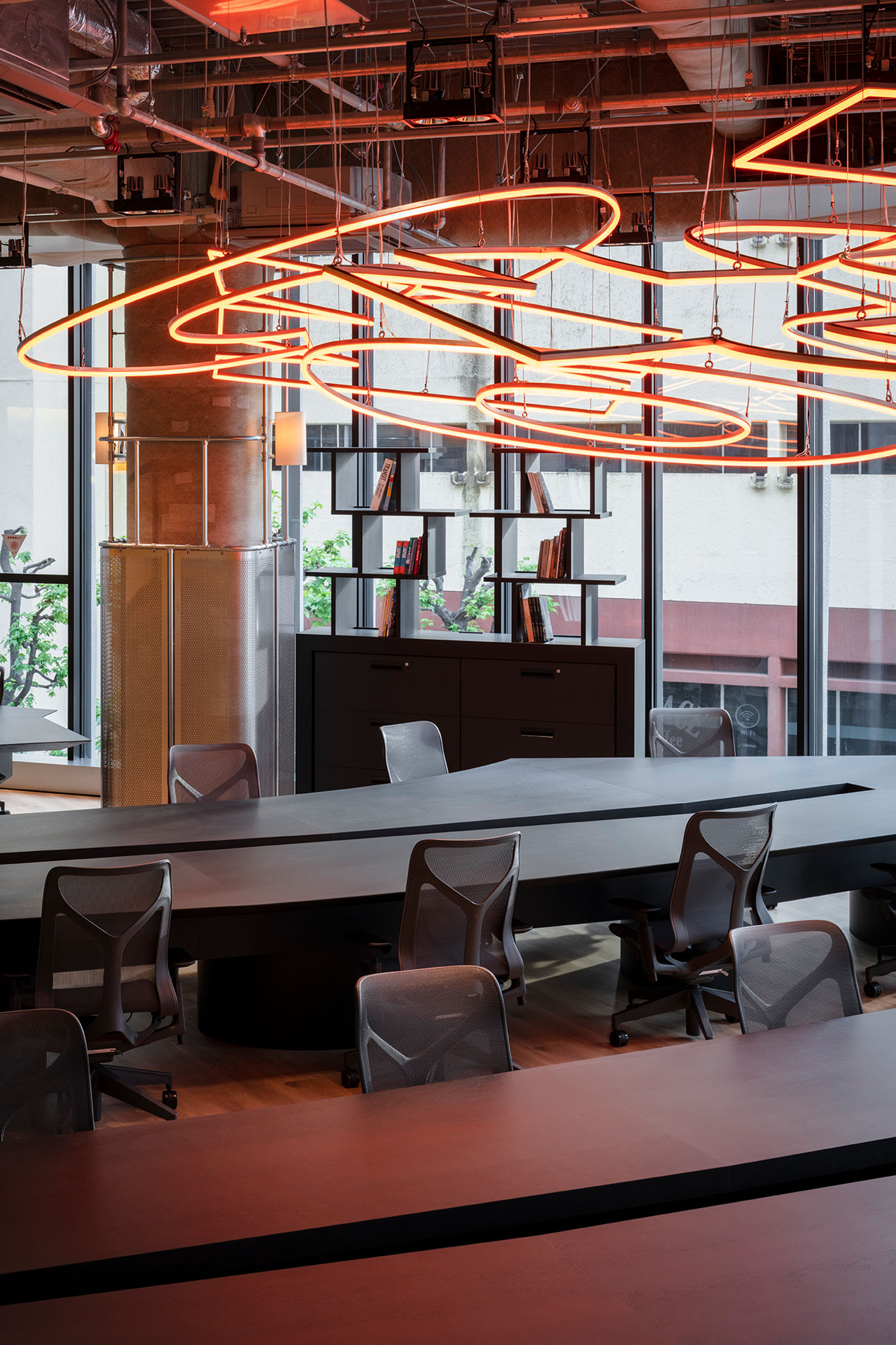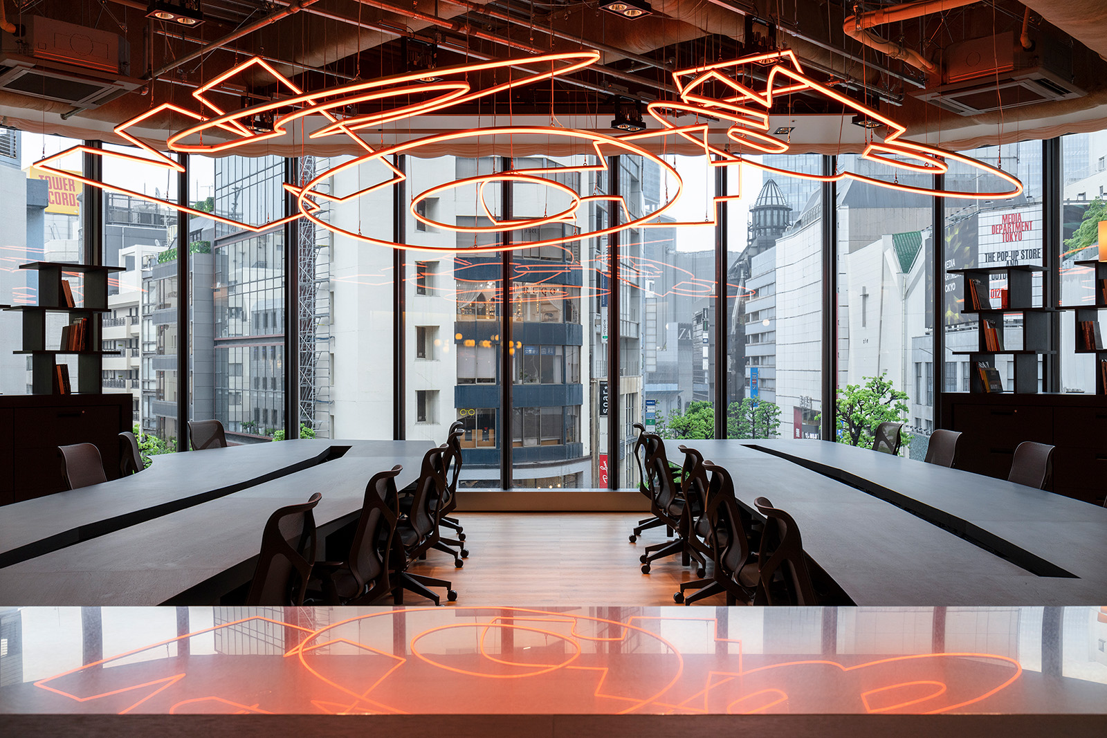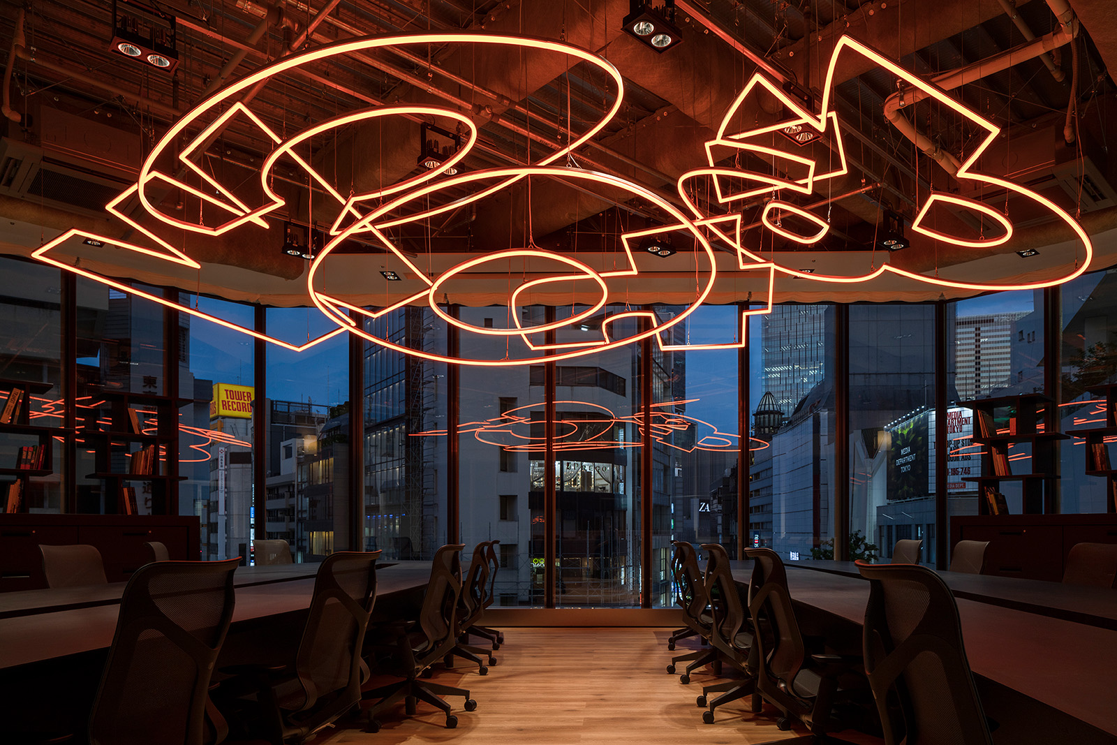 旅を通し、まだ知られていない日本の魅力を世界へ発信しているwondertrunk and co.の旗艦オフィスプロジェクト。彼らのビジネスを、未知への好奇心とつながりの創出と理解し、“旅”という体験の本質を空間に落とし込むことをオフィスデザインのコアとした。多種多様なバックグラウンドを持つ社員が働く場所のデザインとして、完成されていない、未知との出会いを楽しむことのできるオフィスのあり方を模索した。wondertrunk and co.のロゴには彼らのスピリットが込められている。その自由な形状や色彩には彼らそのものを表すエッセンスが詰まっているように感じた。多くの人々が行き交う渋谷の交差点を見上げると、オフィス空間に掲げられた自由な光のラインが目に入る。東京から世界に向けてメッセージを放つように、また、世界を行き交う人の動きを表す光にも感じる。その光のオブジェクトはオフィス空間の中央で社員のみんなを包む屋根のように存在している。大胆で自由な曲線の大テーブルには、1箇所として同じ場所は存在しない。日によって、コミュニケーションをとる相手によって、シチュエーション毎にマッチする場所を求めてオフィスを彷徨う。スキップフロアによる空間内の高低差や不思議に像を歪ませるガラスの素材感など、好奇心を刺激するしかけによって、人や空気に動きをもたらすオフィスデザインとなった。