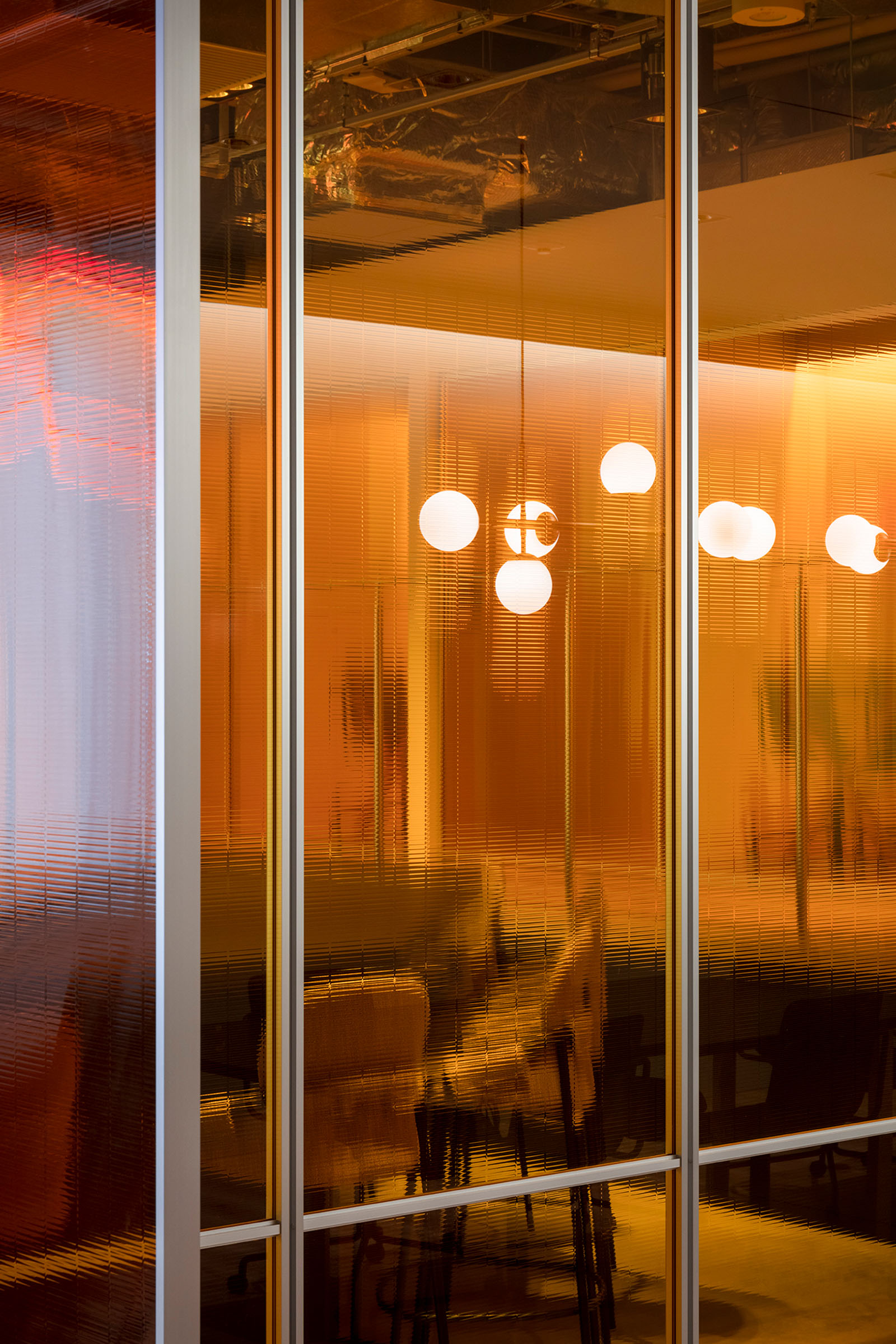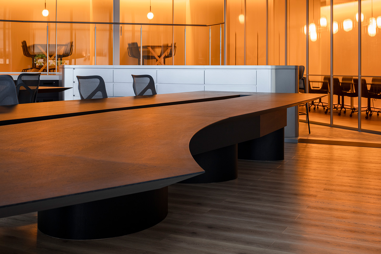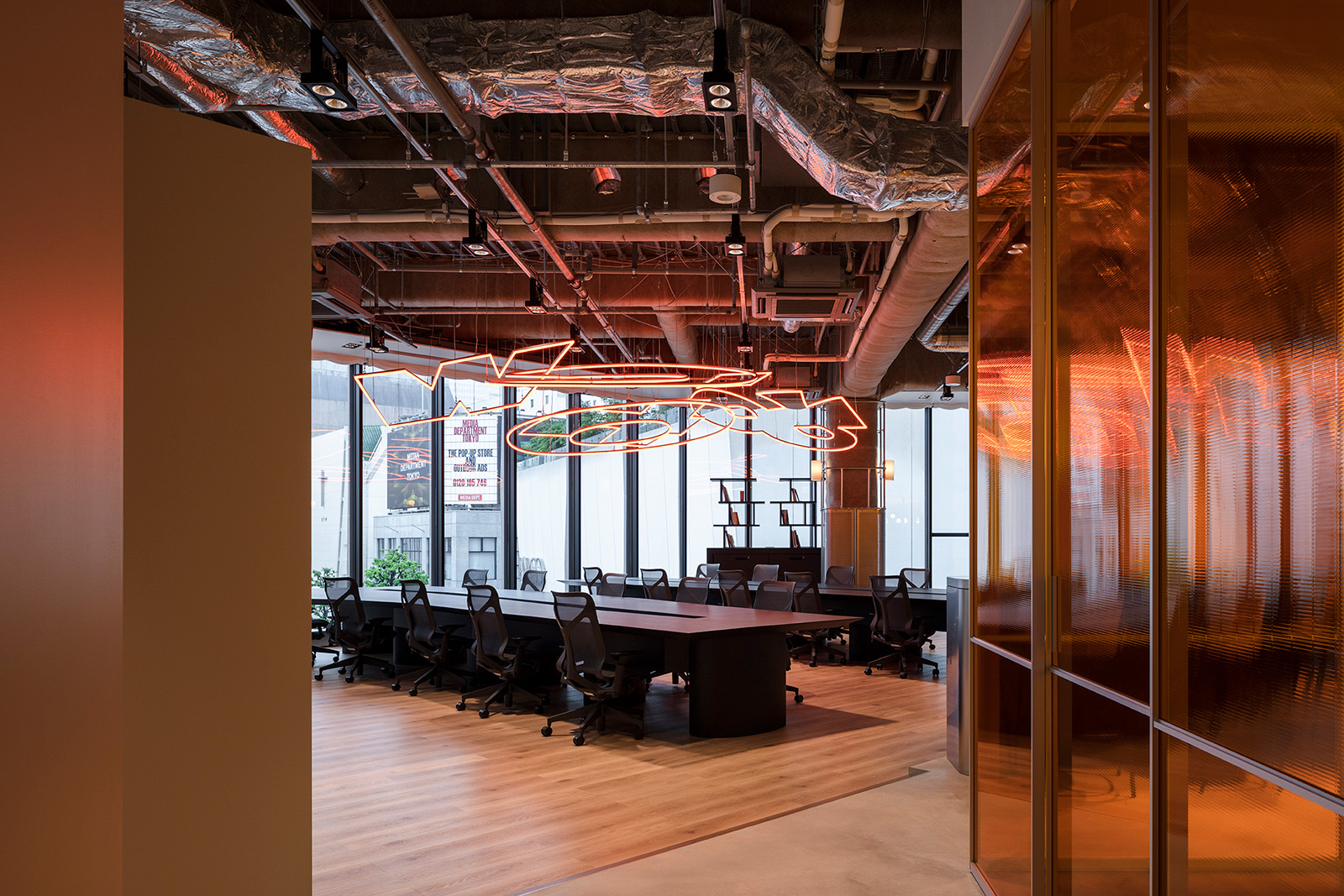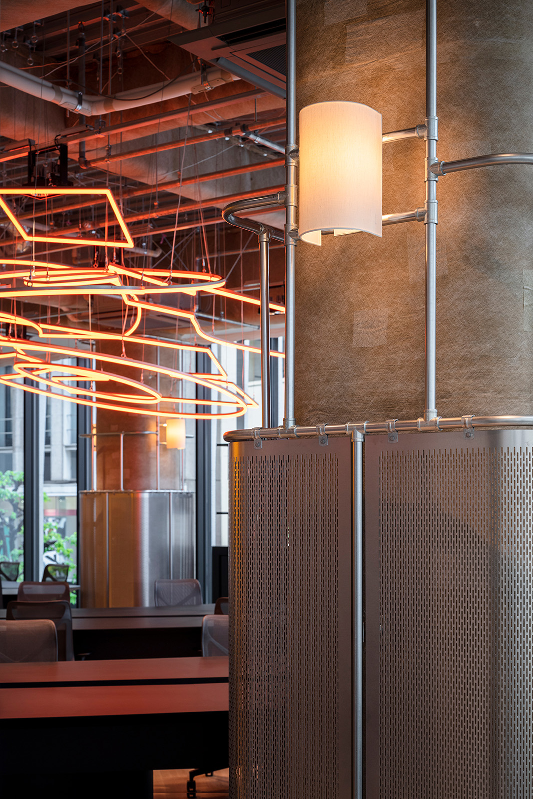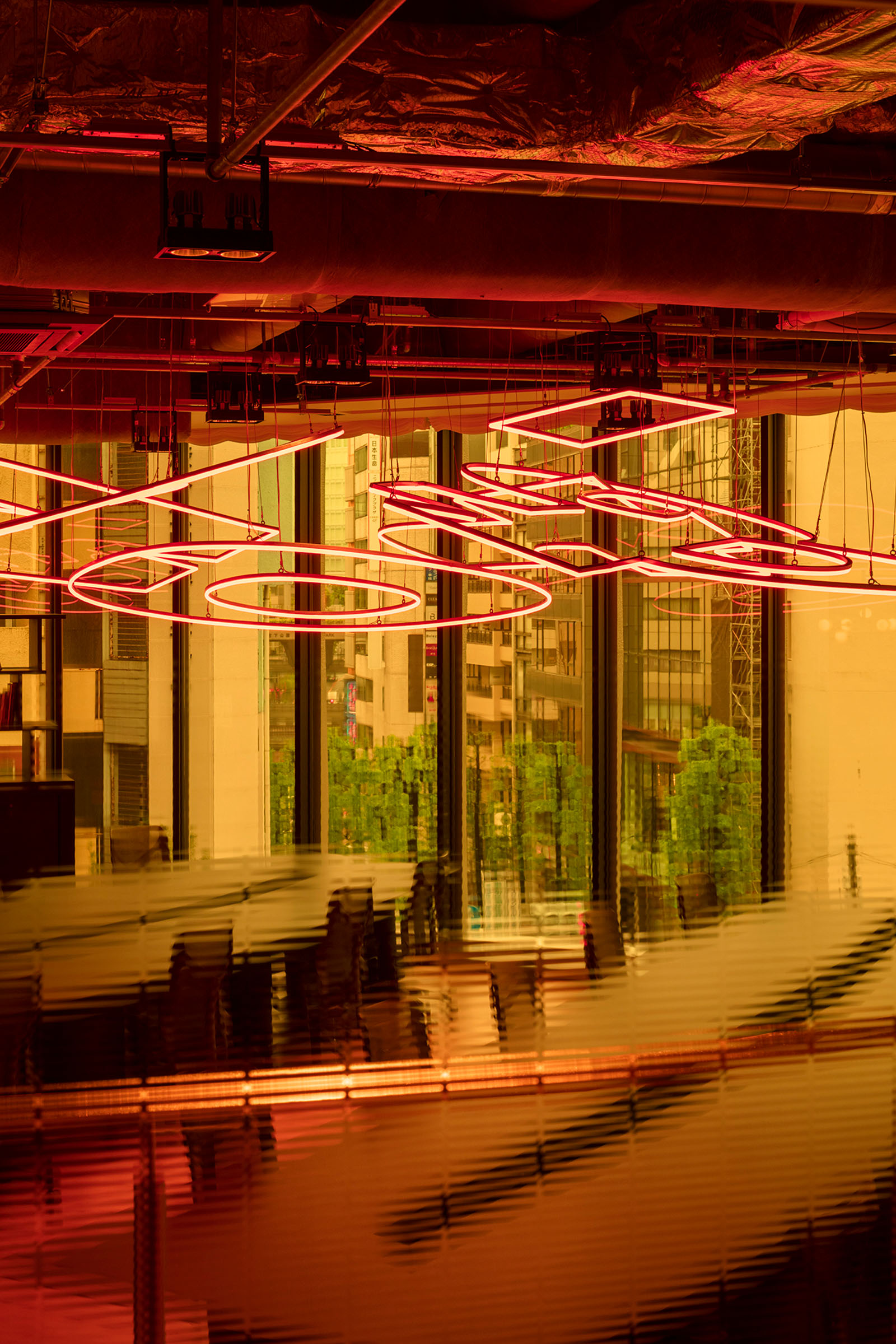 旅を通し、まだ知られていない日本の魅力を世界へ発信しているwondertrunk and co.の旗艦オフィスプロジェクト。彼らのビジネスを、未知への好奇心とつながりの創出と理解し、“旅”という体験の本質を空間に落とし込むことをオフィスデザインのコアとした。多種多様なバックグラウンドを持つ社員が働く場所のデザインとして、完成されていない、未知との出会いを楽しむことのできるオフィスのあり方を模索した。wondertrunk and co.のロゴには彼らのスピリットが込められている。その自由な形状や色彩には彼らそのものを表すエッセンスが詰まっているように感じた。多くの人々が行き交う渋谷の交差点を見上げると、オフィス空間に掲げられた自由な光のラインが目に入る。東京から世界に向けてメッセージを放つように、また、世界を行き交う人の動きを表す光にも感じる。その光のオブジェクトはオフィス空間の中央で社員のみんなを包む屋根のように存在している。大胆で自由な曲線の大テーブルには、1箇所として同じ場所は存在しない。日によって、コミュニケーションをとる相手によって、シチュエーション毎にマッチする場所を求めてオフィスを彷徨う。スキップフロアによる空間内の高低差や不思議に像を歪ませるガラスの素材感など、好奇心を刺激するしかけによって、人や空気に動きをもたらすオフィスデザインとなった。