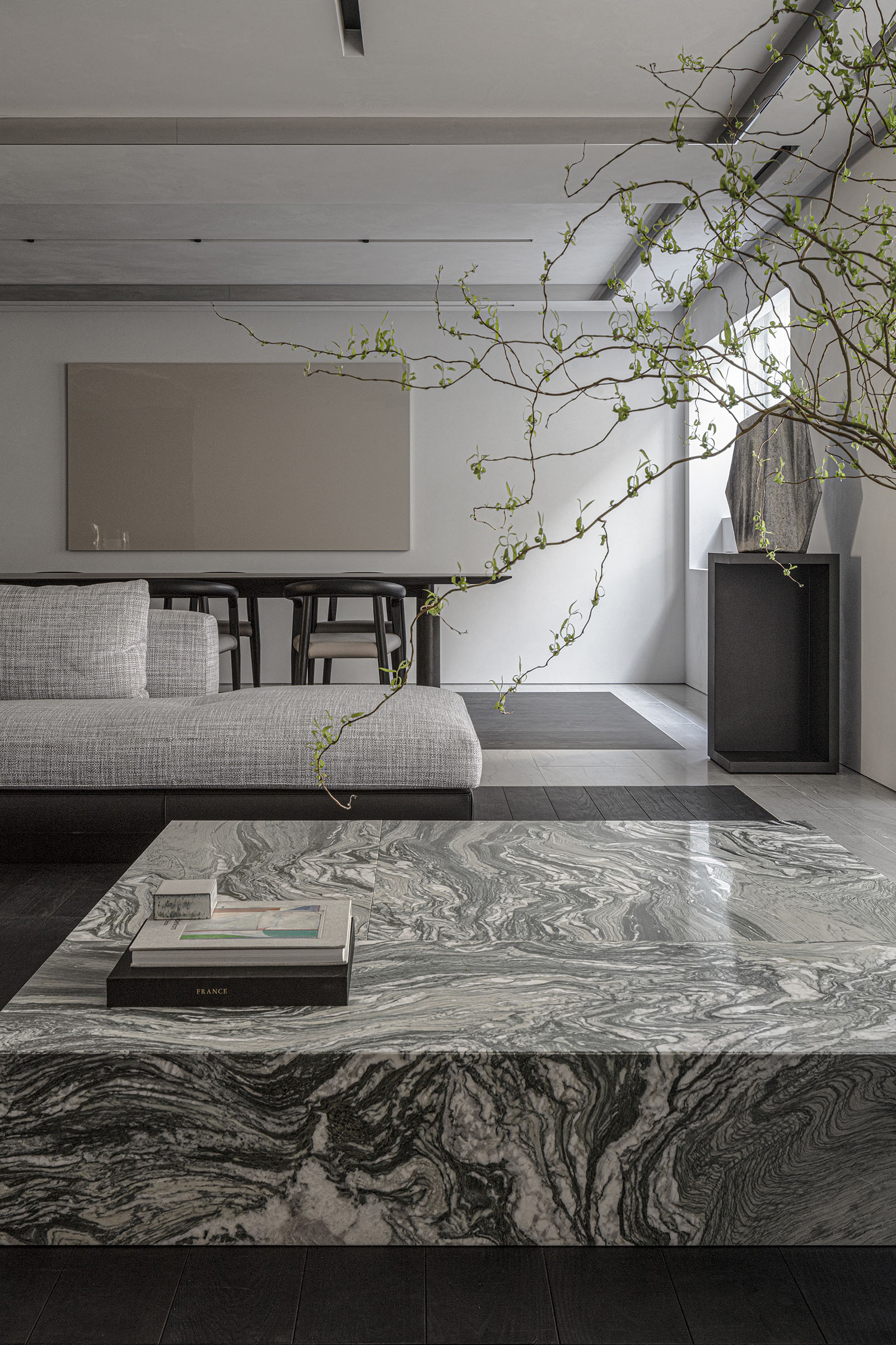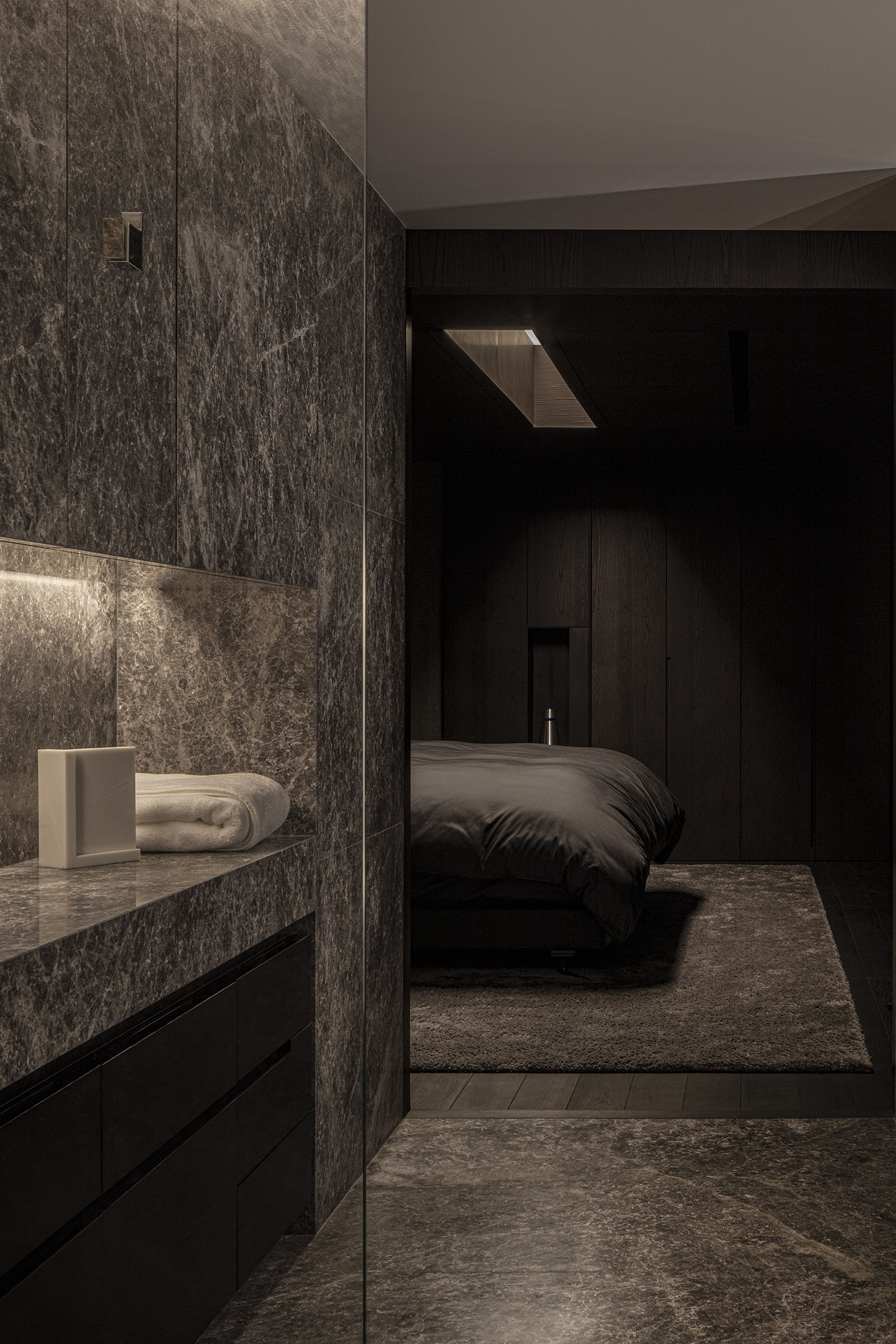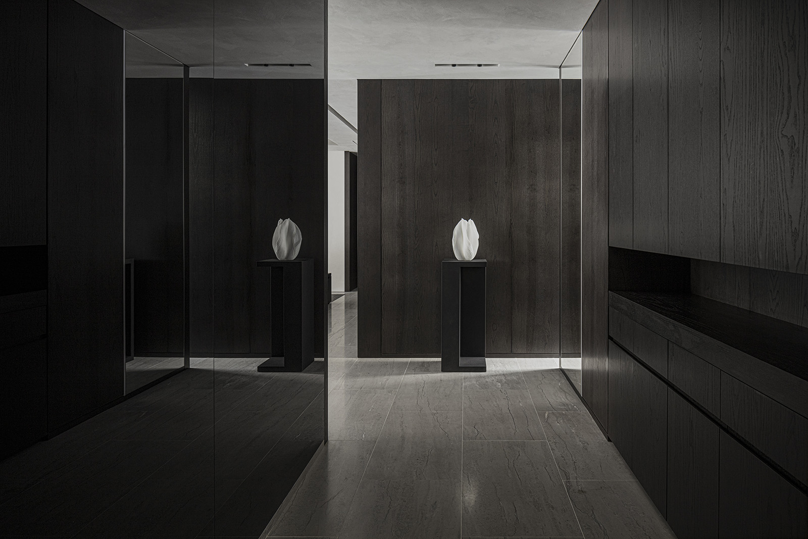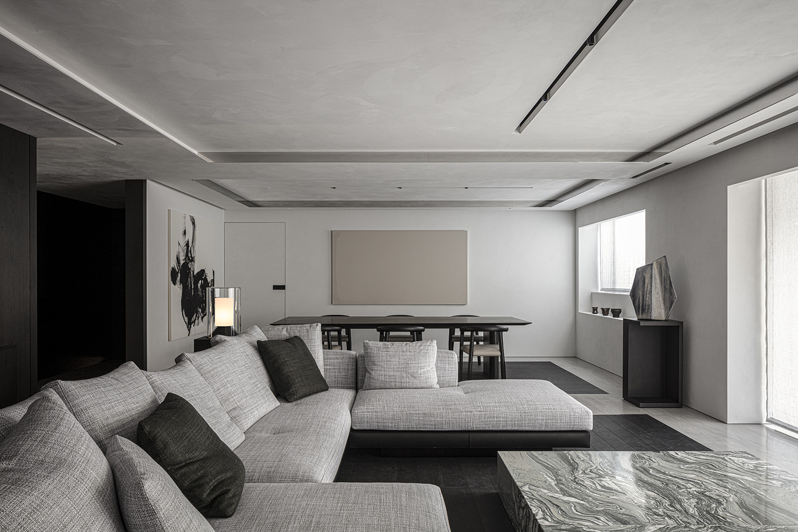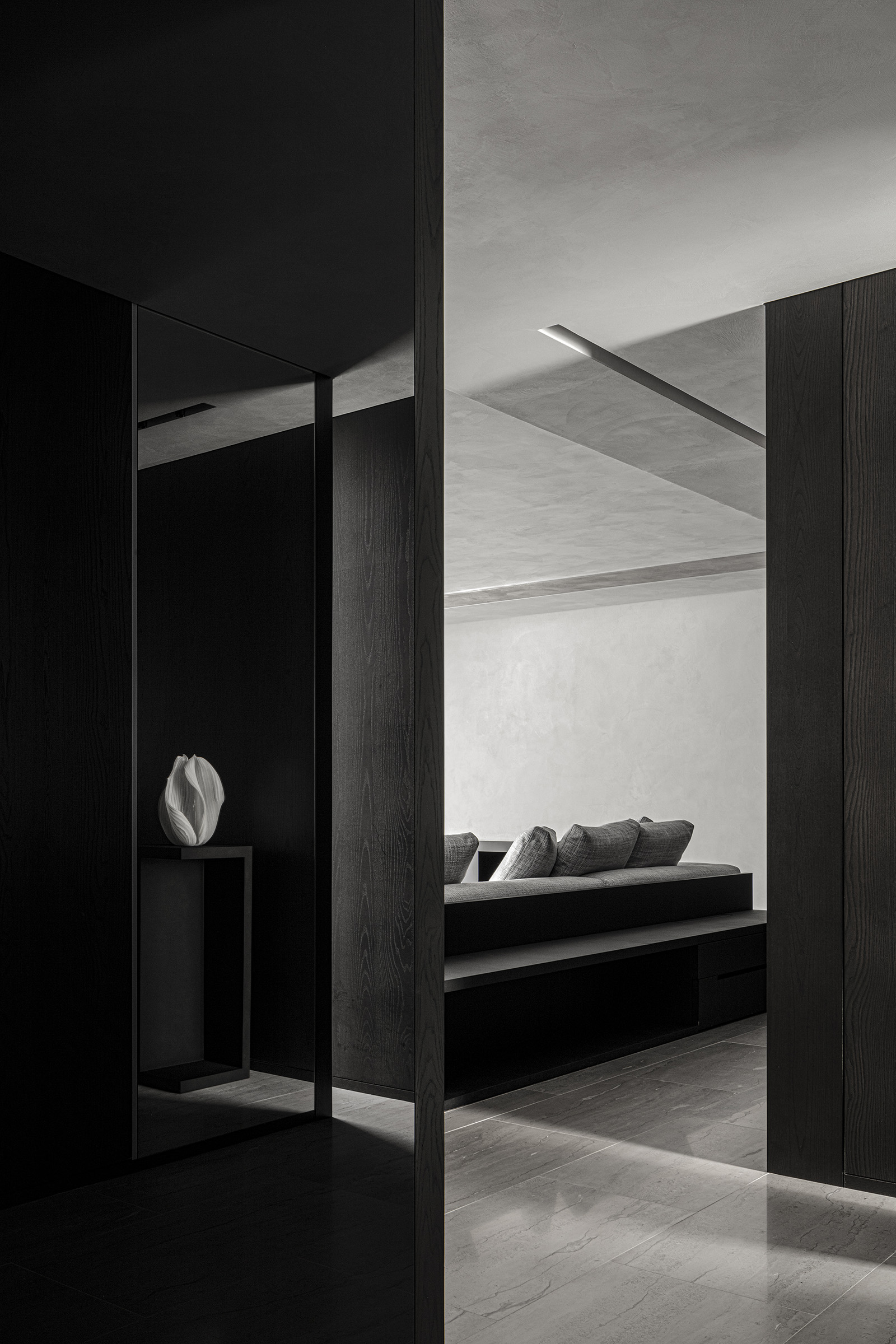 The only request for this private residential interior was to create a purely monochrome world. To bring out the most of the limited palette, I IN focused on achieving a sense of boundless richness with a design of refined materials and textures: fine wood grain, subtle and bold expressions of marble, pearlescent textured plaster and exquisite metal finishes. Each of these monochrome materials respond and transform in light. In this way, they resonate with one another to bring an extraordinary depth to the space. Spatial form, structures and visual flow are meticulously designed and functional. The density, volume and tactile nature of furniture, fittings and objects, combined with their visual transitions in fluctuating light, create an immersive sensory experience. There is a flow from public to private spaces, as the living and dining room colors shift to more prominent use of dark tones in the study and the bedroom. Bespoke furniture, lighting and artworks complete the design that invariably “captures” and utilizes light to evoke an intrinsic luxury.
