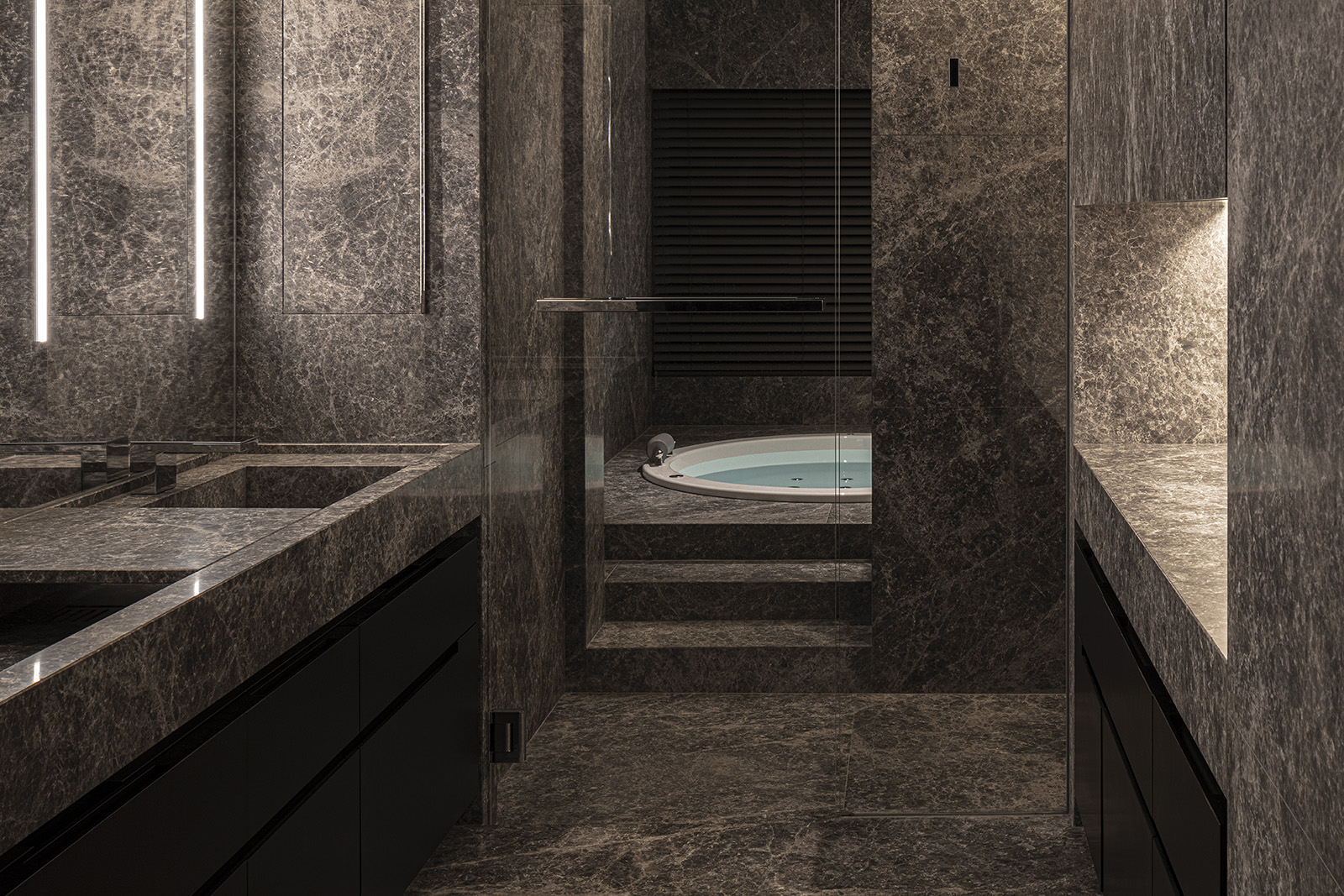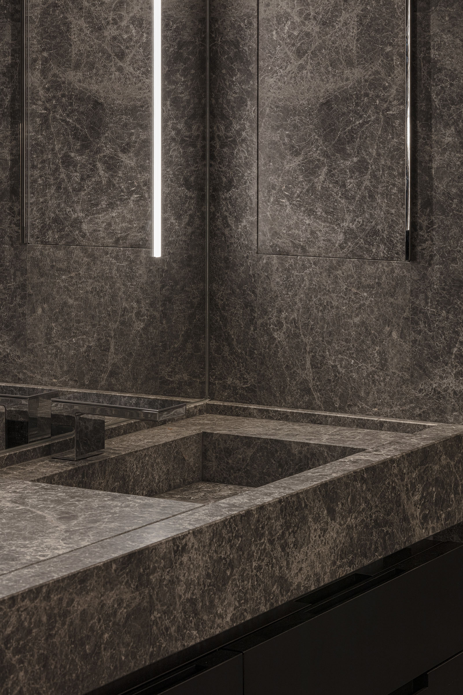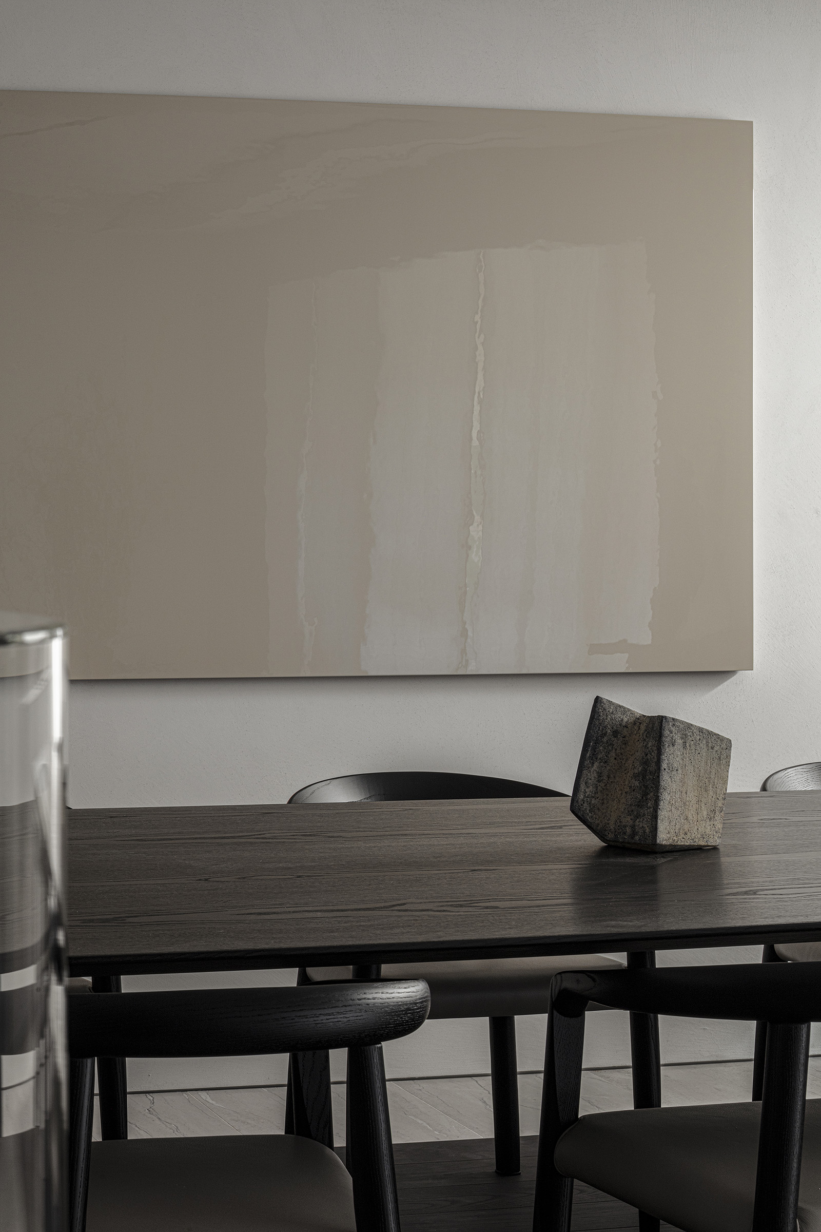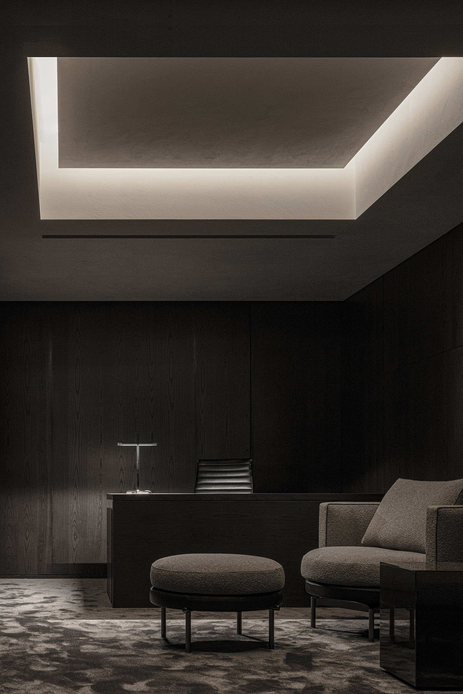 The only request for this private residential interior was to create a purely monochrome world. To bring out the most of the limited palette, I IN focused on achieving a sense of boundless richness with a design of refined materials and textures: fine wood grain, subtle and bold expressions of marble, pearlescent textured plaster and exquisite metal finishes. Each of these monochrome materials respond and transform in light. In this way, they resonate with one another to bring an extraordinary depth to the space. Spatial form, structures and visual flow are meticulously designed and functional. The density, volume and tactile nature of furniture, fittings and objects, combined with their visual transitions in fluctuating light, create an immersive sensory experience. There is a flow from public to private spaces, as the living and dining room colors shift to more prominent use of dark tones in the study and the bedroom. Bespoke furniture, lighting and artworks complete the design that invariably “captures” and utilizes light to evoke an intrinsic luxury.