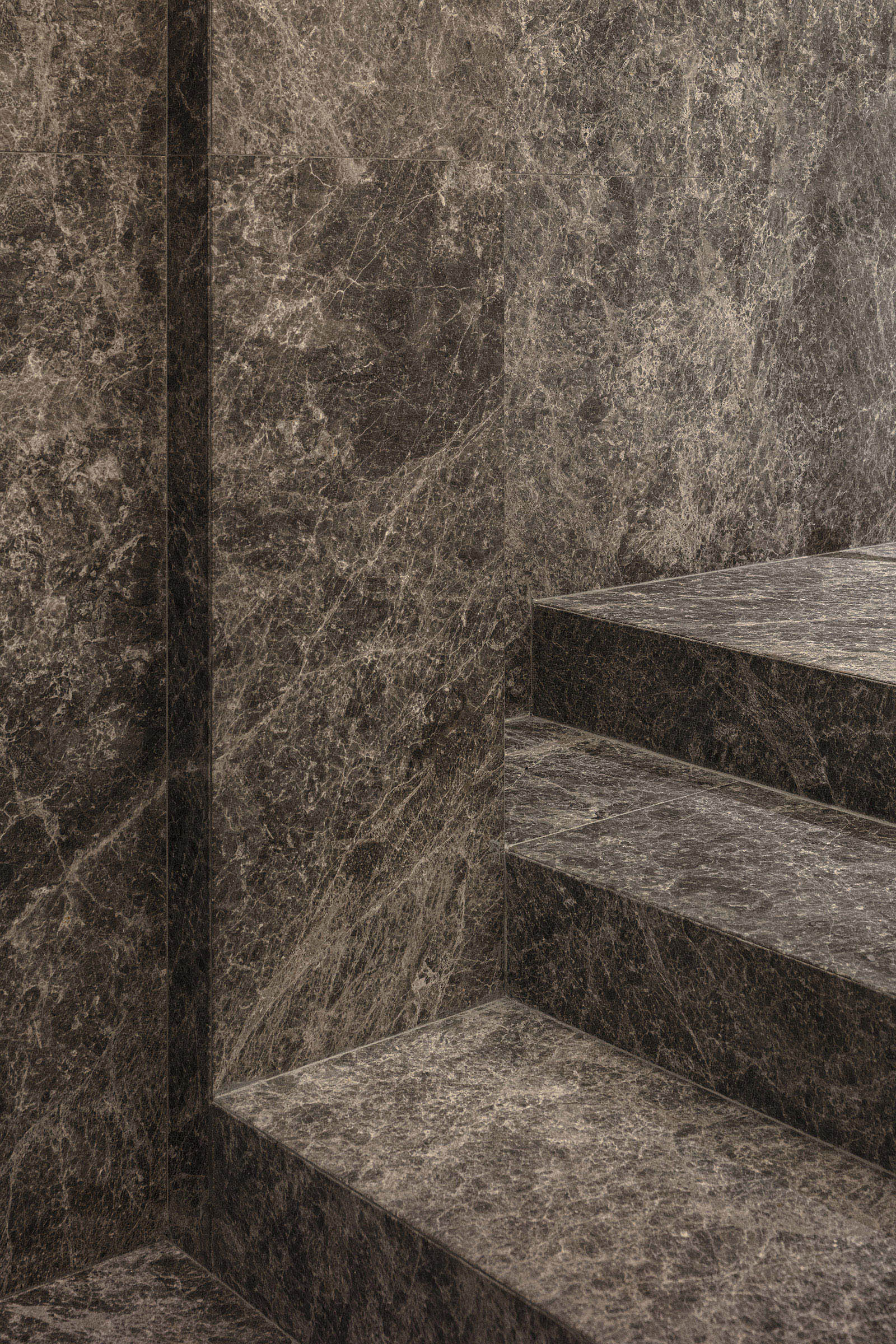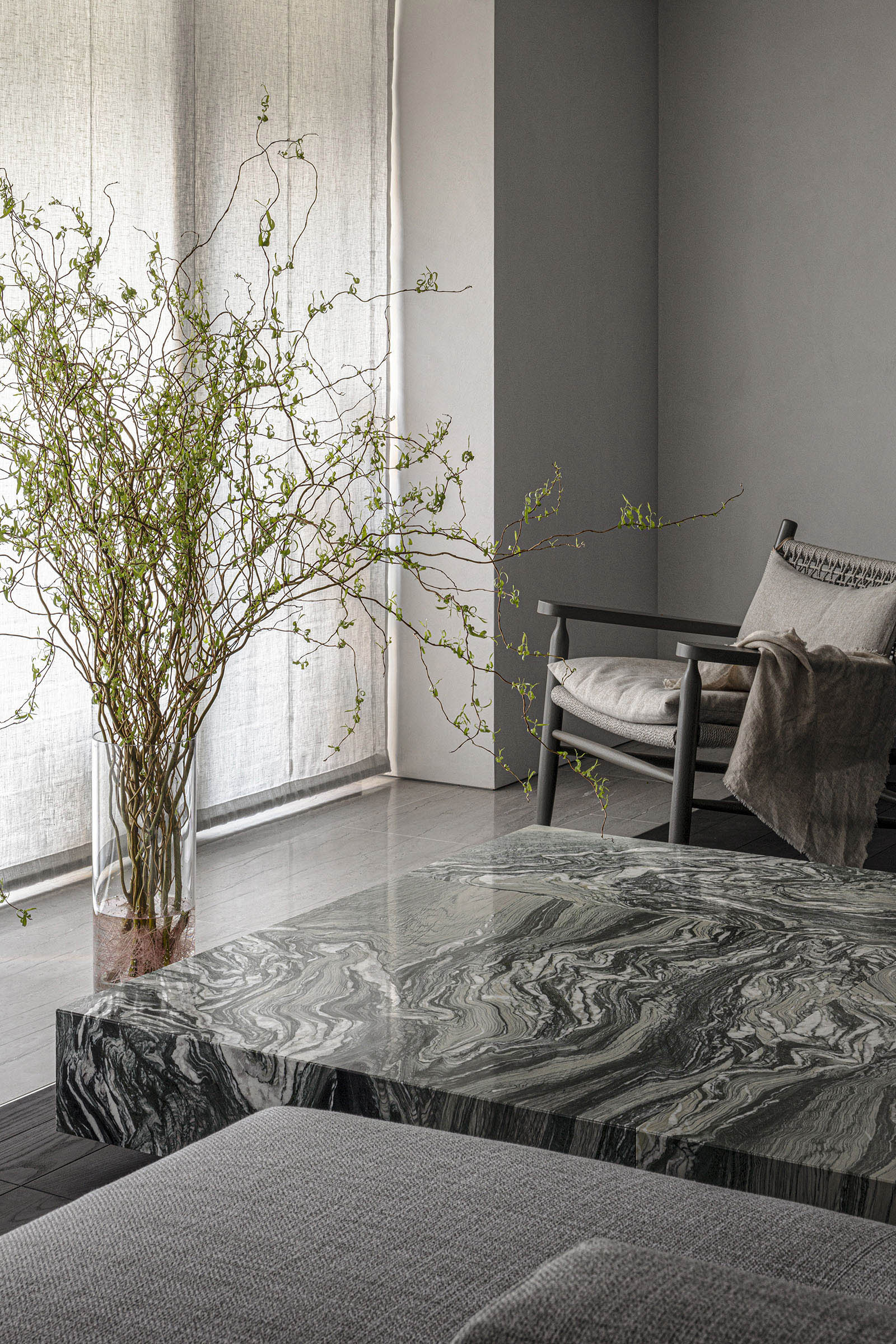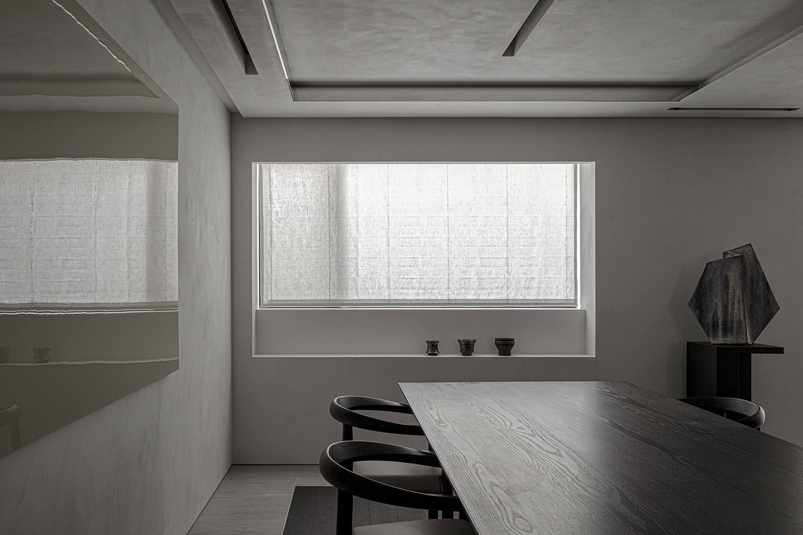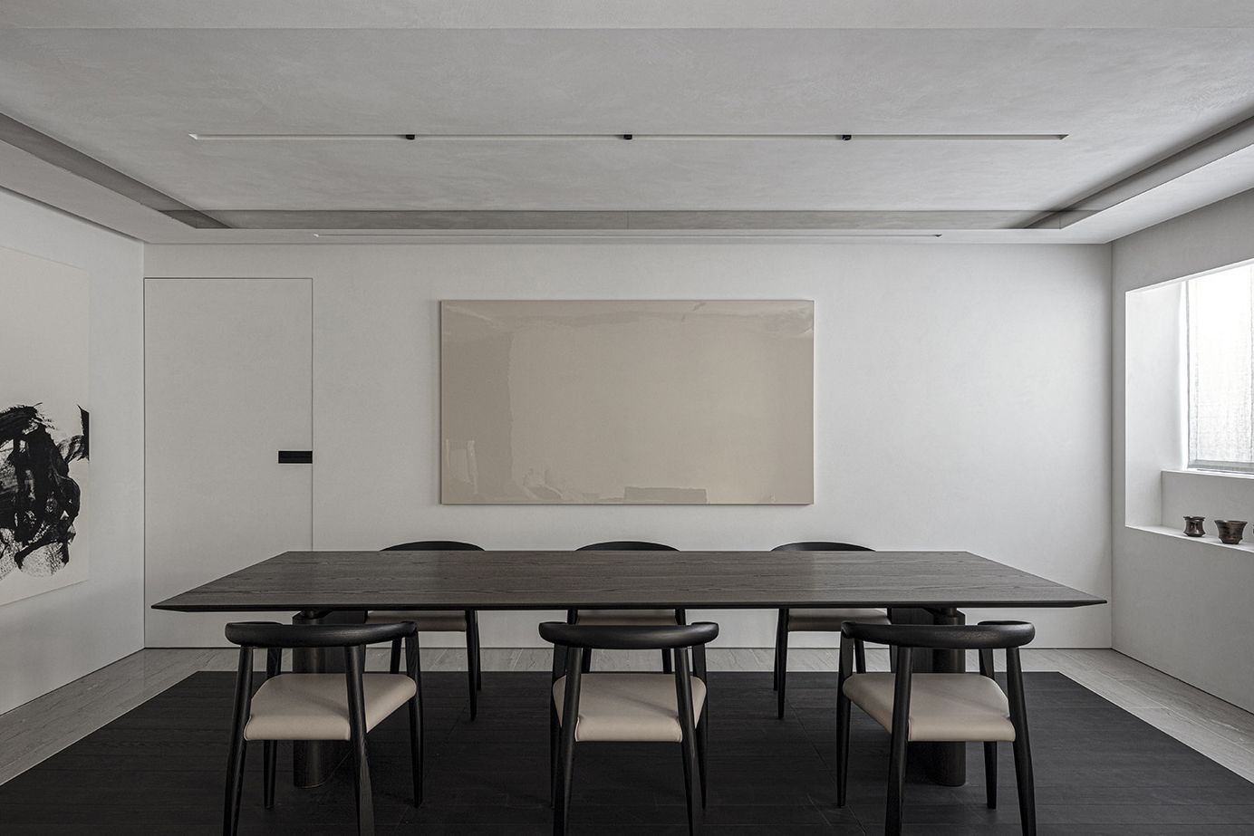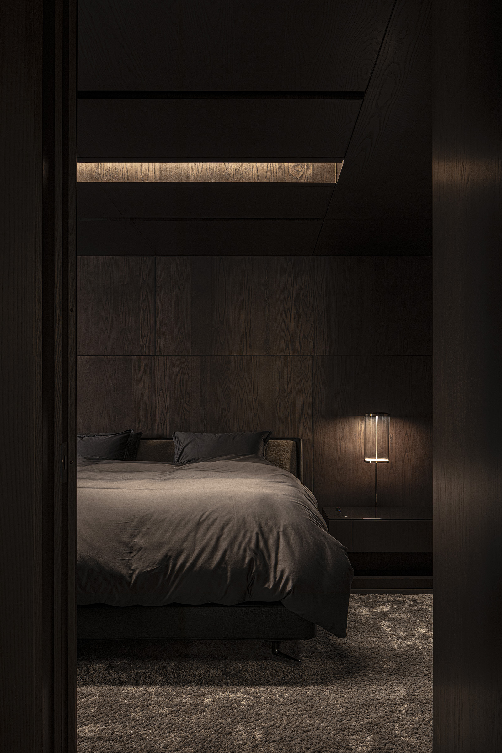The only request for this private residential interior was to create a purely monochrome world. To bring out the most of the limited palette, I IN focused on achieving a sense of boundless richness with a design of refined materials and textures: fine wood grain, subtle and bold expressions of marble, pearlescent textured plaster and exquisite metal finishes. Each of these monochrome materials respond and transform in light. In this way, they resonate with one another to bring an extraordinary depth to the space. Spatial form, structures and visual flow are meticulously designed and functional. The density, volume and tactile nature of furniture, fittings and objects, combined with their visual transitions in fluctuating light, create an immersive sensory experience. There is a flow from public to private spaces, as the living and dining room colors shift to more prominent use of dark tones in the study and the bedroom. Bespoke furniture, lighting and artworks complete the design that invariably “captures” and utilizes light to evoke an intrinsic luxury.