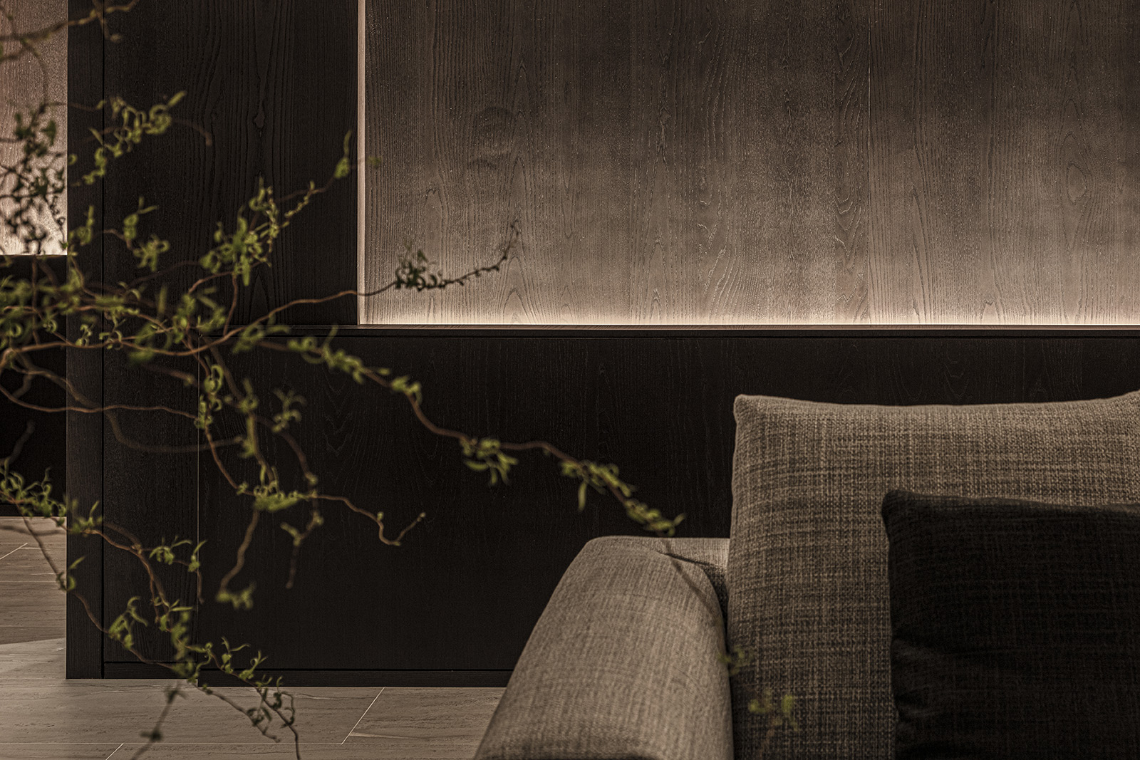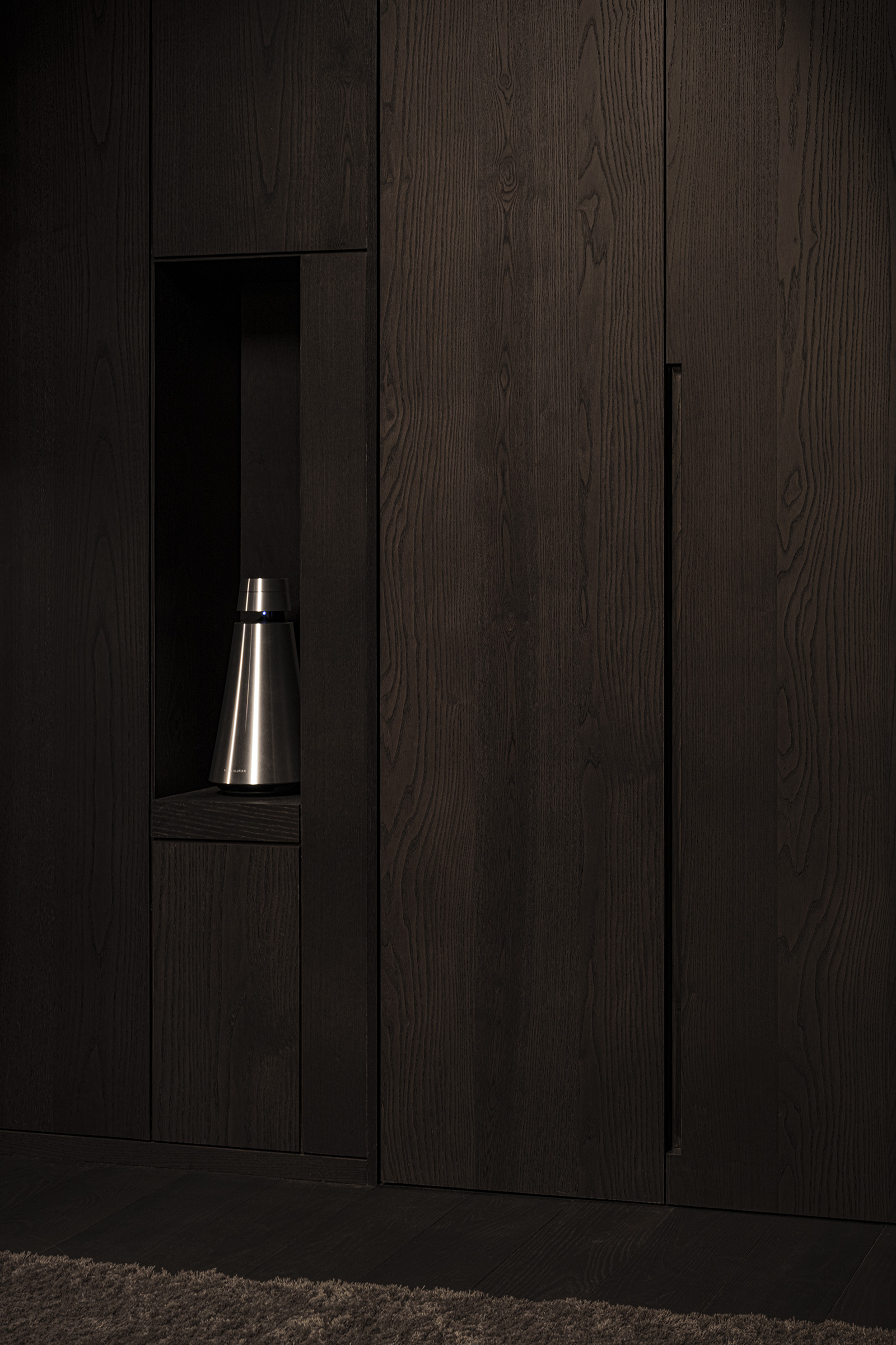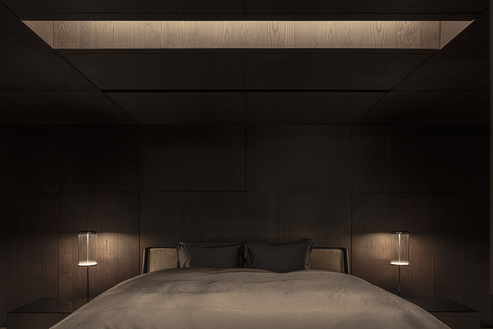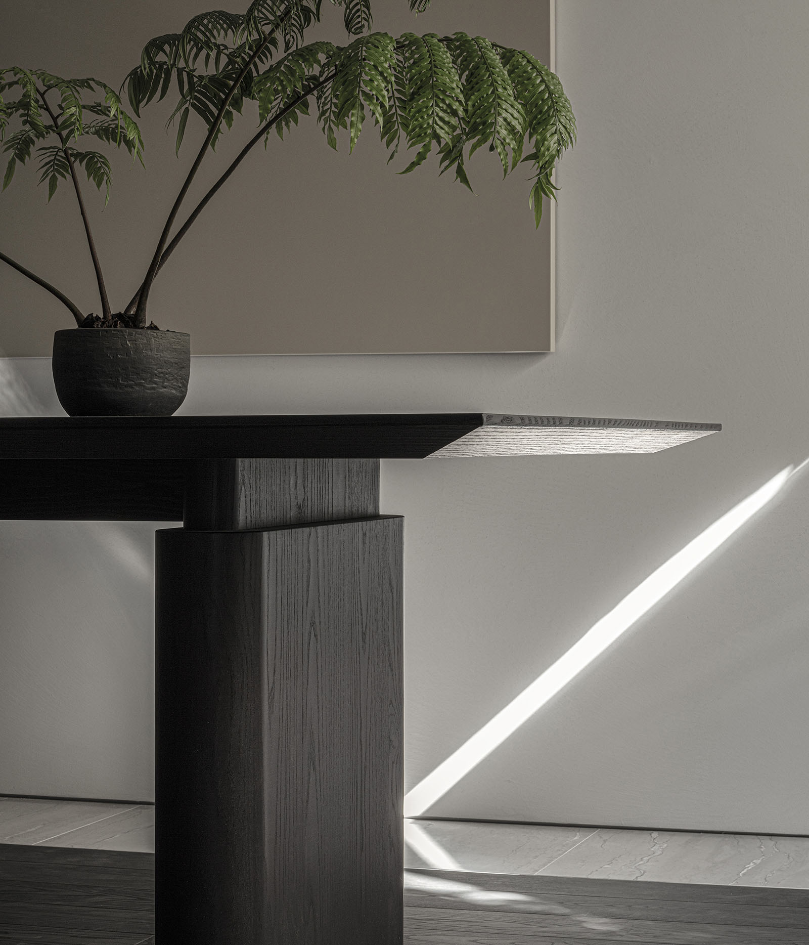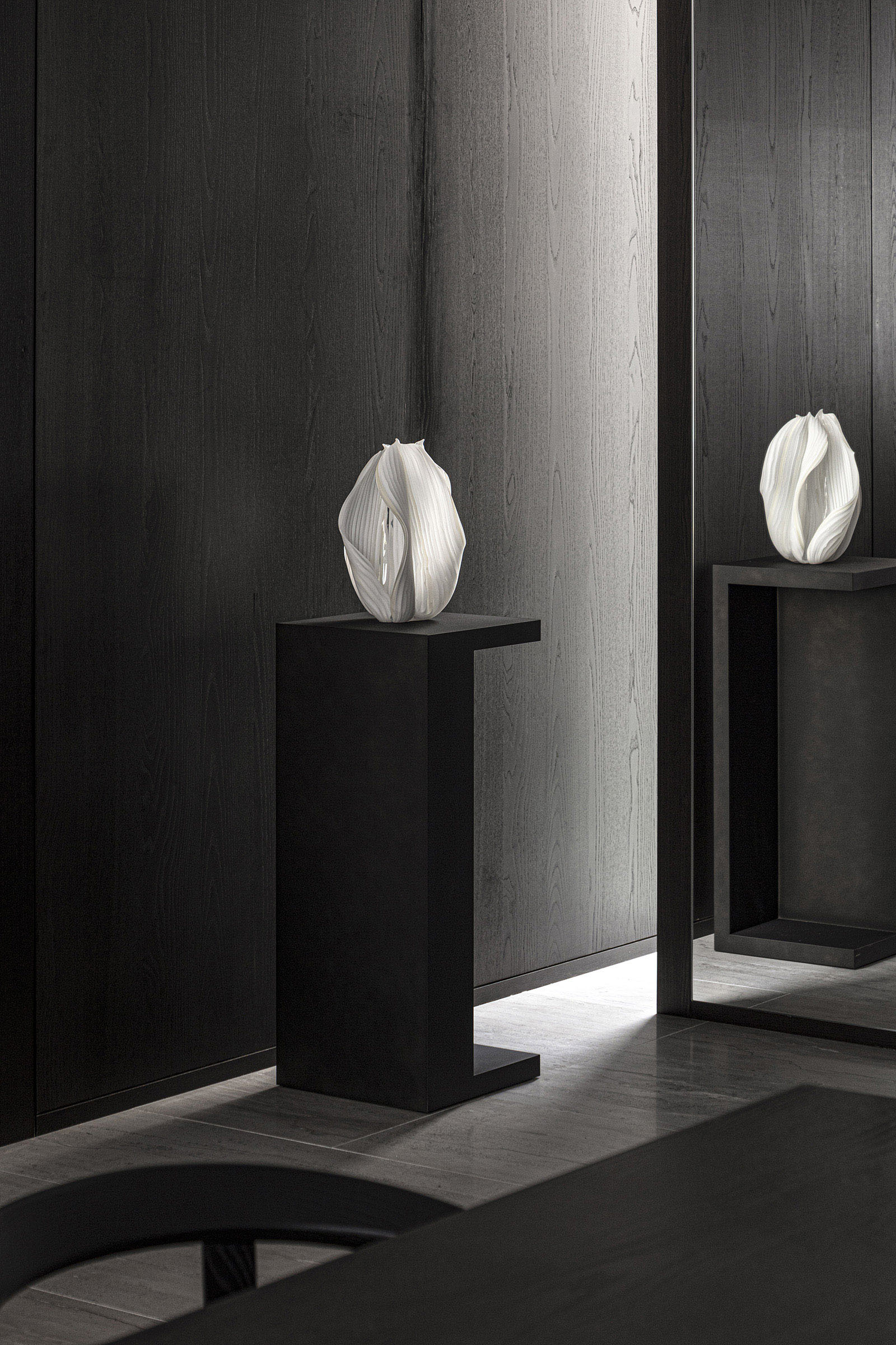 The only request for this private residential interior was to create a purely monochrome world. To bring out the most of the limited palette, I IN focused on achieving a sense of boundless richness with a design of refined materials and textures: fine wood grain, subtle and bold expressions of marble, pearlescent textured plaster and exquisite metal finishes. Each of these monochrome materials respond and transform in light. In this way, they resonate with one another to bring an extraordinary depth to the space. Spatial form, structures and visual flow are meticulously designed and functional. The density, volume and tactile nature of furniture, fittings and objects, combined with their visual transitions in fluctuating light, create an immersive sensory experience. There is a flow from public to private spaces, as the living and dining room colors shift to more prominent use of dark tones in the study and the bedroom. Bespoke furniture, lighting and artworks complete the design that invariably “captures” and utilizes light to evoke an intrinsic luxury.
